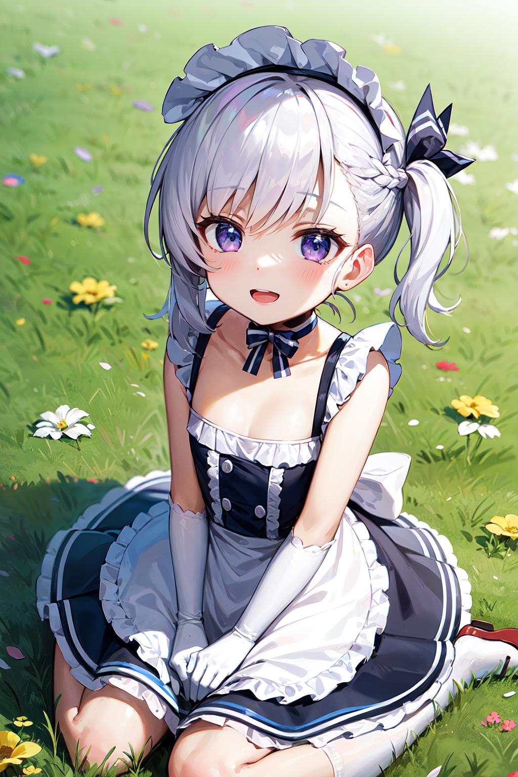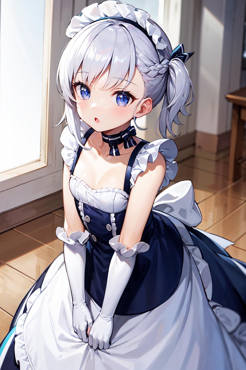 outfit2bbbelfast, aged down, small breasts, maid headdress, blue choker, blue ribbon, frills, maid, sleeveless, white apron, waist apron, white gloves, elbow gloves