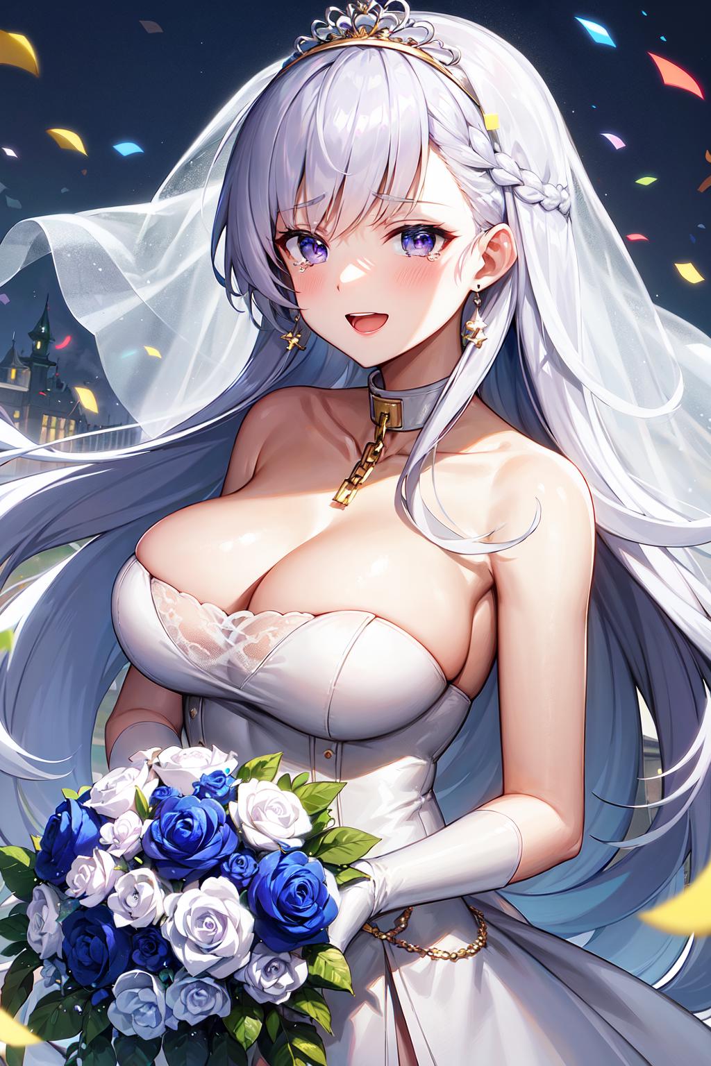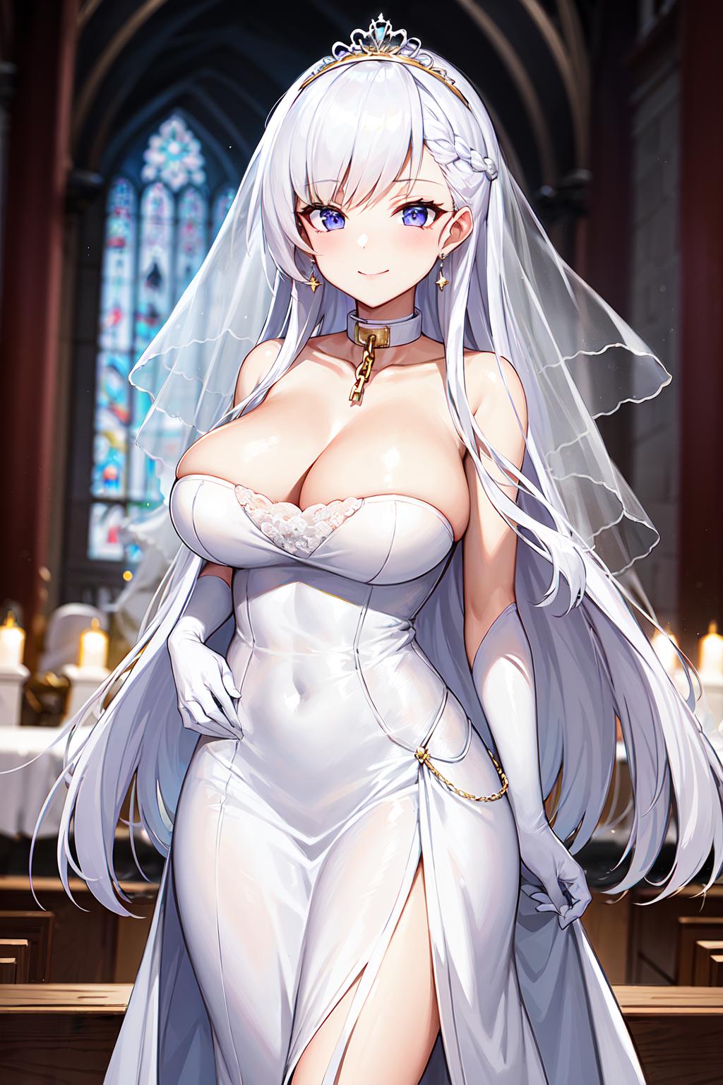 outfit3aabelfast, long hair, french braid, tiara, bridal veil, earrings, metal collar, gold chain, cleavage, collarbone, bare shoulders, strapless, wedding dress, white dress, white gloves