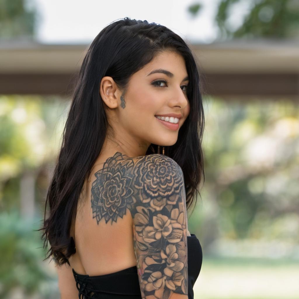 A LoRA for Gina Valentina. Photos of varying levels of tattoos were used to train, so you can specify which you want.
