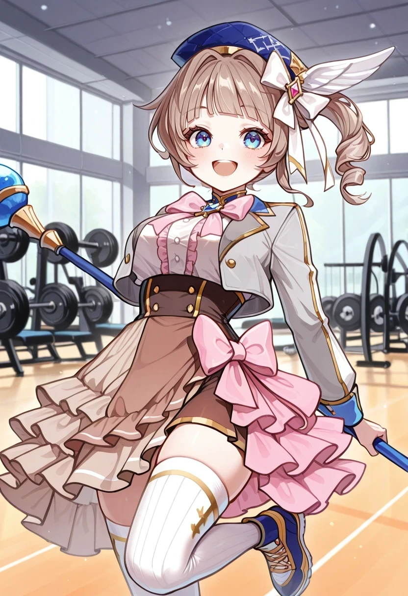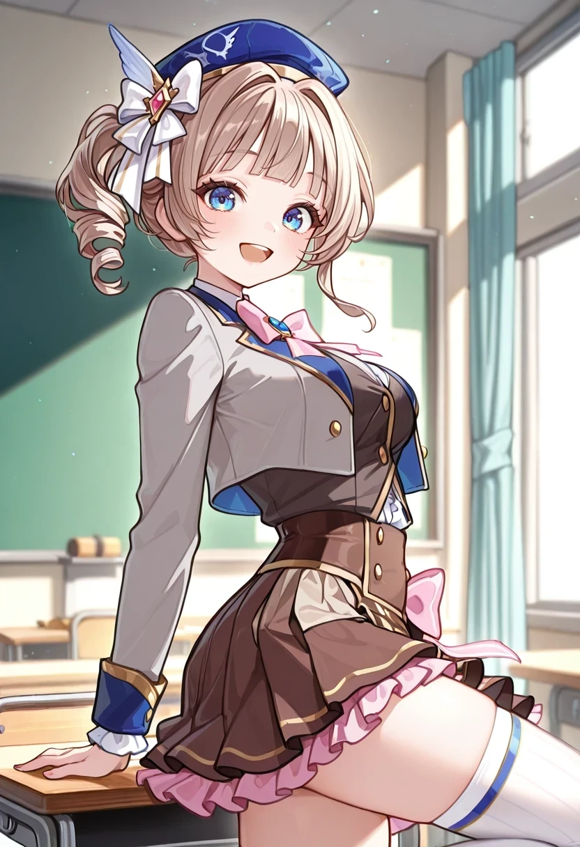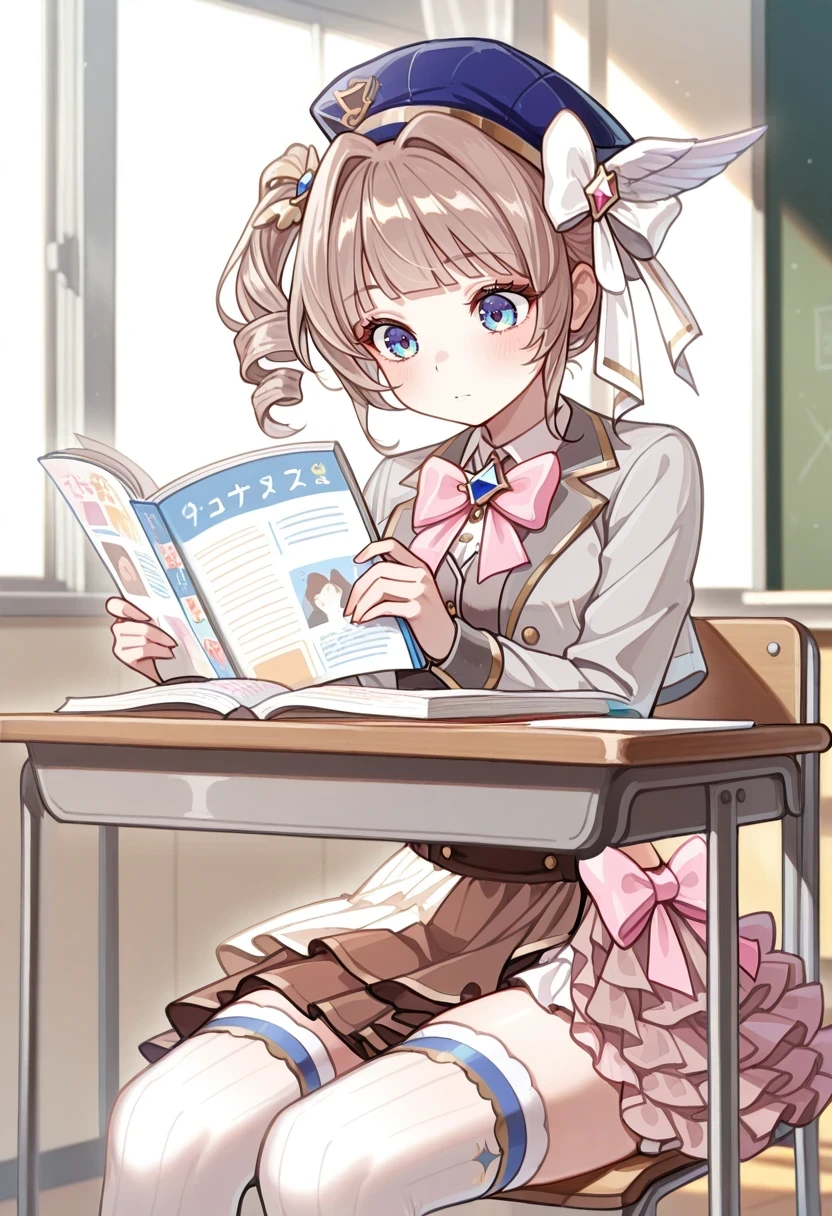 blue headwear,white ribbon,side drill,pink bow,cropped jacket,grey jacket,white thighhighs,brown skirt,pink frills,half-skirt,
