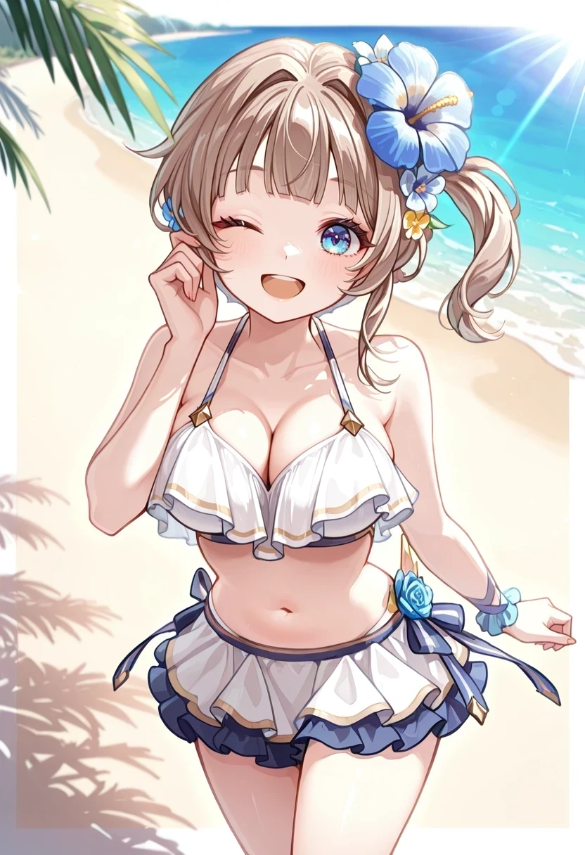 white bikini,bikini skirt,side ponytail,hair flower,Idol1: