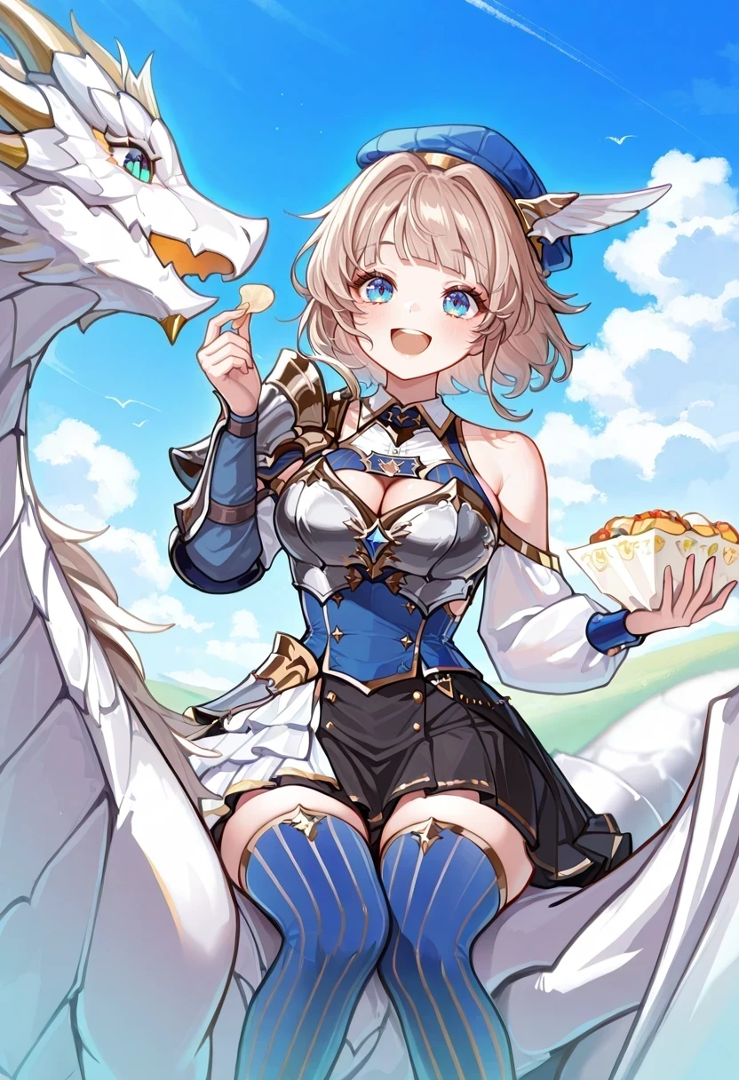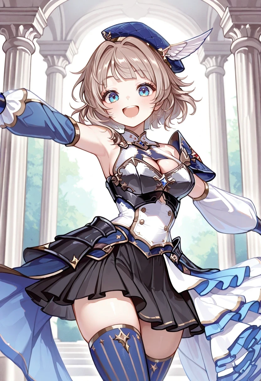 blue headwear,breastplate,cleavage cutout,white half-skirt,black skirt,single bare shoulder,detached sleeves,vertical-striped thighhighs,blue thighhighs,Uniform:
