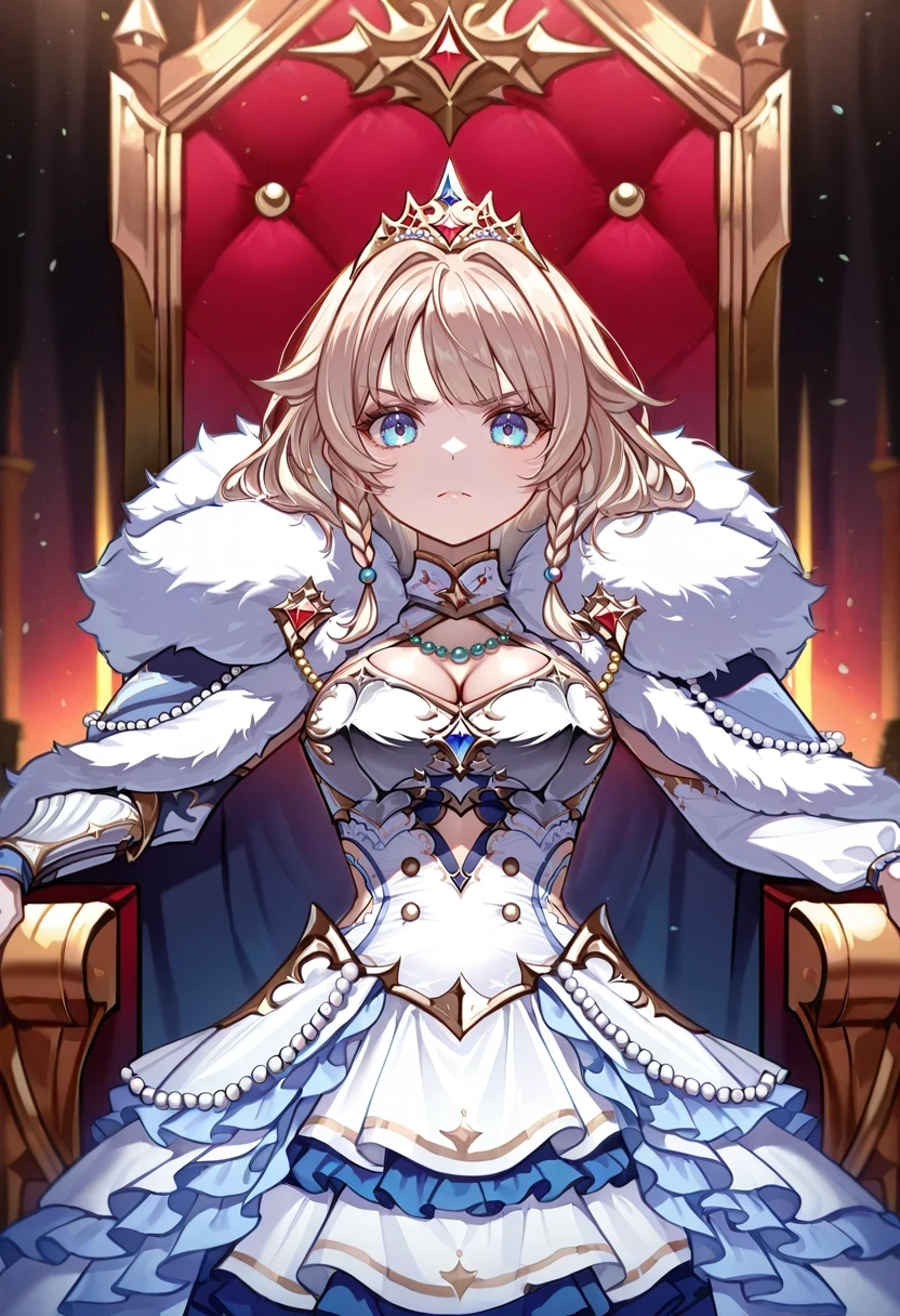 hair flaps,breastplate,cleavage cutout,fur-trimmed cloak,tiara,braided sidelock,beads,detached sleeves,white dress,cutout above navel,layered dress,frilled dress,