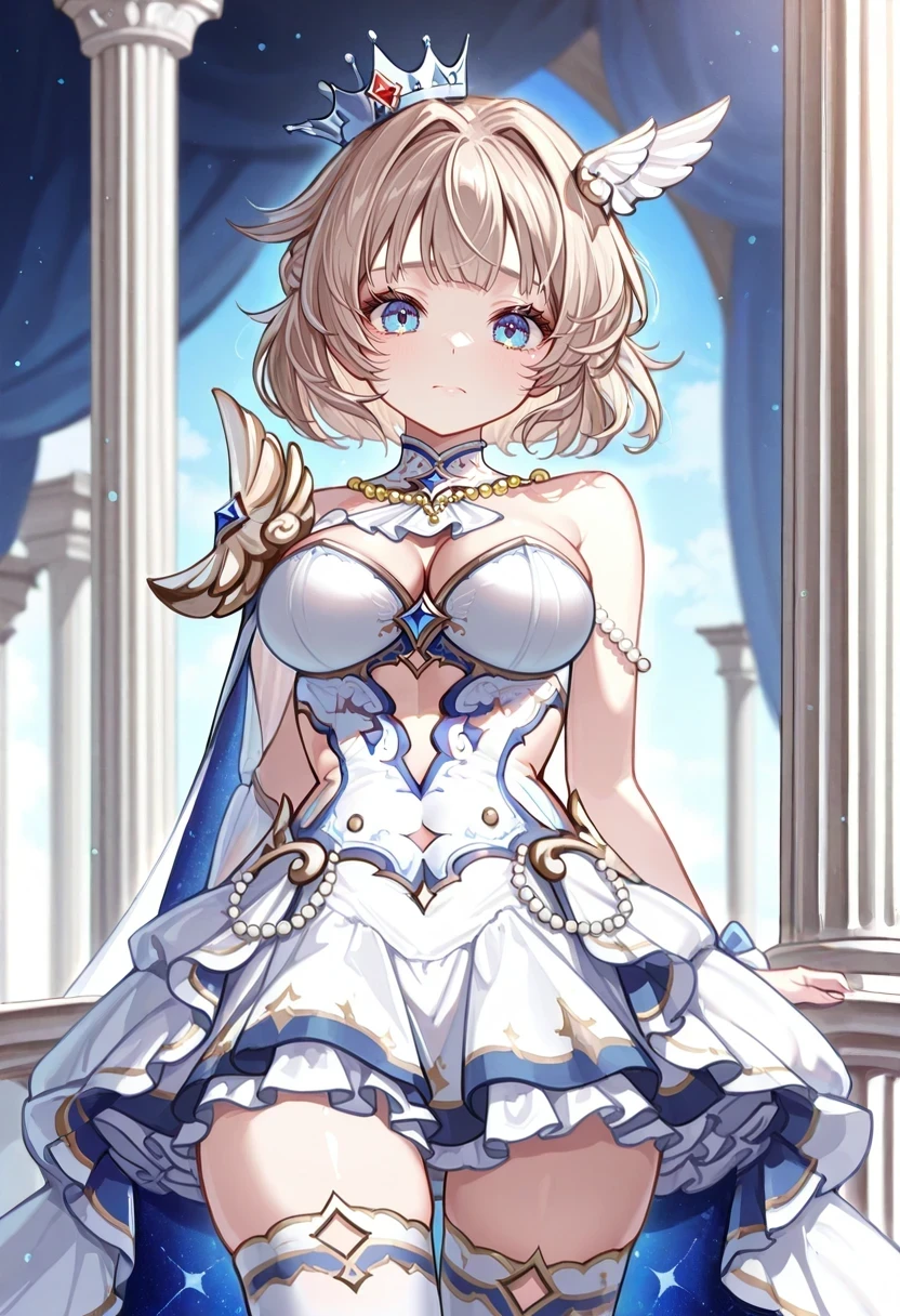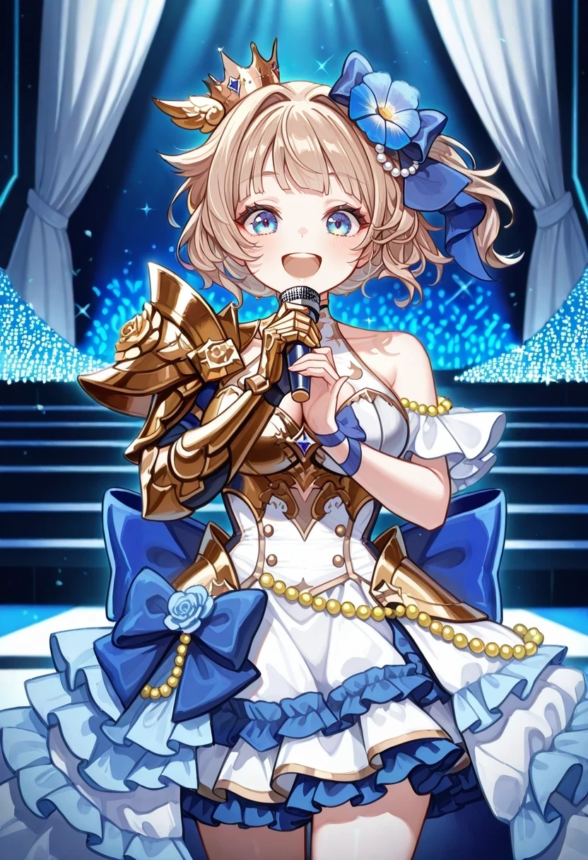 collarbone,shoulder armor,gold armor,single bare shoulder,cleavage cutout,mini crown,hair flower,hair bow,blue bow,beads,white dress,frilled dress,overskirt,