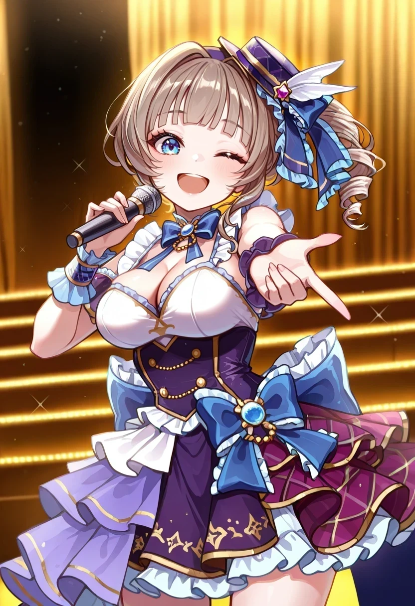 side drill,mini hat,frilled ribbon,blue bow,frilled straps,cleavage,idol clothes,Idol2: