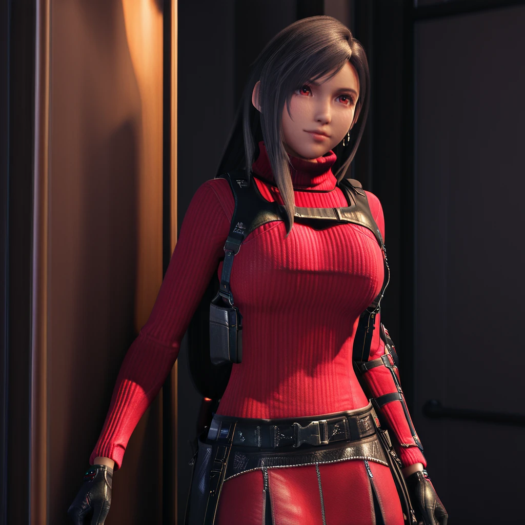 Trigger with sweater: TifaFF7RemakeSweater, 1girl, long hair, jewelry, earrings, black gloves, tifa lockhart, black hair, red eyes, medium breasts, red ribbed sweater, shoulder holster, belt, dress, turtleneck, lips, long sleeves, cowboy shot, 3d