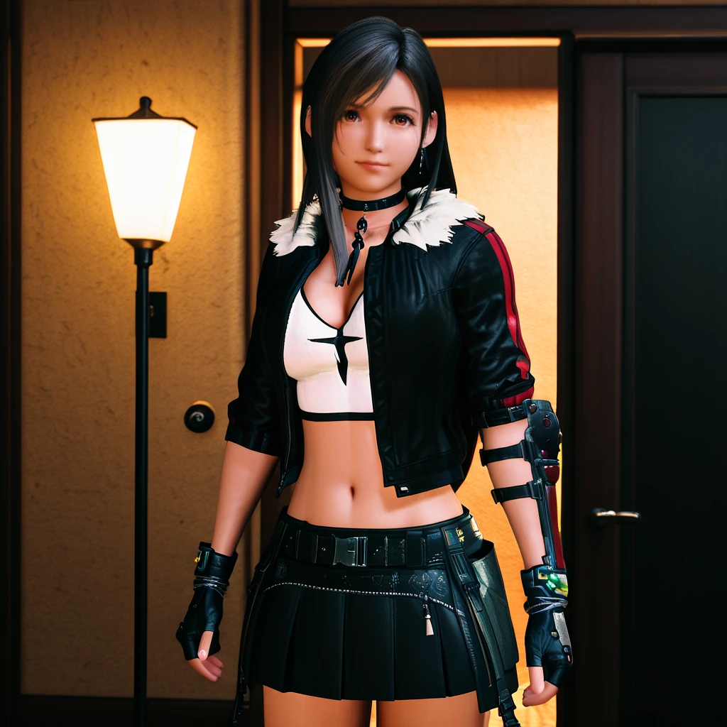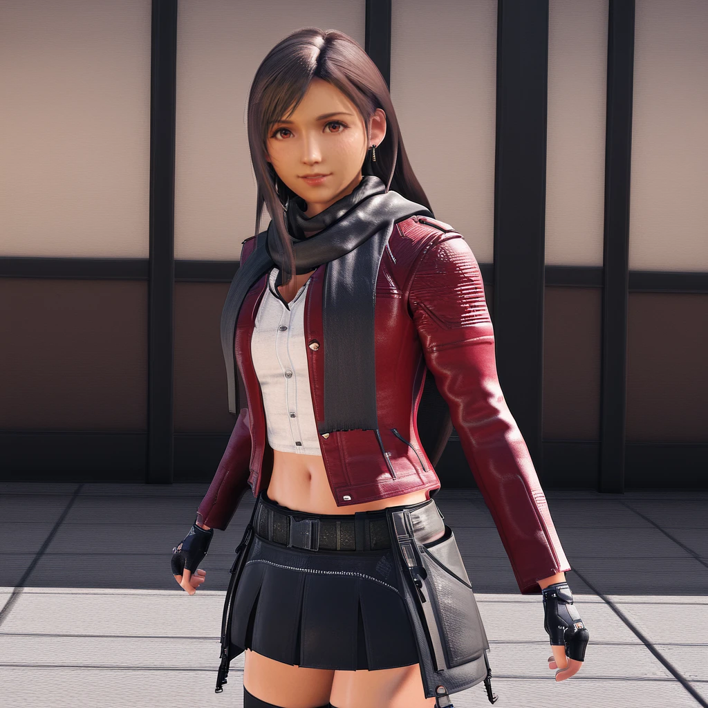 Trigger with scarf: TifaFF7RemakeScarf, 1girl, black skirt, black thighhighs, black scarf, fingerless gloves, tifa lockhart, navel, red jacket, earrings, brown hair, midriff, jewelry, black gloves, brown eyes, long hair, belt, pleated skirt, white shirt, swept bangs, cowboy shot, 3d