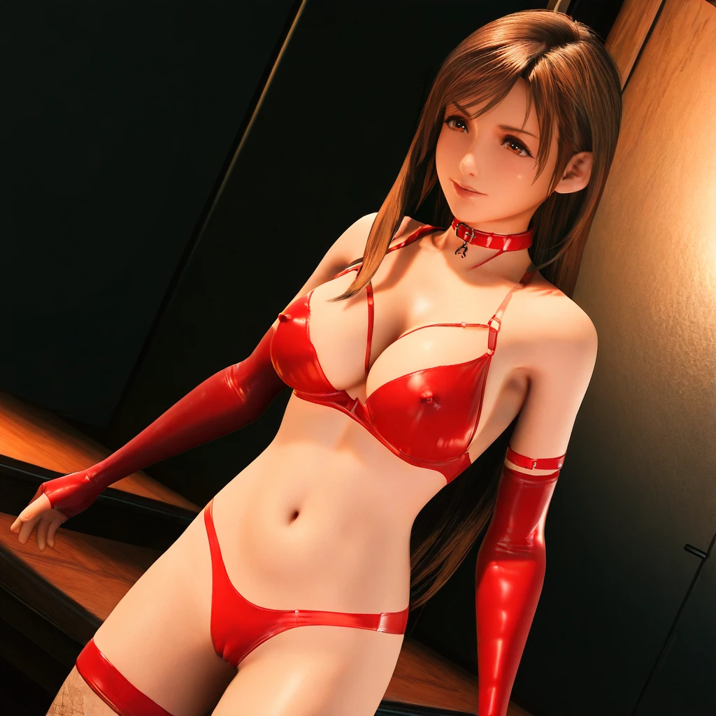 Trigger with red bra: TifaFF7RemakeRedBra, 1girl, large breasts, thighhighs, navel, brown hair, long hair, ???????, brown eyes, underwear, elbow gloves, red panties, single thighhigh, red bra, choker, collar, cameltoe, cleavage, cowboy shot, 3d