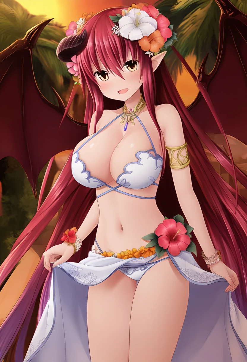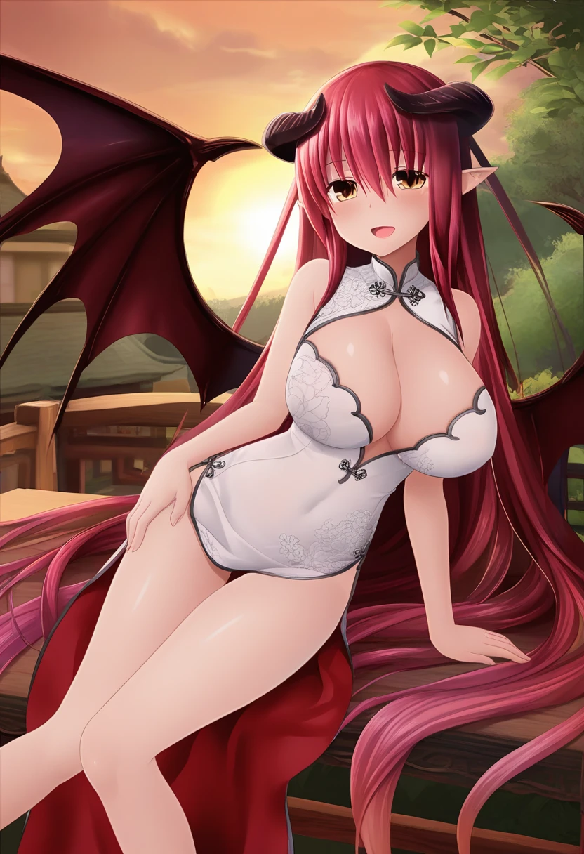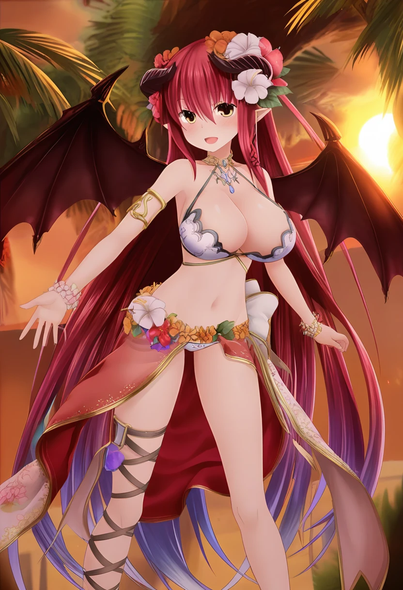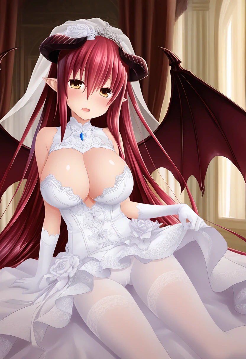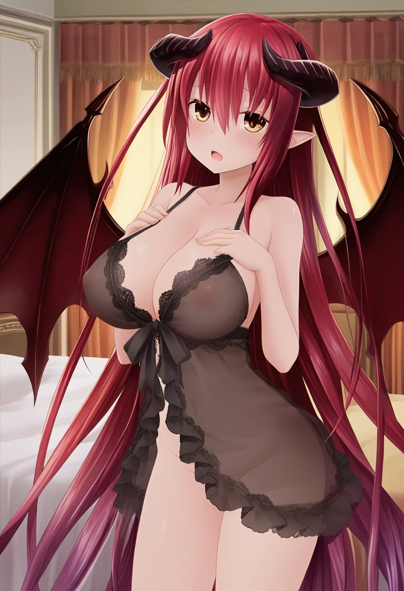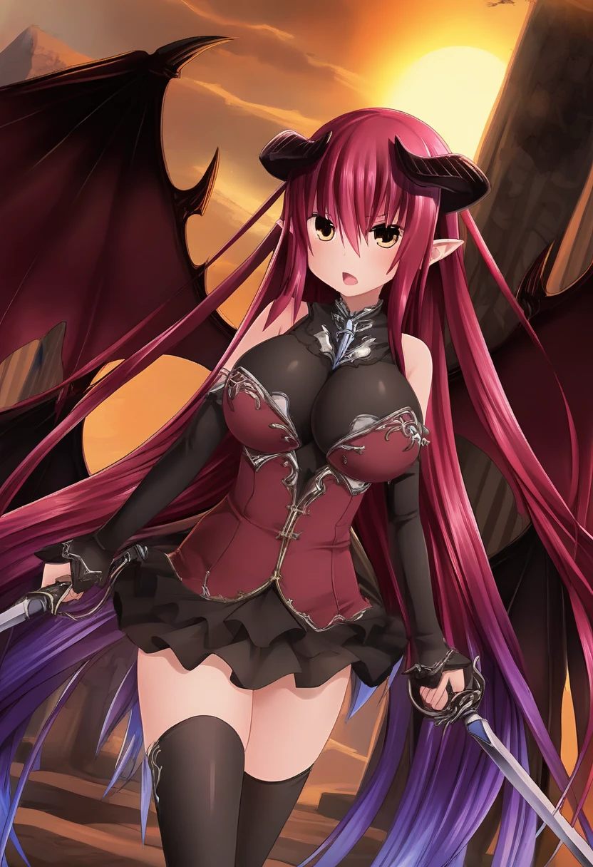 diabolosDP, demon horns, demon wings, red hair, gradient hair, very long hair, brown eyes, pointy ears, large breasts