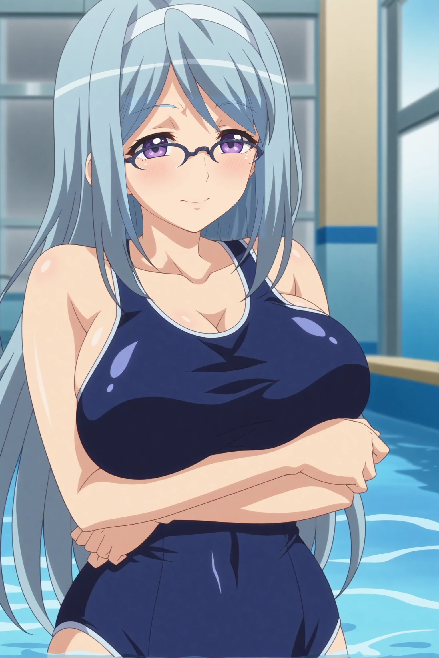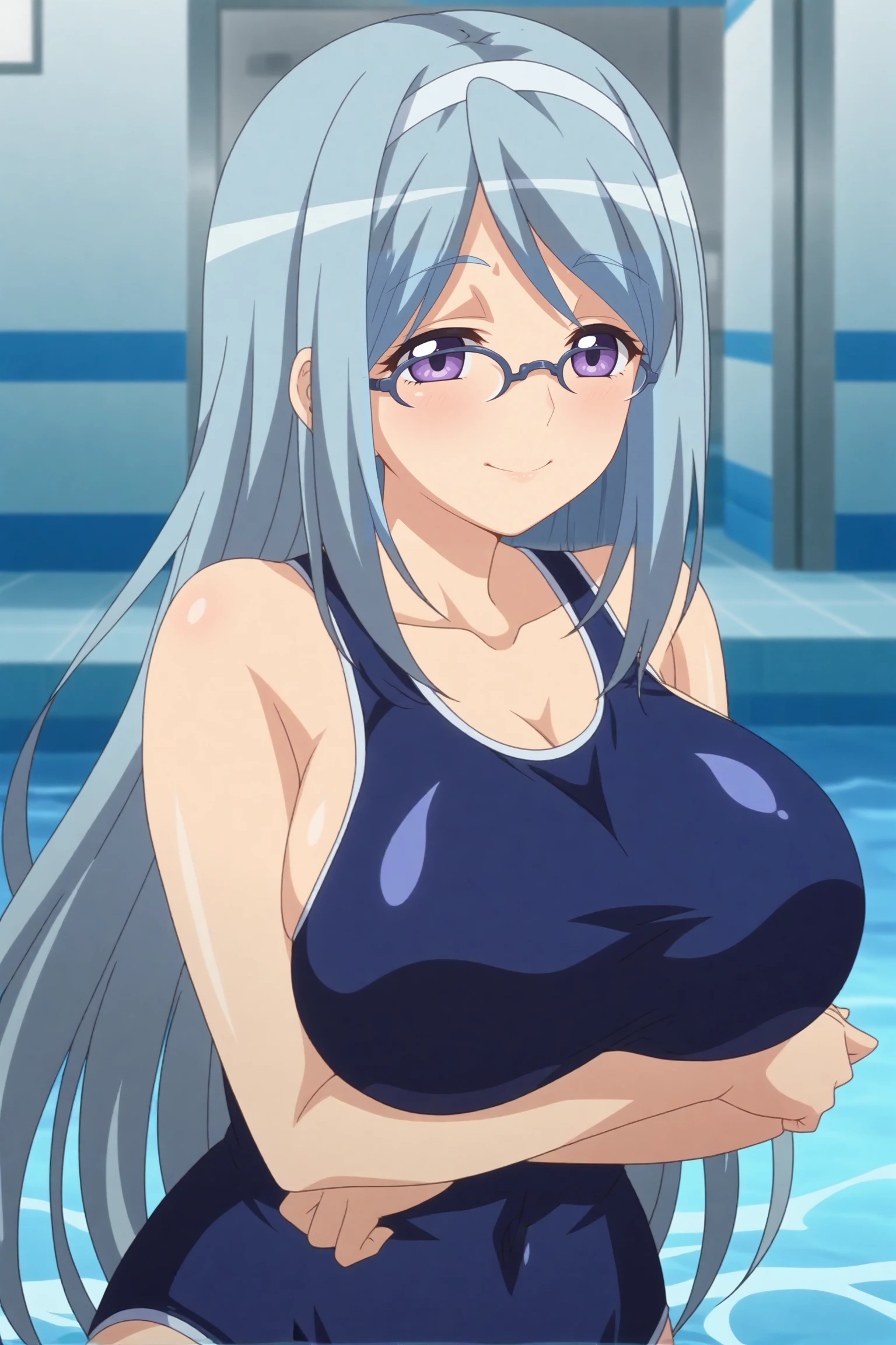 shizuru takahama,breasts,glasses,large breasts,long hair,one-piece swimsuit,swimsuit,school swimsuit,collarbone
