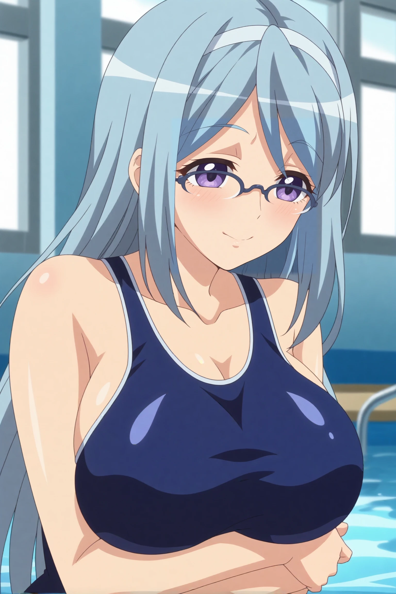 Triggers : shizuru takahama,breasts,glasses,large breasts,long hair,one-piece swimsuit,swimsuit,school swimsuit,collarbone
