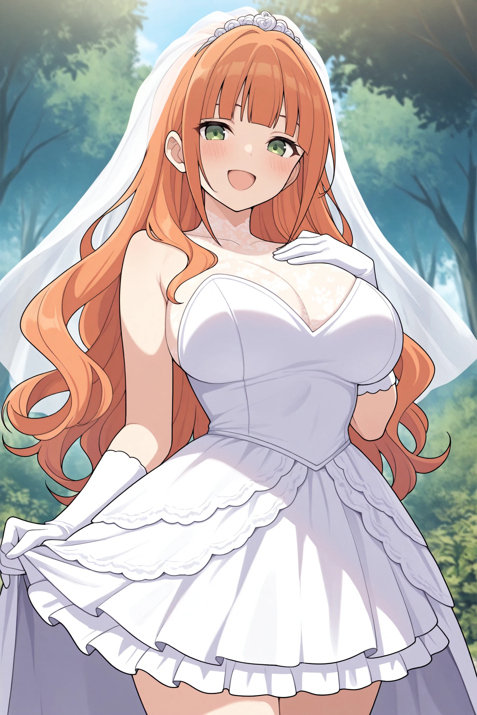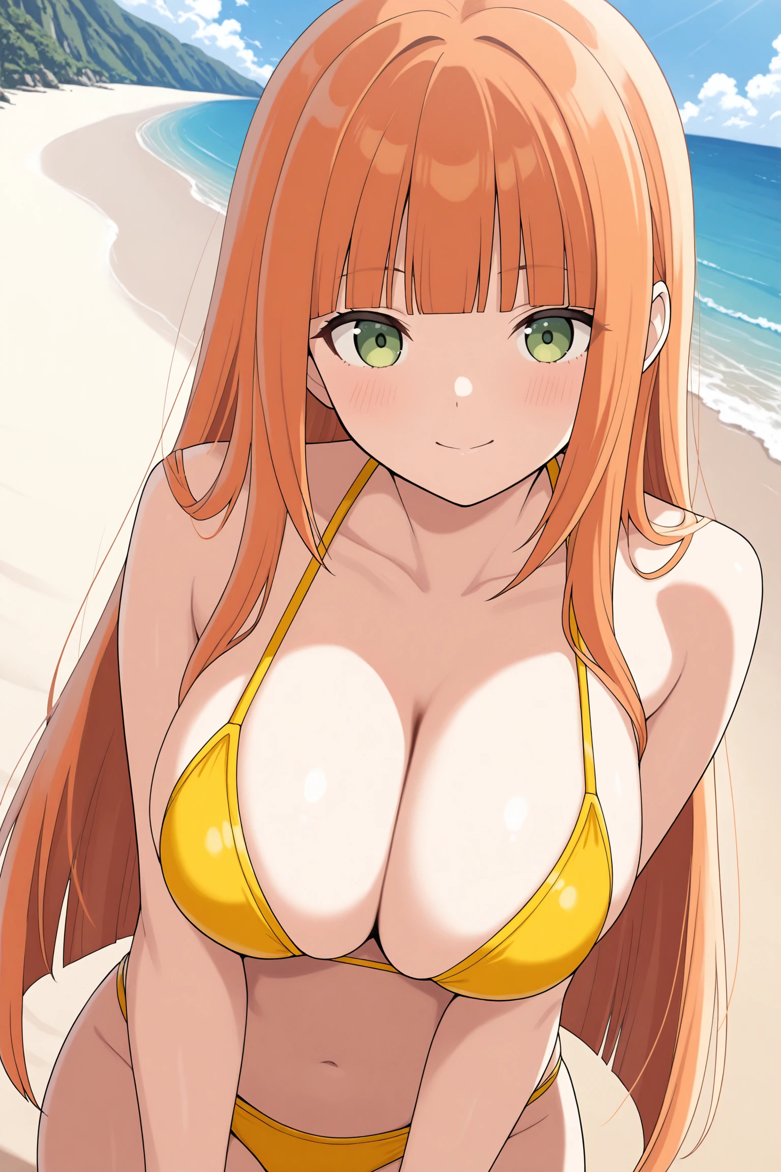 orange hair, blunt bangs, hime cut, very long hair, sidelocks, green eyes