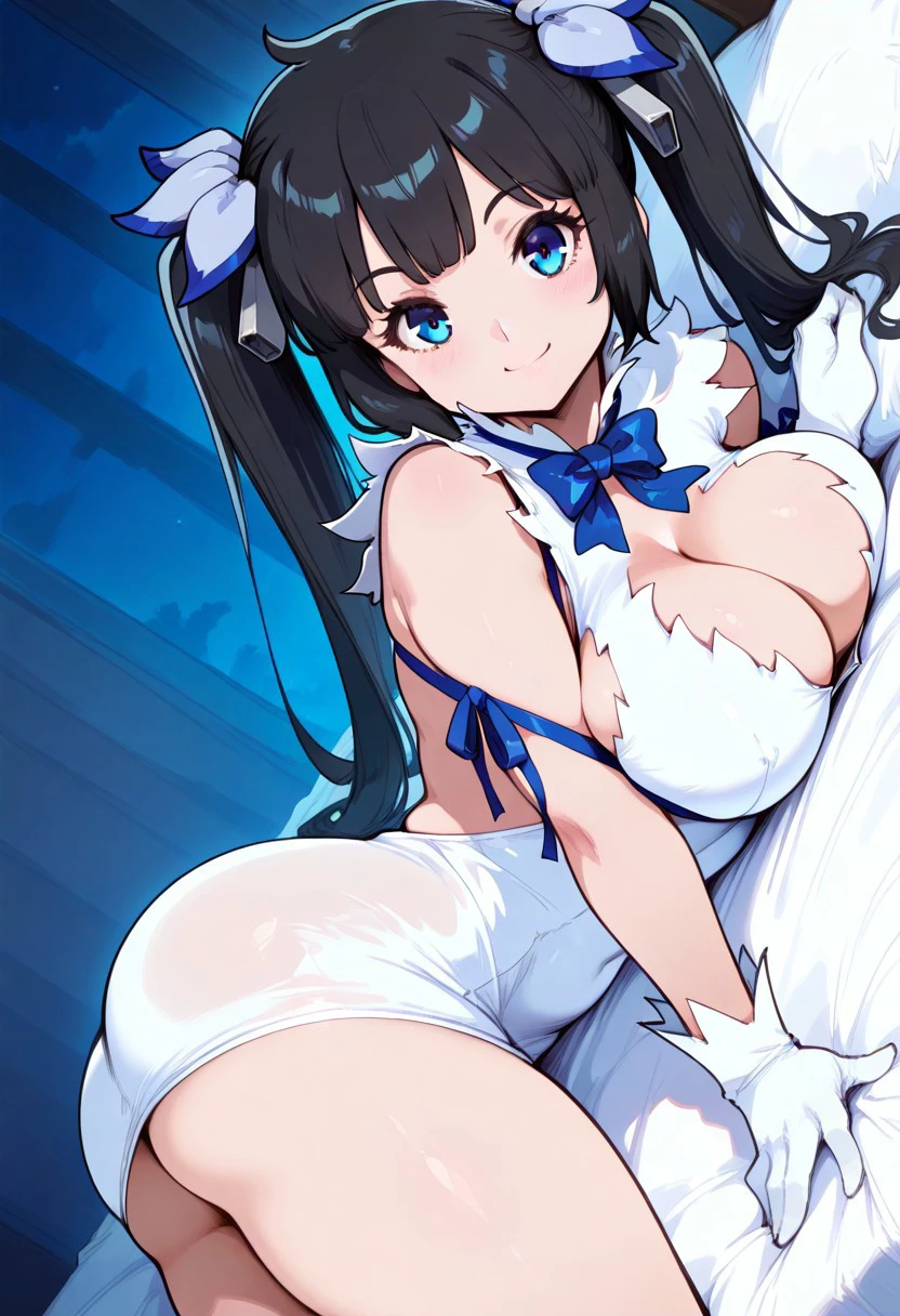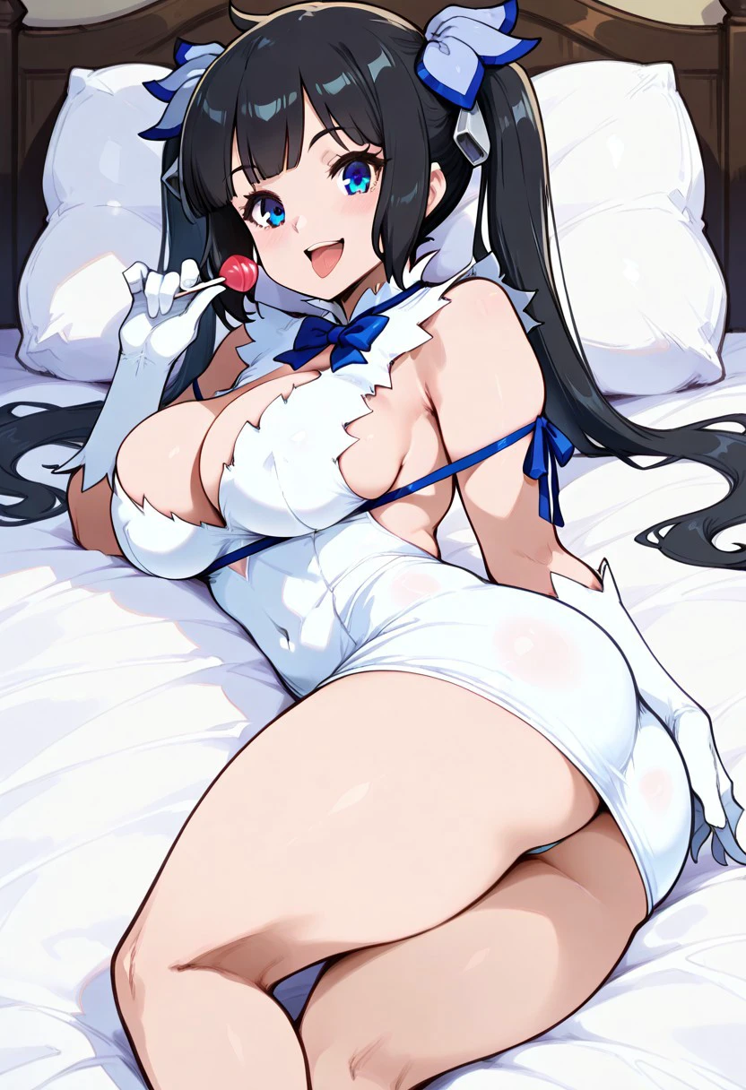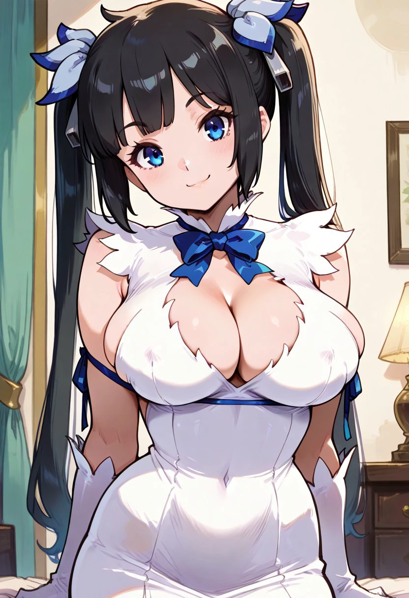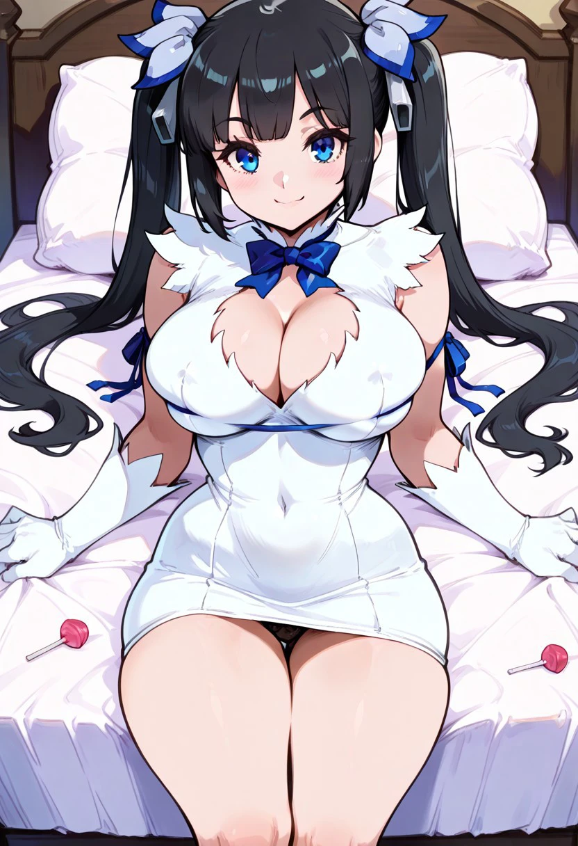 patHestia, hestia, blue eyes, black hair, twintails, blue bow, blue bowtie, cleavage cutout, clothing cutout, gloves, pencil dress, rei no himo, short dress, white dress, white gloves,