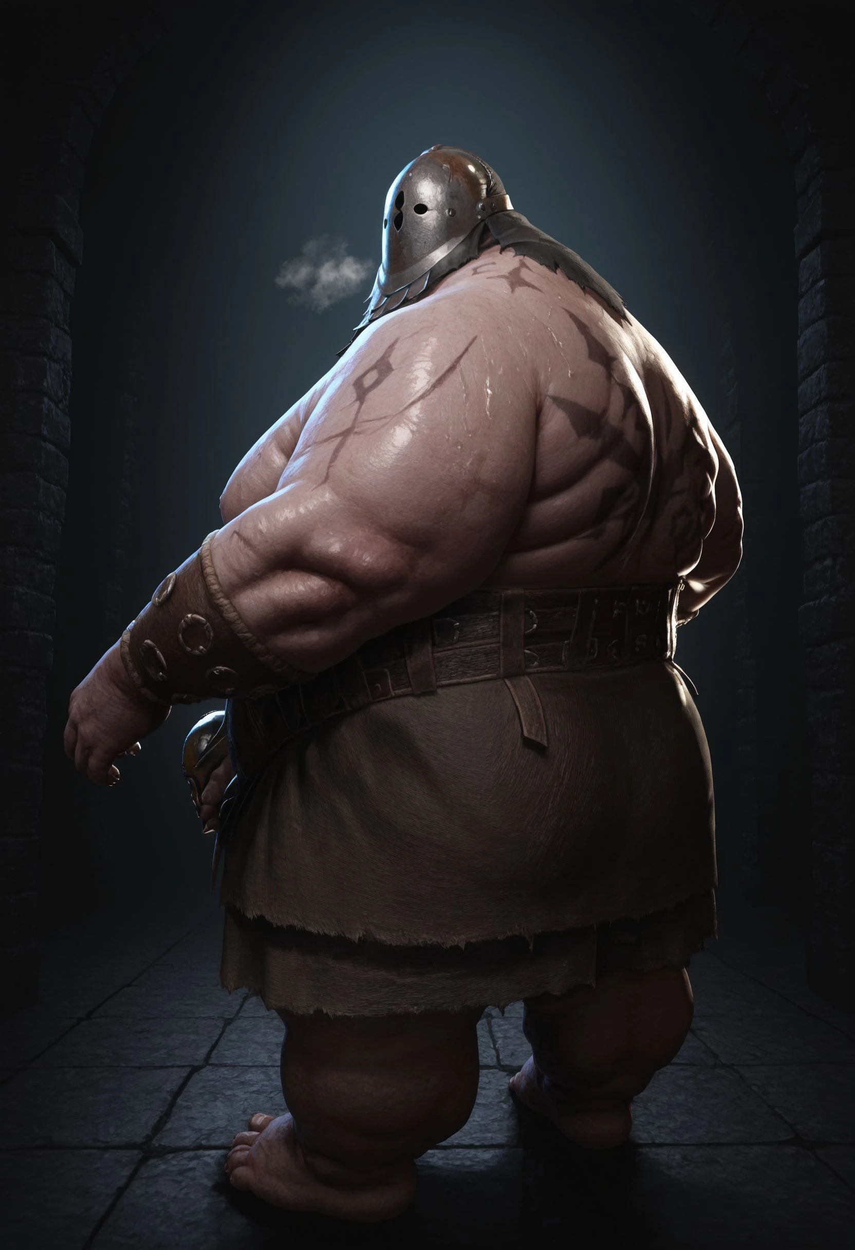 masterpiece, best quality, amazing quality, male focus, mature male, BL1GHTST0RMER, big moobs, hyper chubby, hyper obese, plumb, flaccid, flabby arm, big belly, tattoo, scar, large pectorals, shiny skin, fat cheek, fat chin,