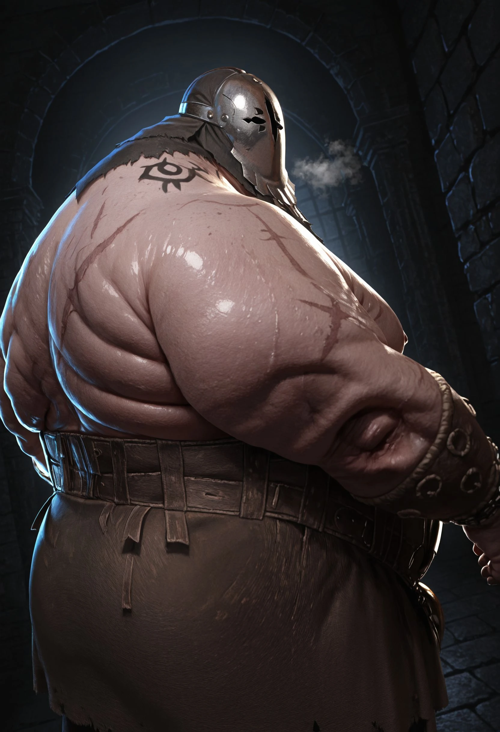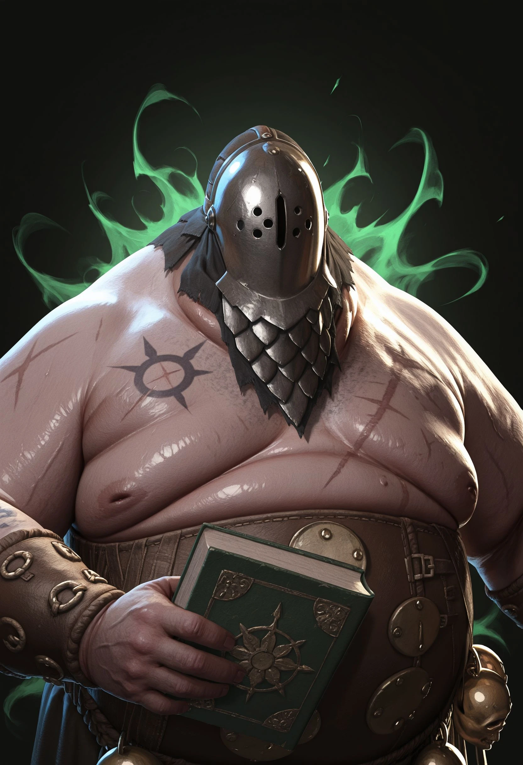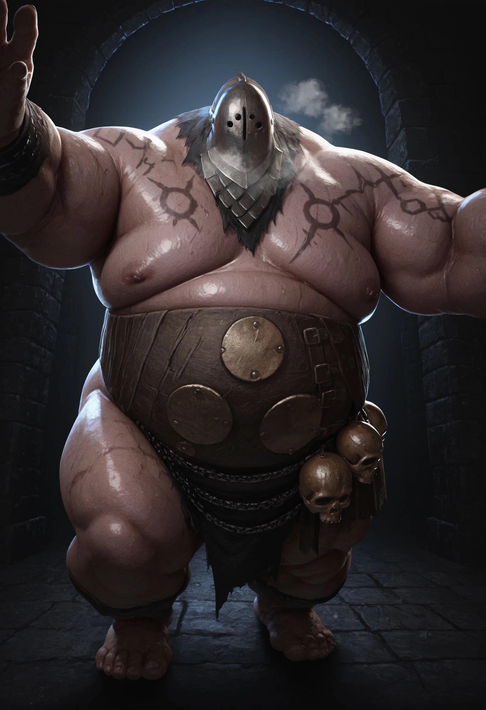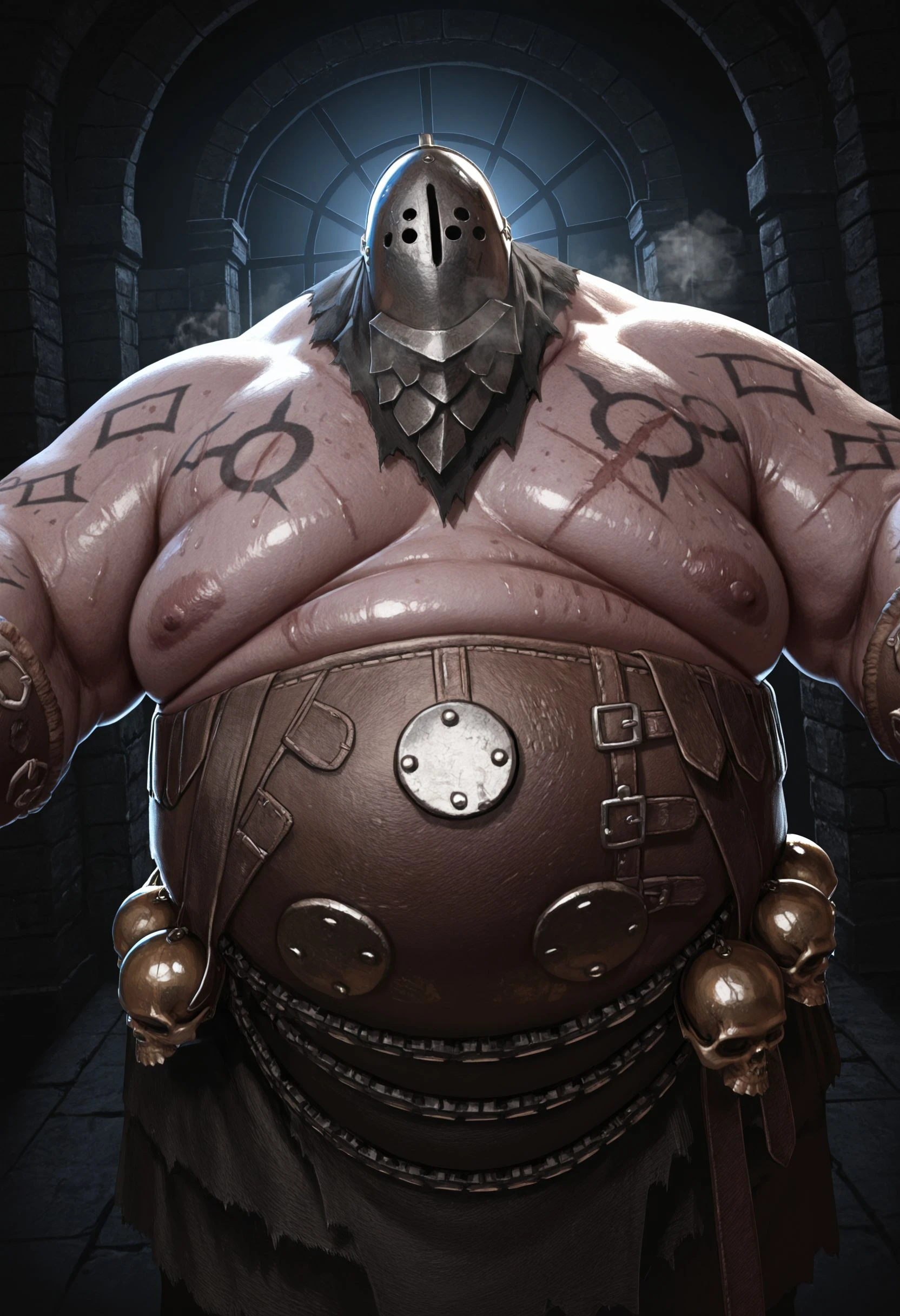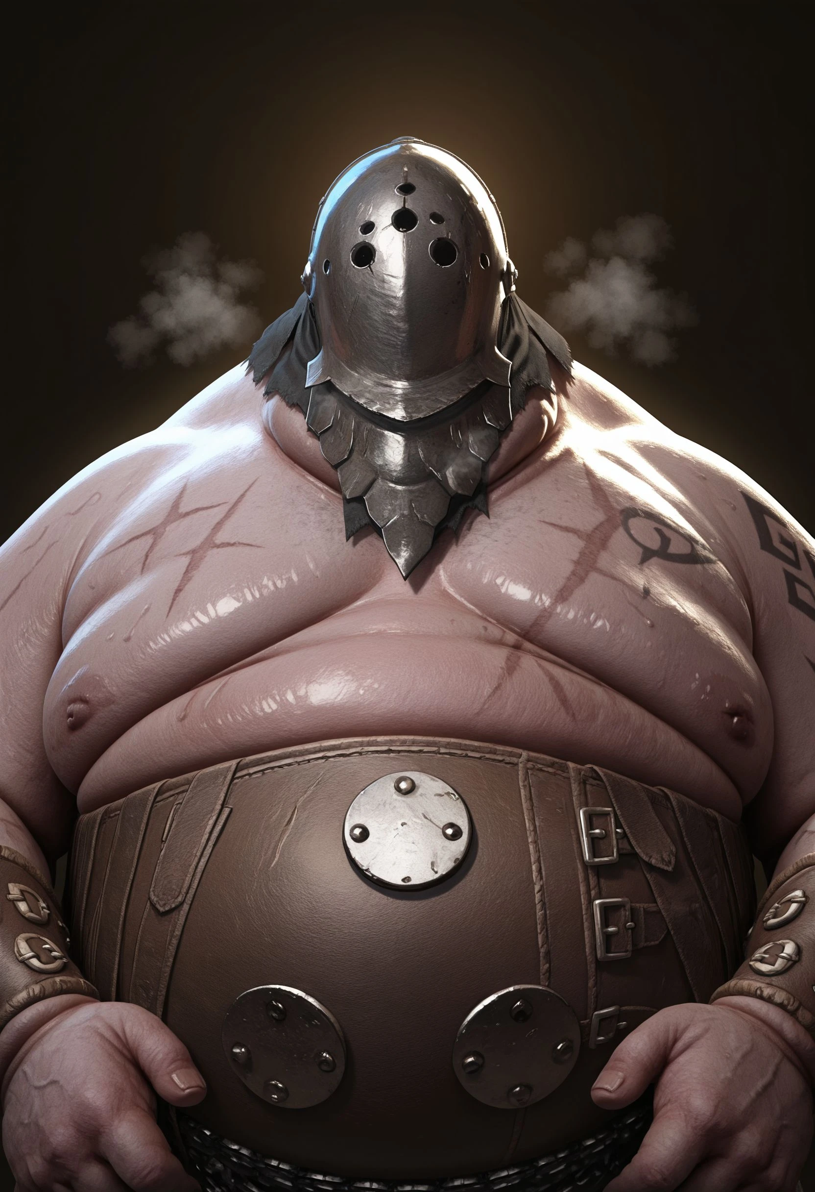 BL1GHTST0RMER, big moobs, hyper chubby, hyper obese, plumb, flaccid, flabby arm, big belly, tattoo, scar, large pectorals, shiny skin, fat cheek, fat chin,