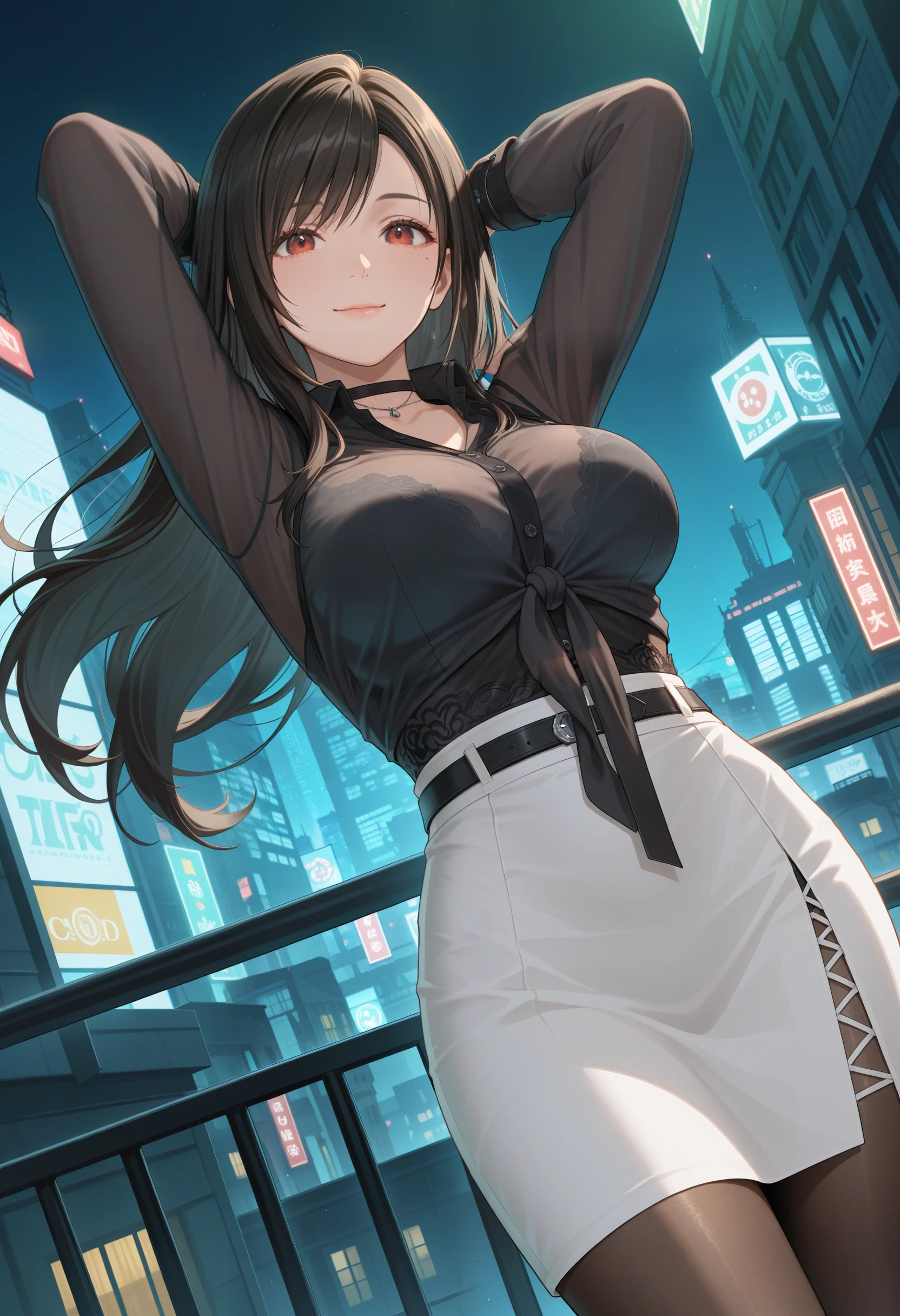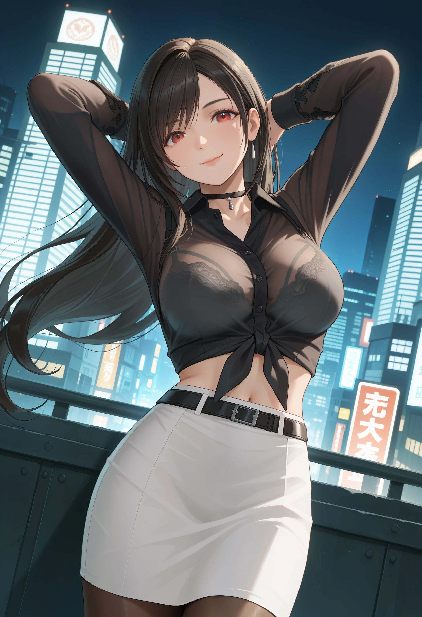 CitylightDoaxvv,black choker,black shirt,front-tie top,long sleeves,underwear bra,navel,see-through,white skirt,pencil skirt,grid slit,brown pantyhose,high heels