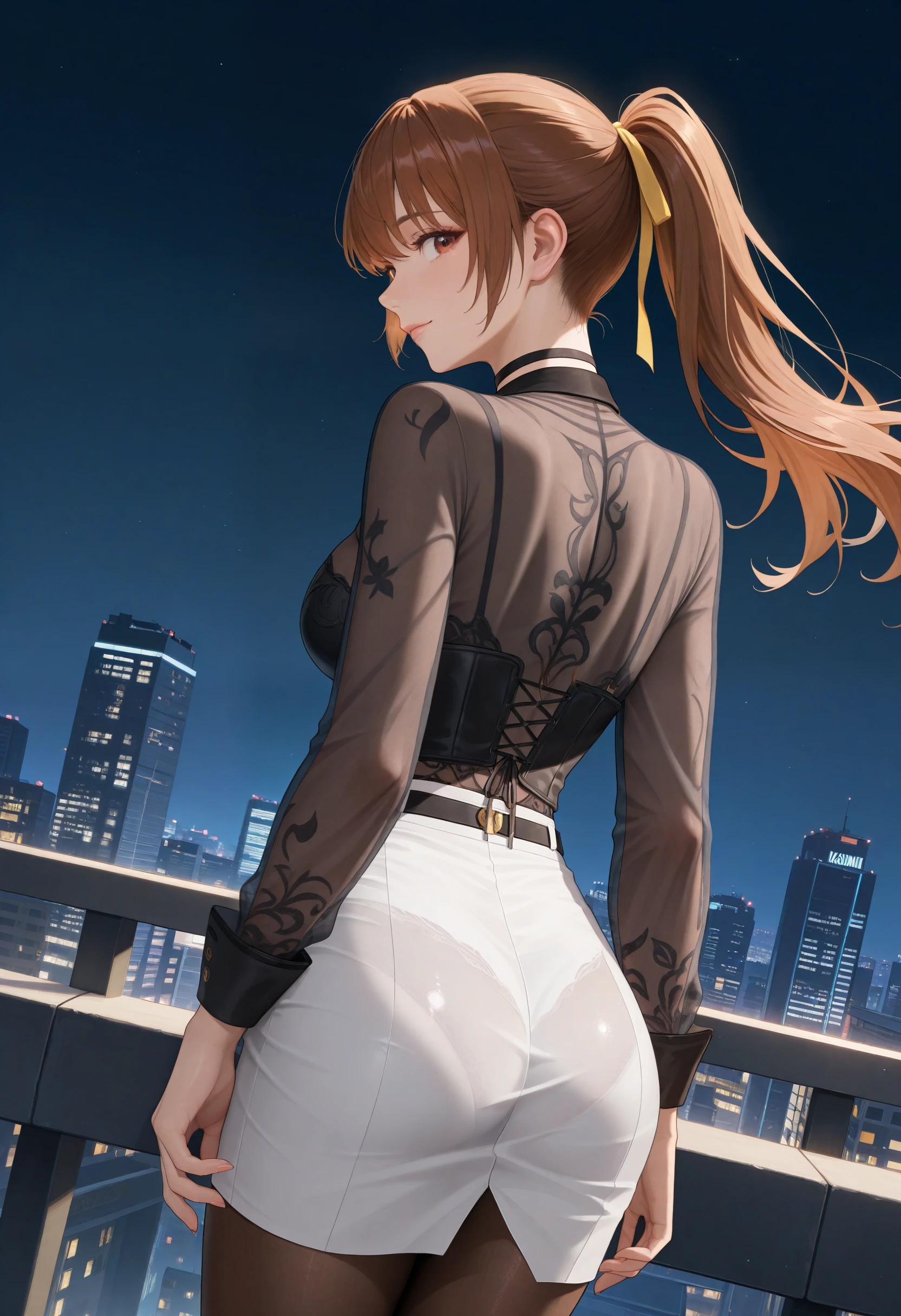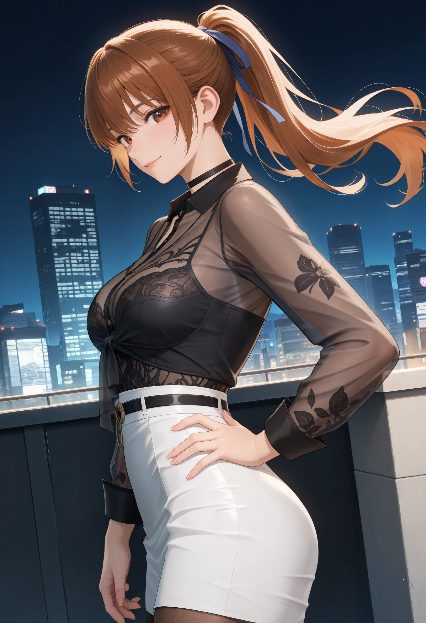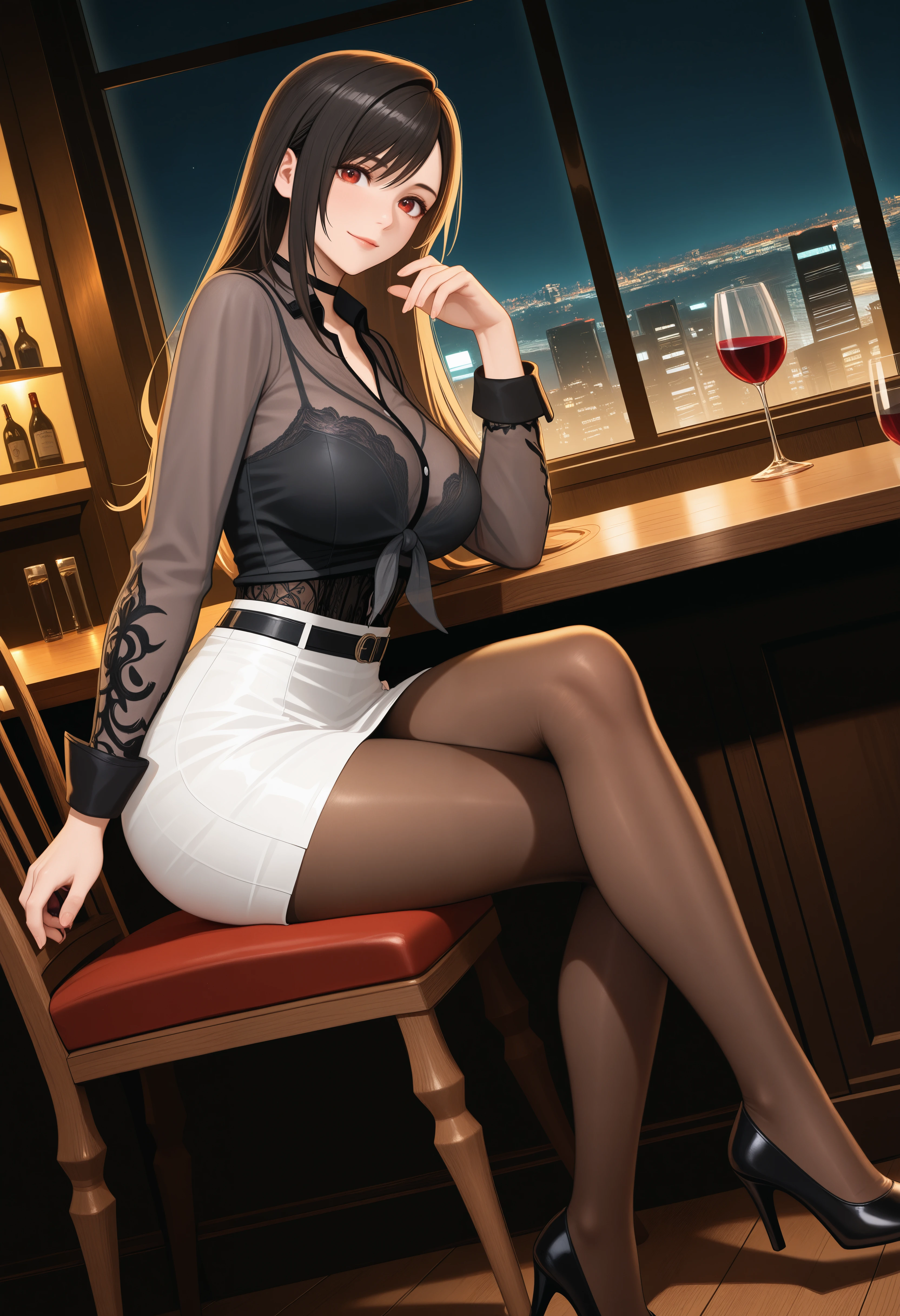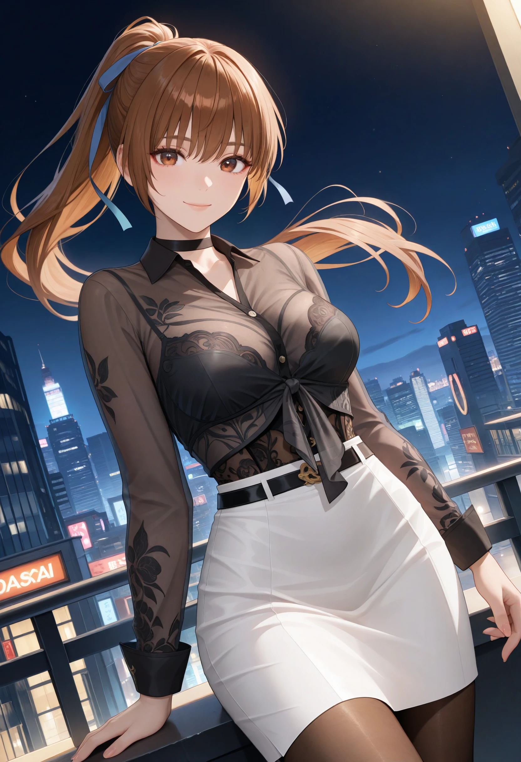 Base prompt: "CityLight_doaxvv,choker,tied shirt,see-through shirt,long sleeves,black underwear,visible through clothes,white skirt,brown pantyhose,high heels"