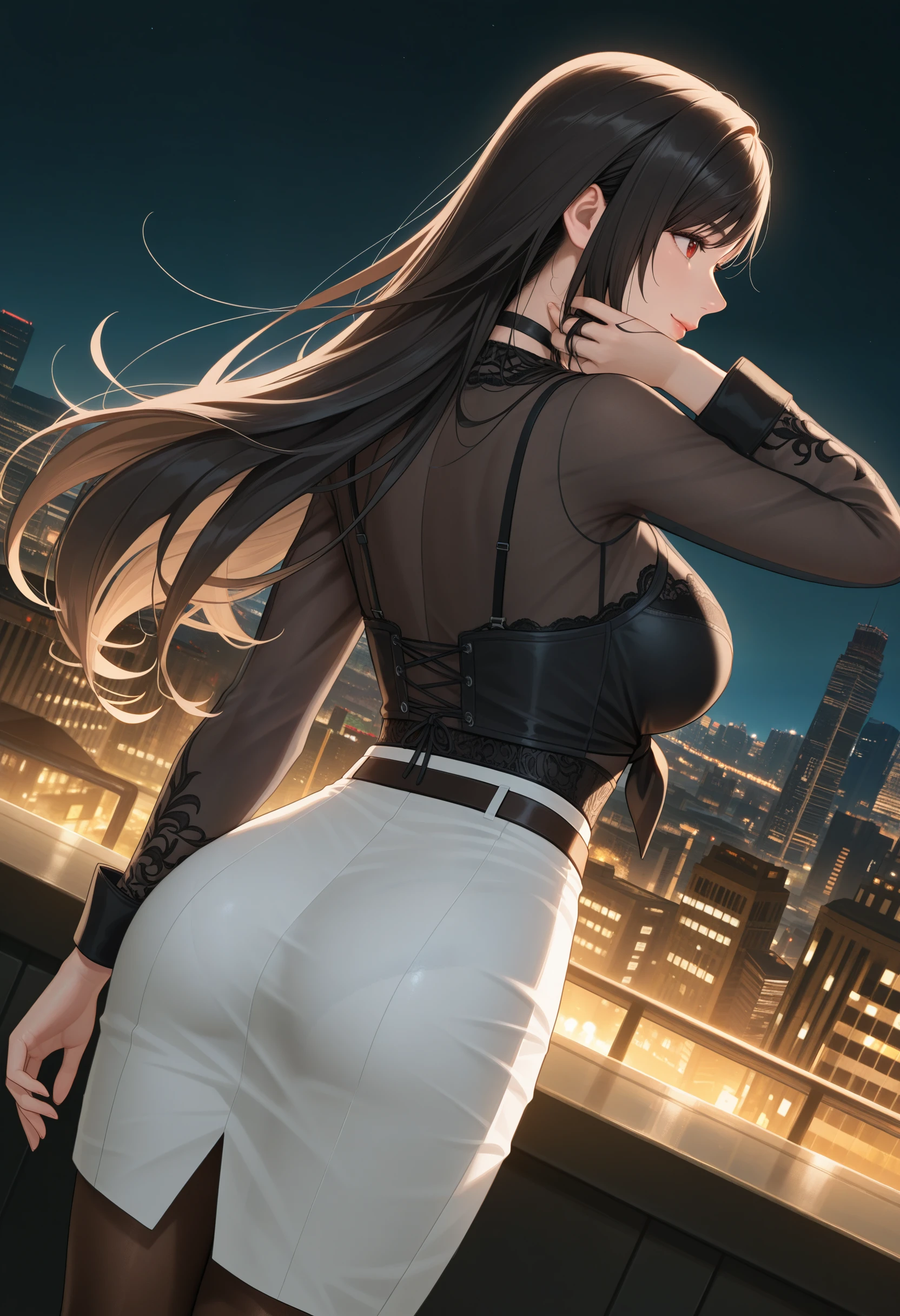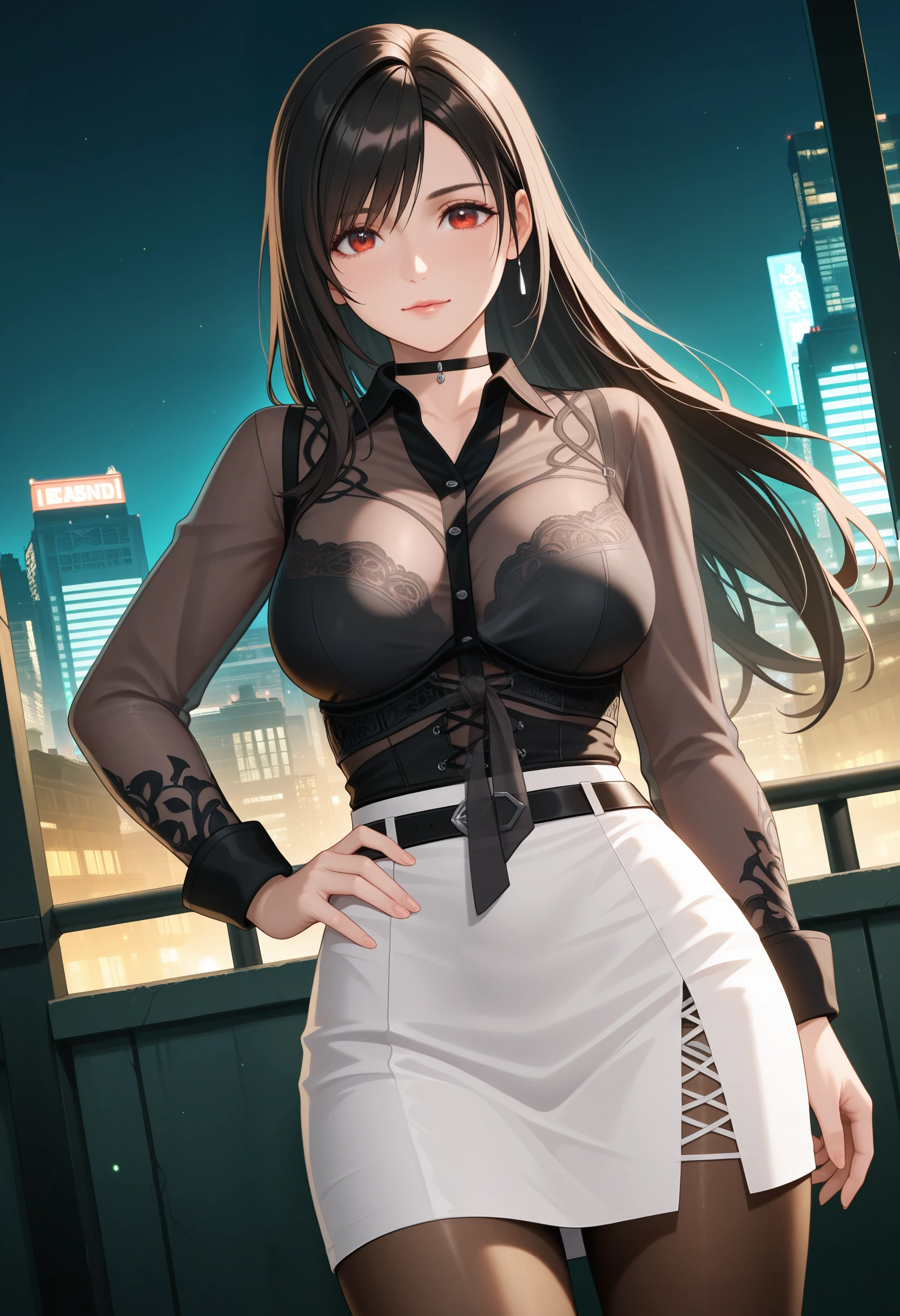 CitylightDoaxvv,black choker,black shirt,front-tie top,long sleeves,underwear bustier,see-through,white skirt,pencil skirt,grid slit,brown pantyhose,high heels
