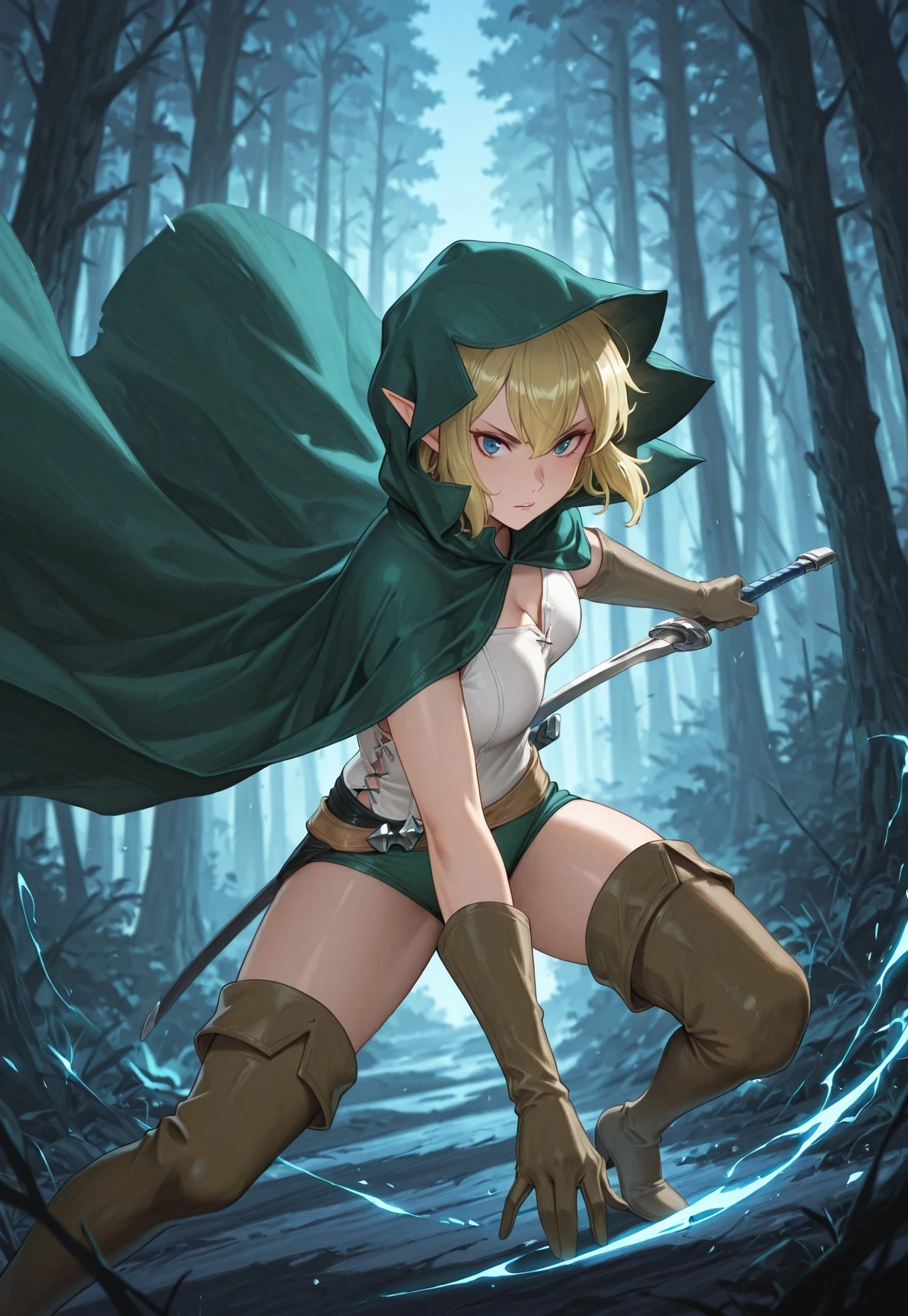 Adventurer outfit: Gloves, cape, hood, thigh boots, hood,