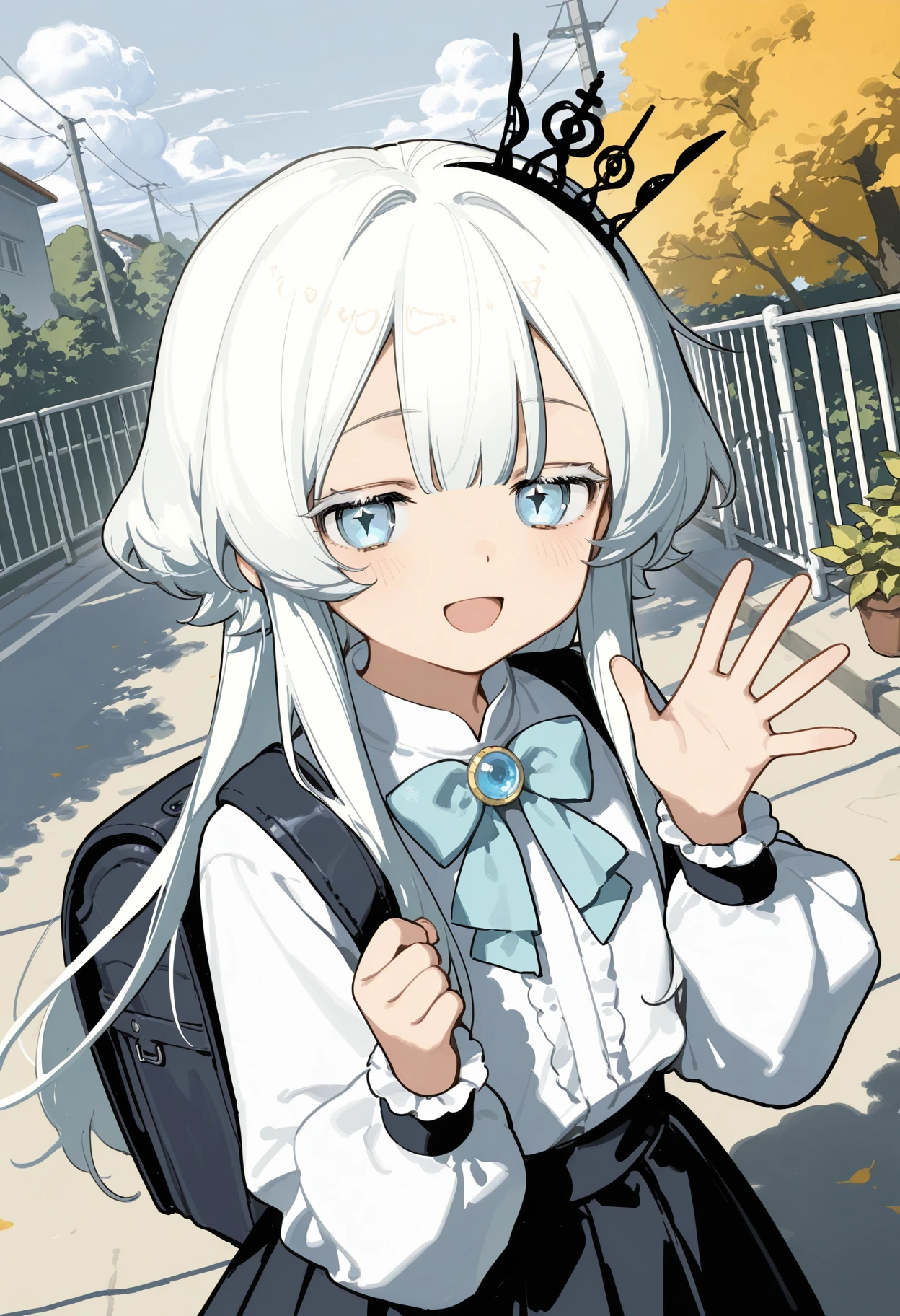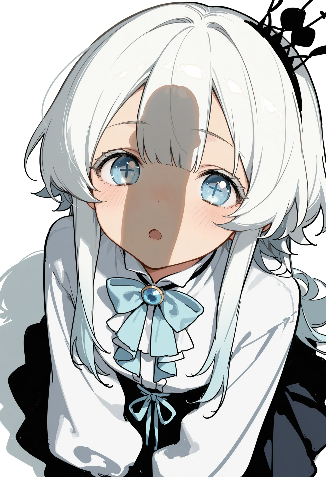 taweier, 1girl, solo, bow, white hair, white shirt, mini crown, star-shaped_pupils, bowtie, puffy long sleeves, blue brooch, mini crown, long hair, blue eyes, white eyelashes, black skirt, sidelocks, jewelry, gem, frills