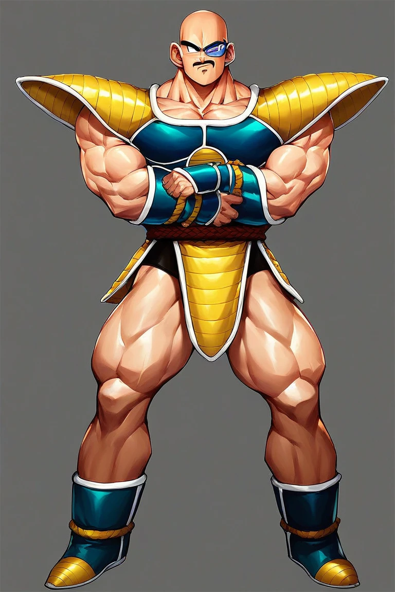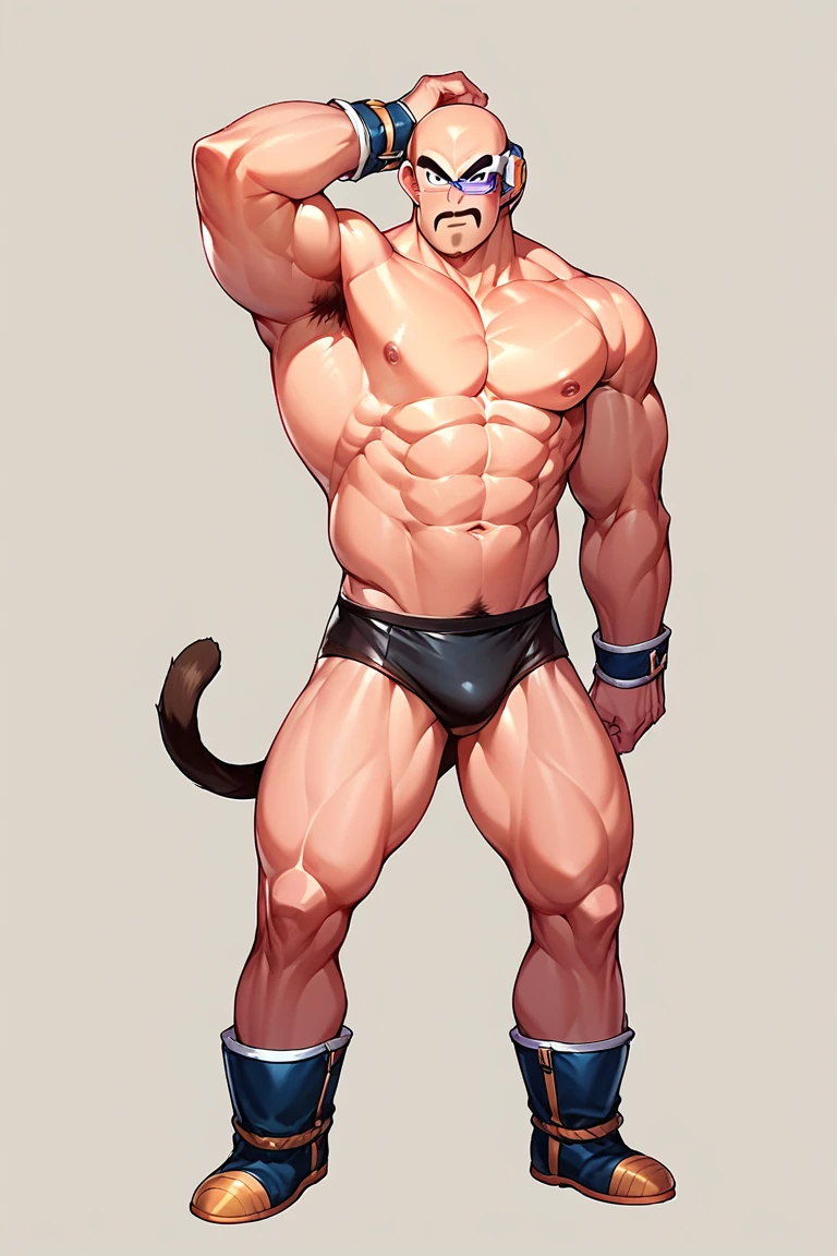 solo, male, adult, nappa, bald, black eyes, Saiyan armor, wrist guards, boots, monkey tail, mustache, tracker on left eye