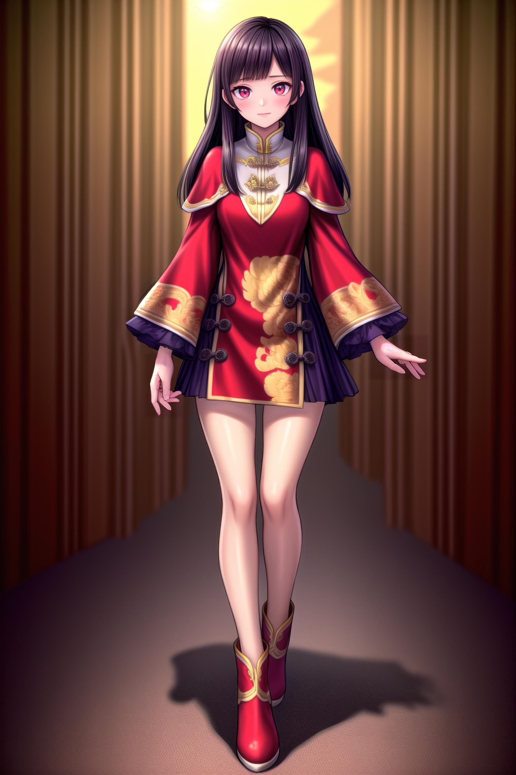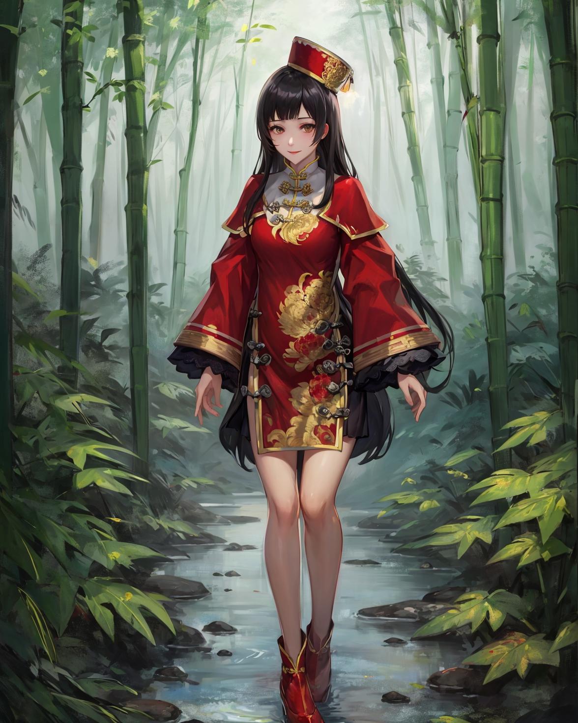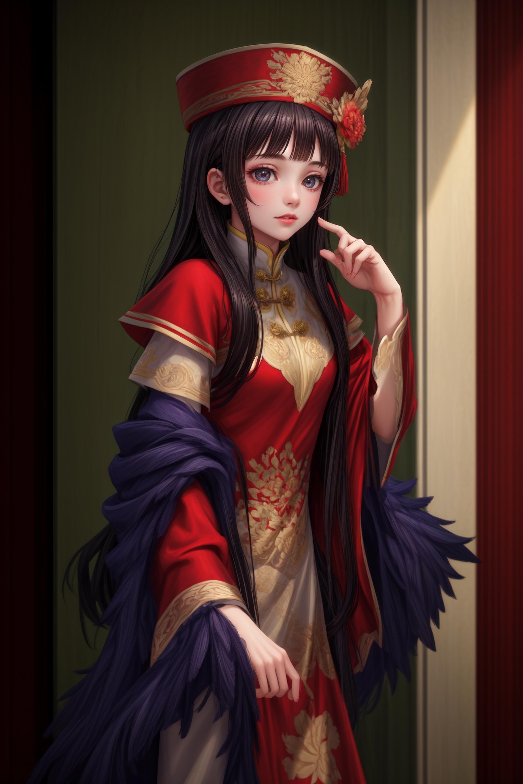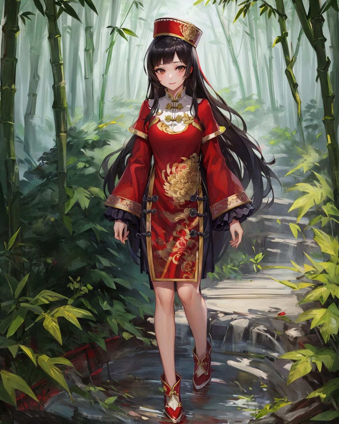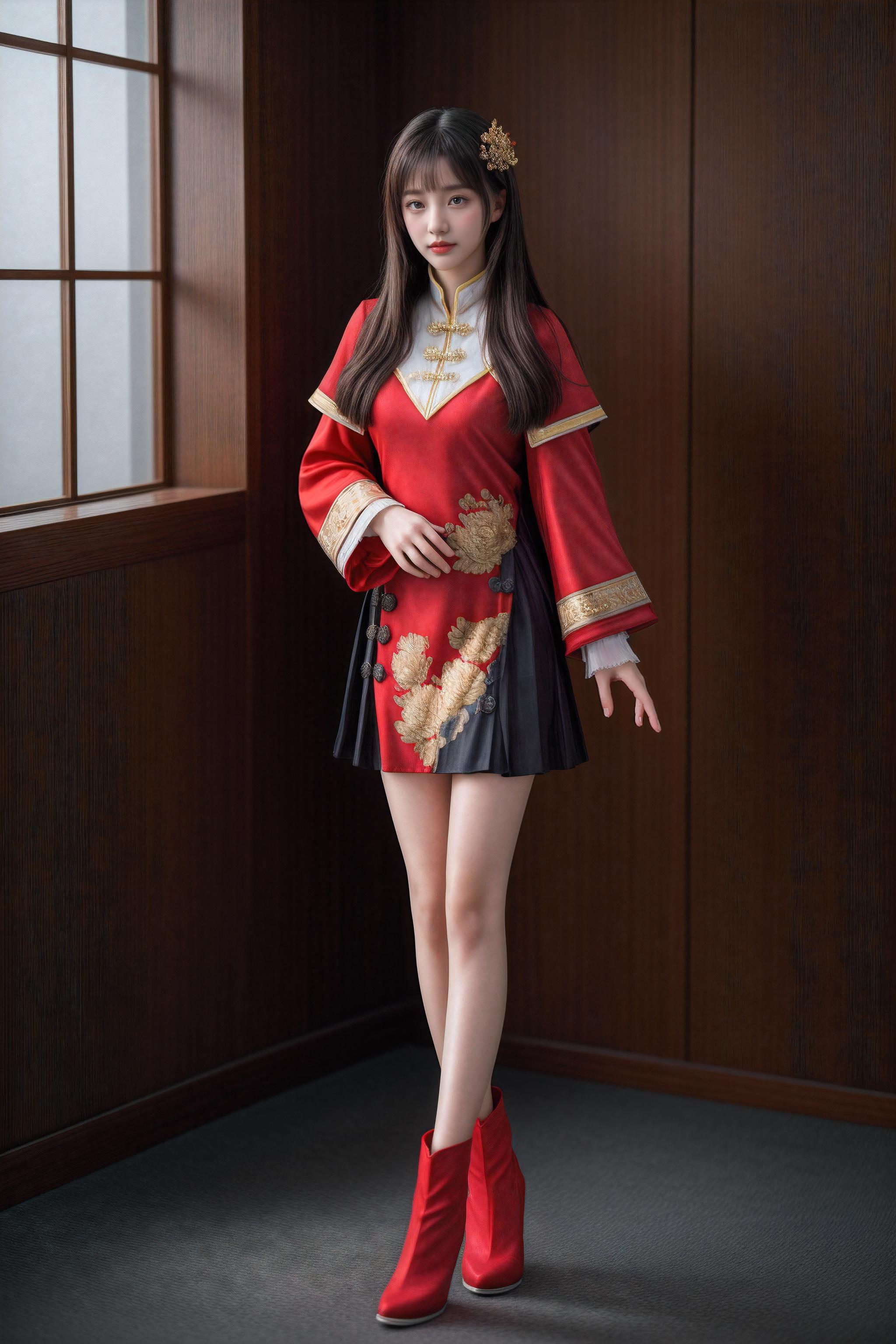 <lora:DaqiaoDW8:0.9>, Daqiao, black hair, long hair, brown eyes, red hat, headwear, red dress, chinese clothes, red shoes,