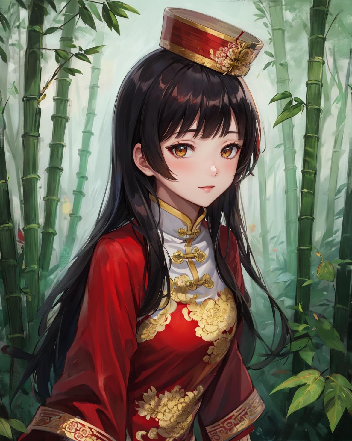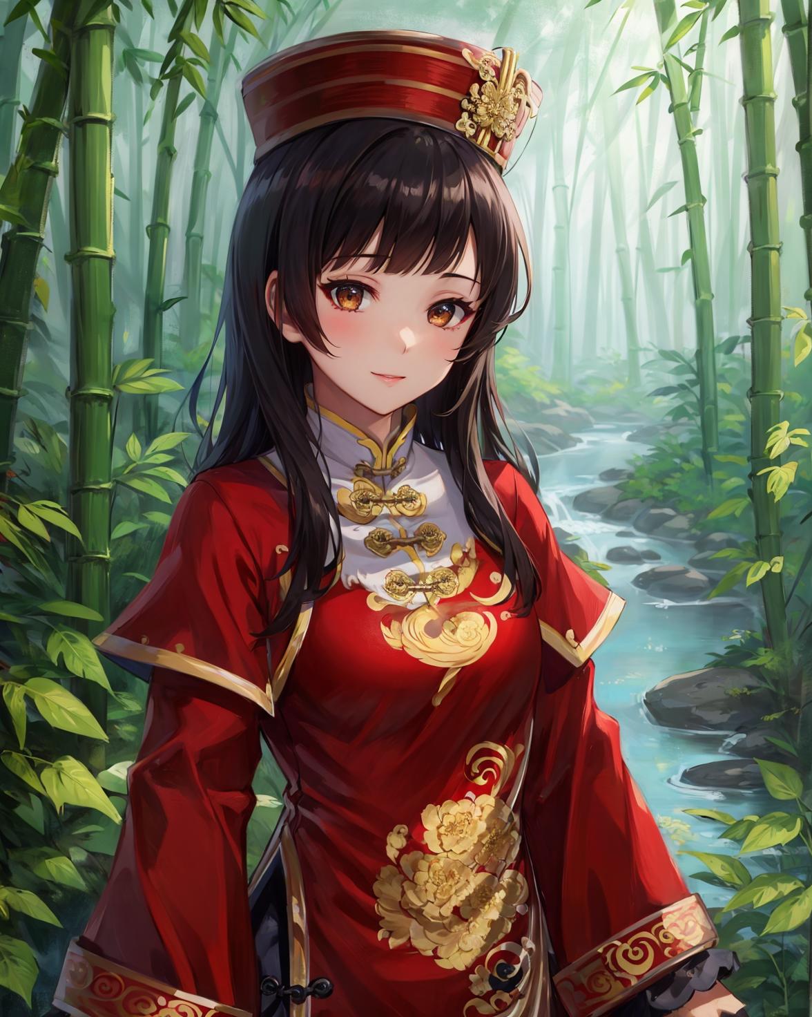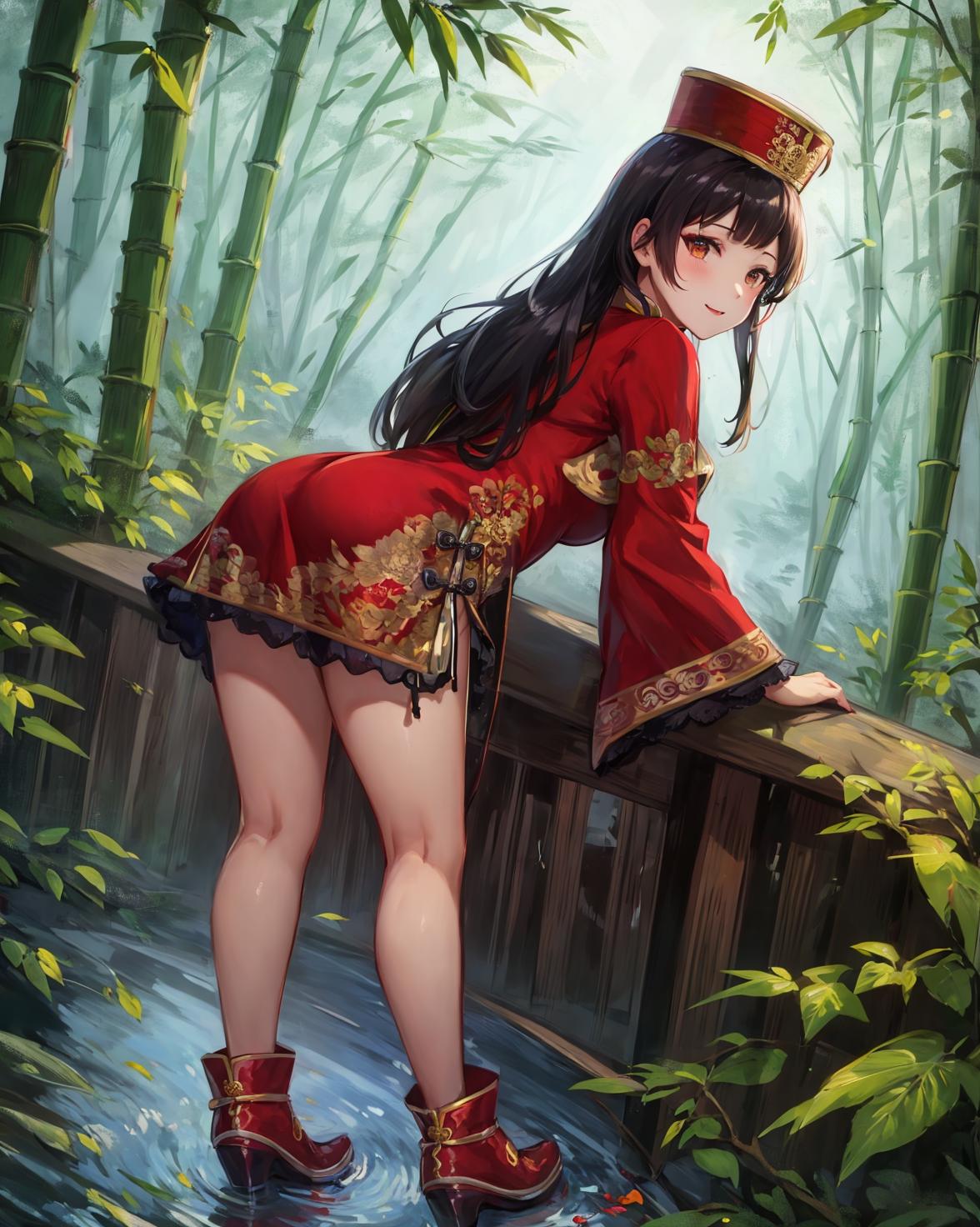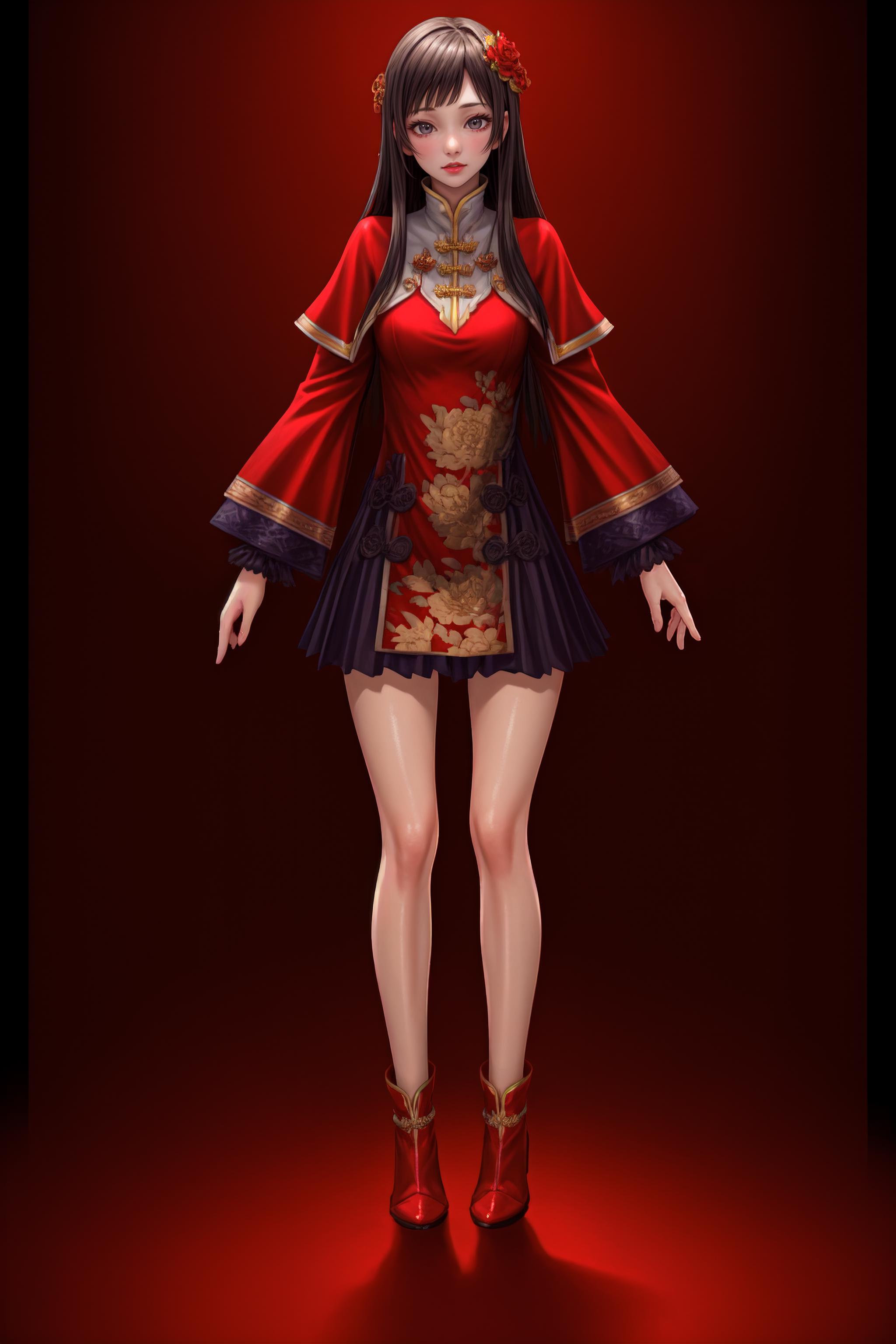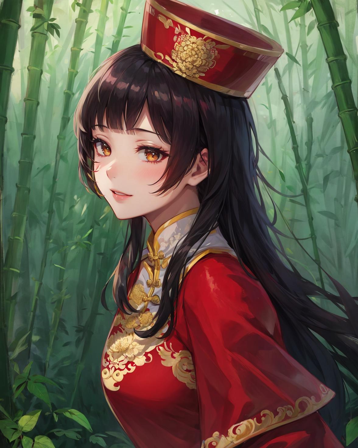 <lora:DaqiaoDW8:0.9>, Daqiao, black hair, long hair, brown eyes, red hat, headwear, red dress, chinese clothes, red shoes,