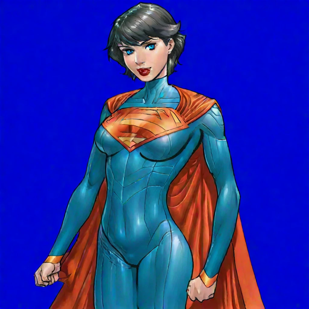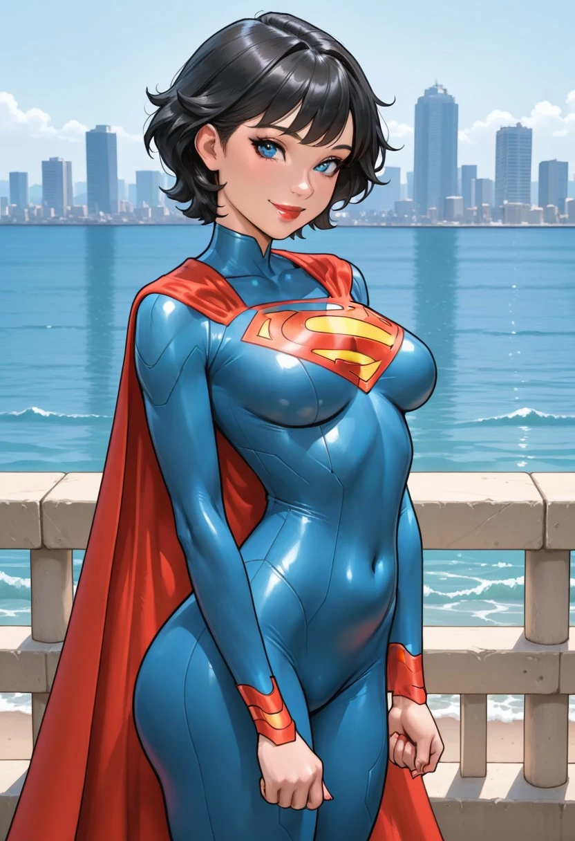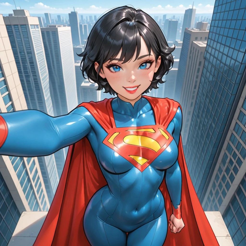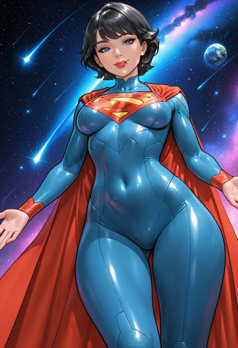 EARTH11superwoman, short hair, black hair, bangs, blue eyes, lipstick,
