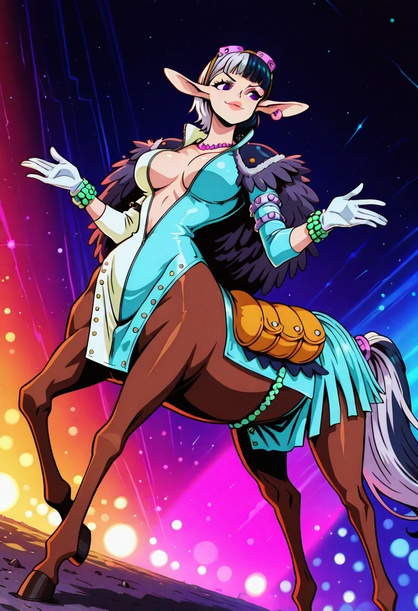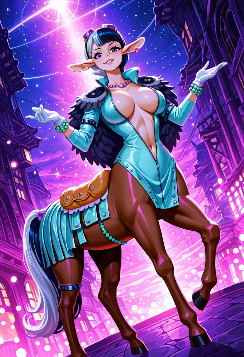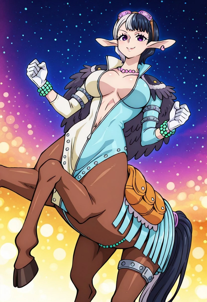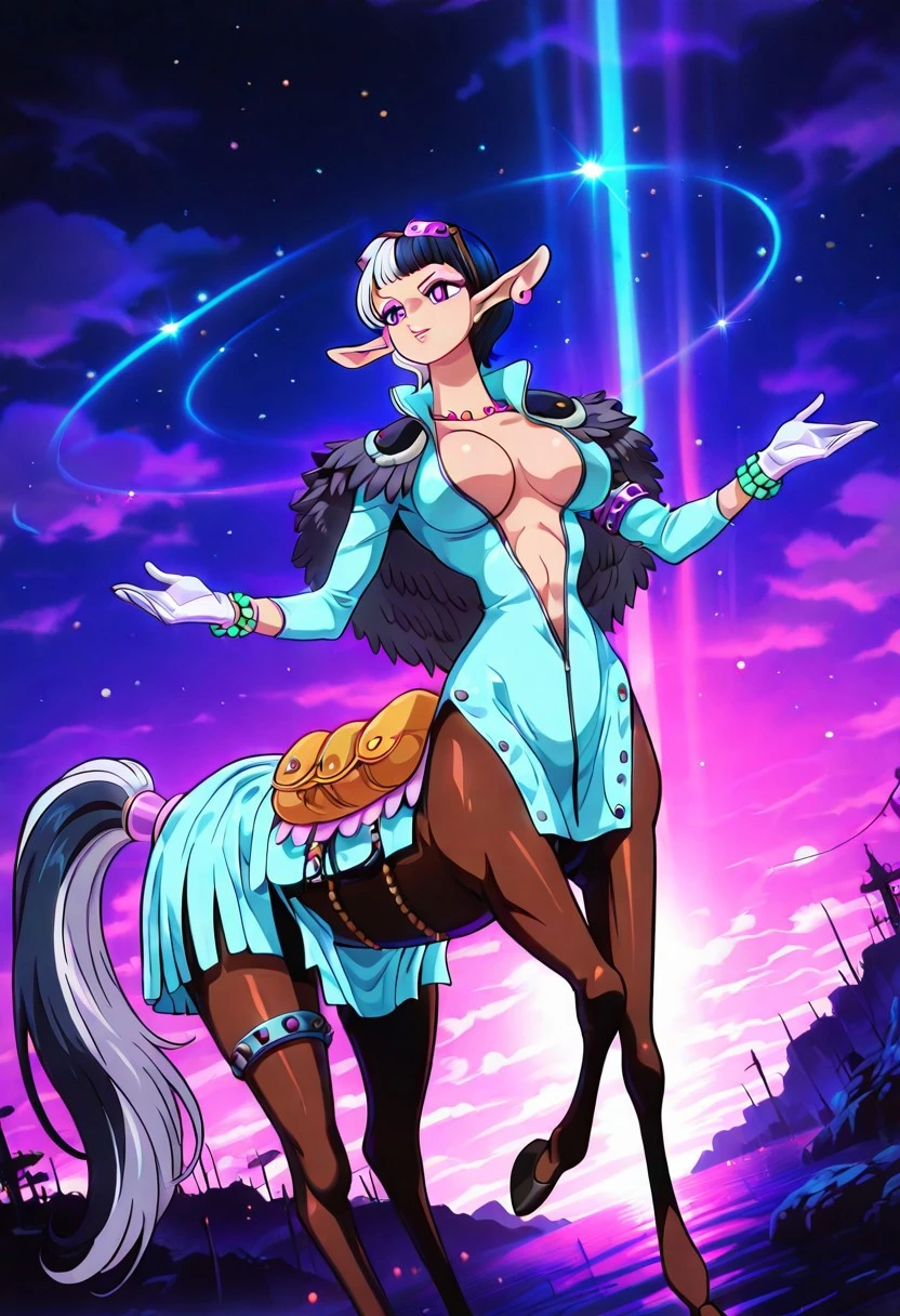 SpeedOP, 1girl, solo, monster girl, centaur, horsetaur, taur, large breast, short hair, purple eyes, two-tone hair, pointy ears, gloves, earrings, hooves, tail, horse tail, midriff, navel, jewelry, necklace, cleavage, pelvic curtain, multicolored hair, bracelet, bodysuit, open clothes, eyewear on head, jacket, two-tone clothes, shoulder pauldrons, feather cape, horse body, saddle, accessories,