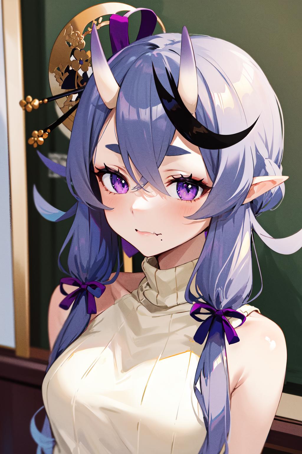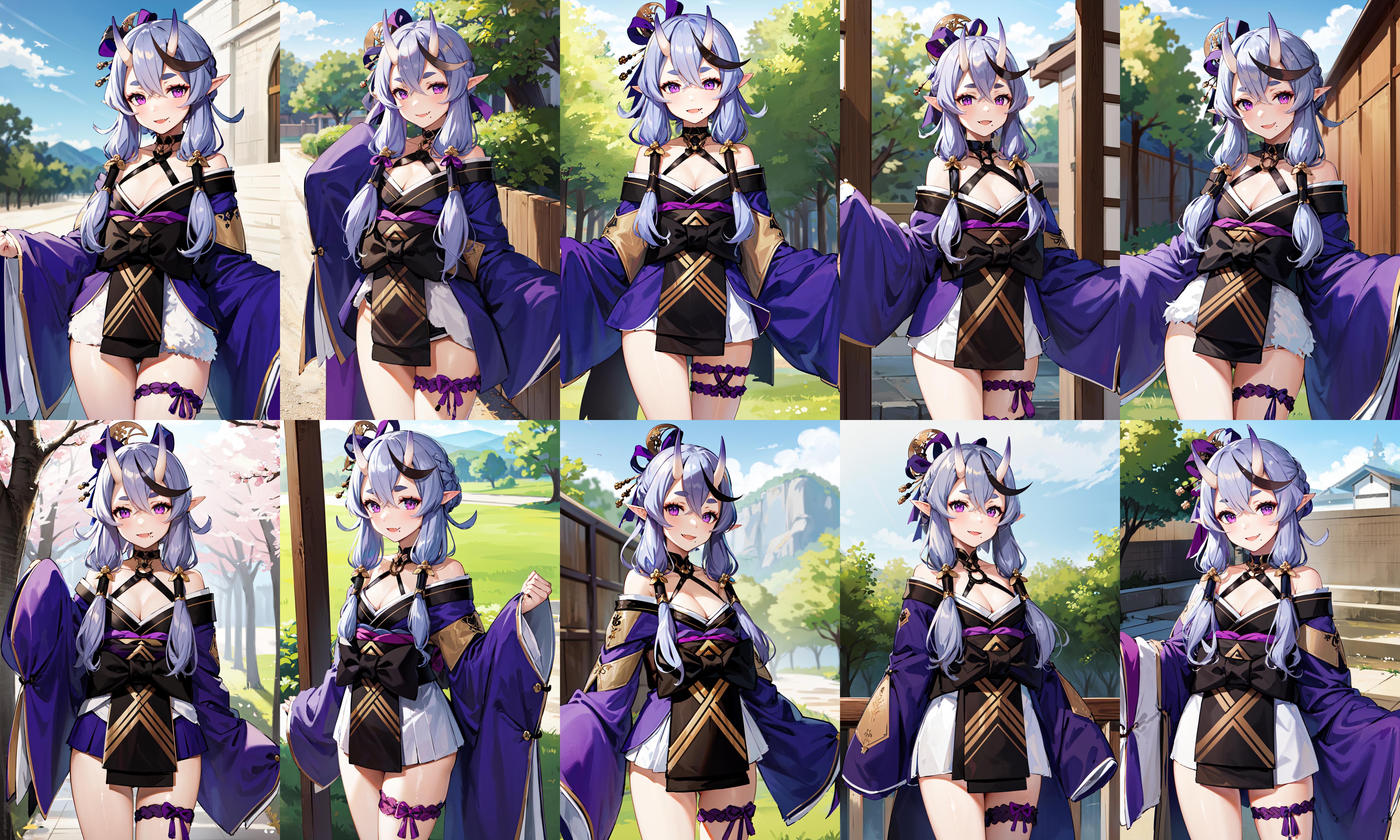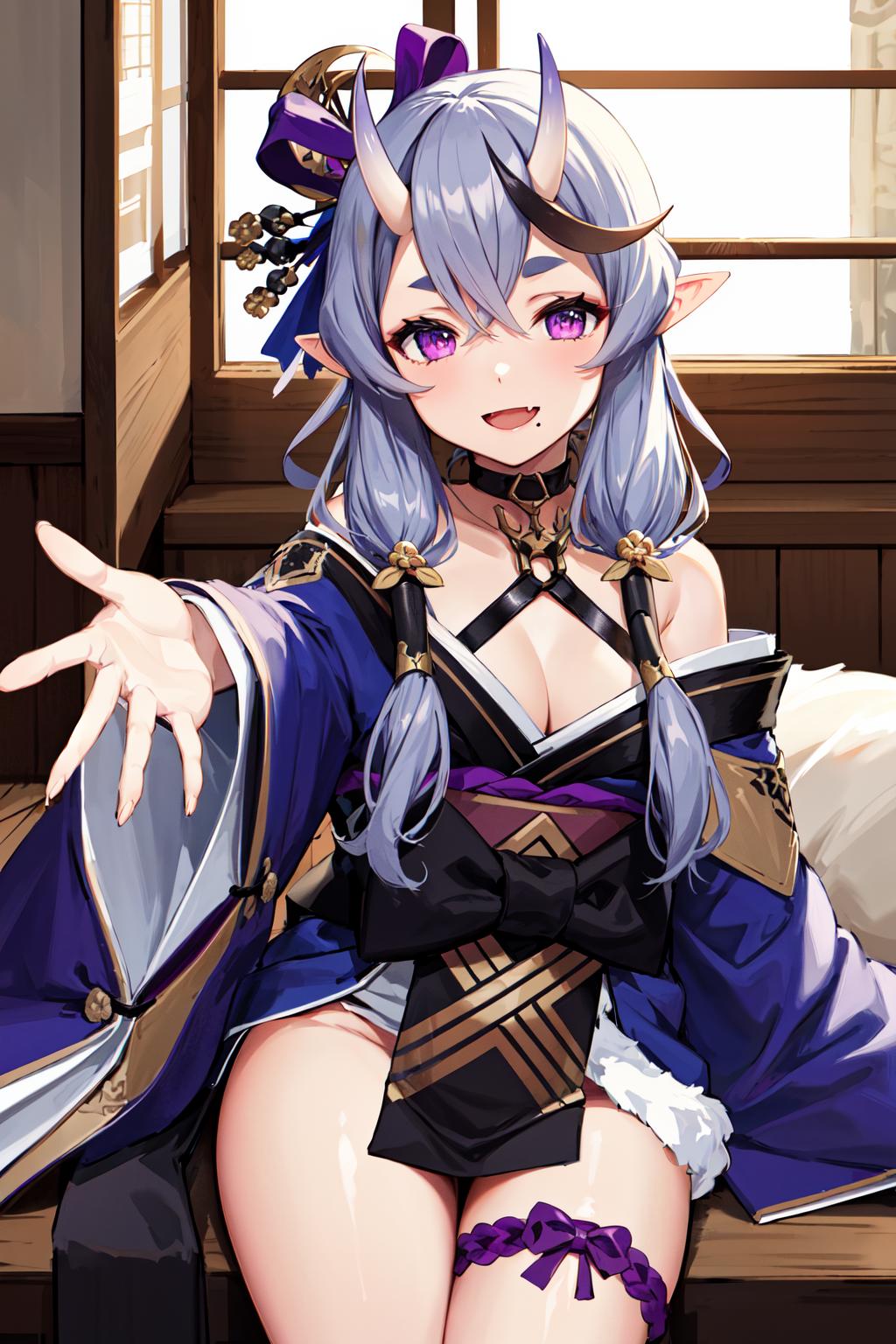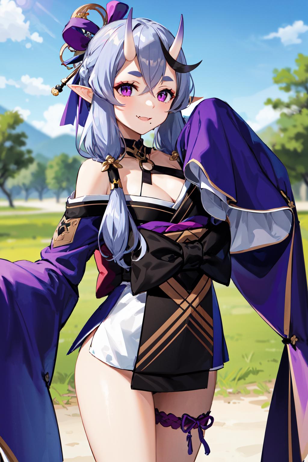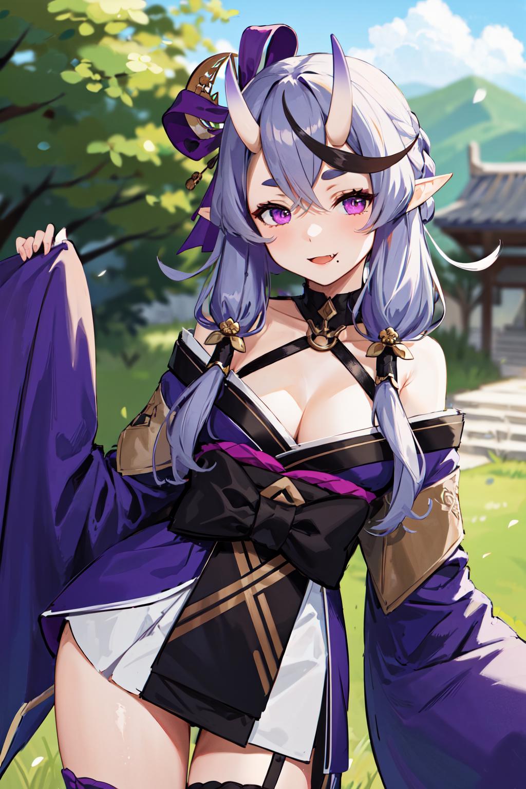 outfit1aamikoto, low twintails, crescent hair ornament, bow, purple ribbon, short eyebrows, fang, off shoulder, purple kimono, short kimono, cleavage, sleeves past wrists, obi, sash, thigh strap