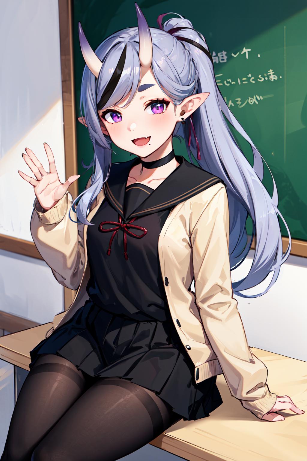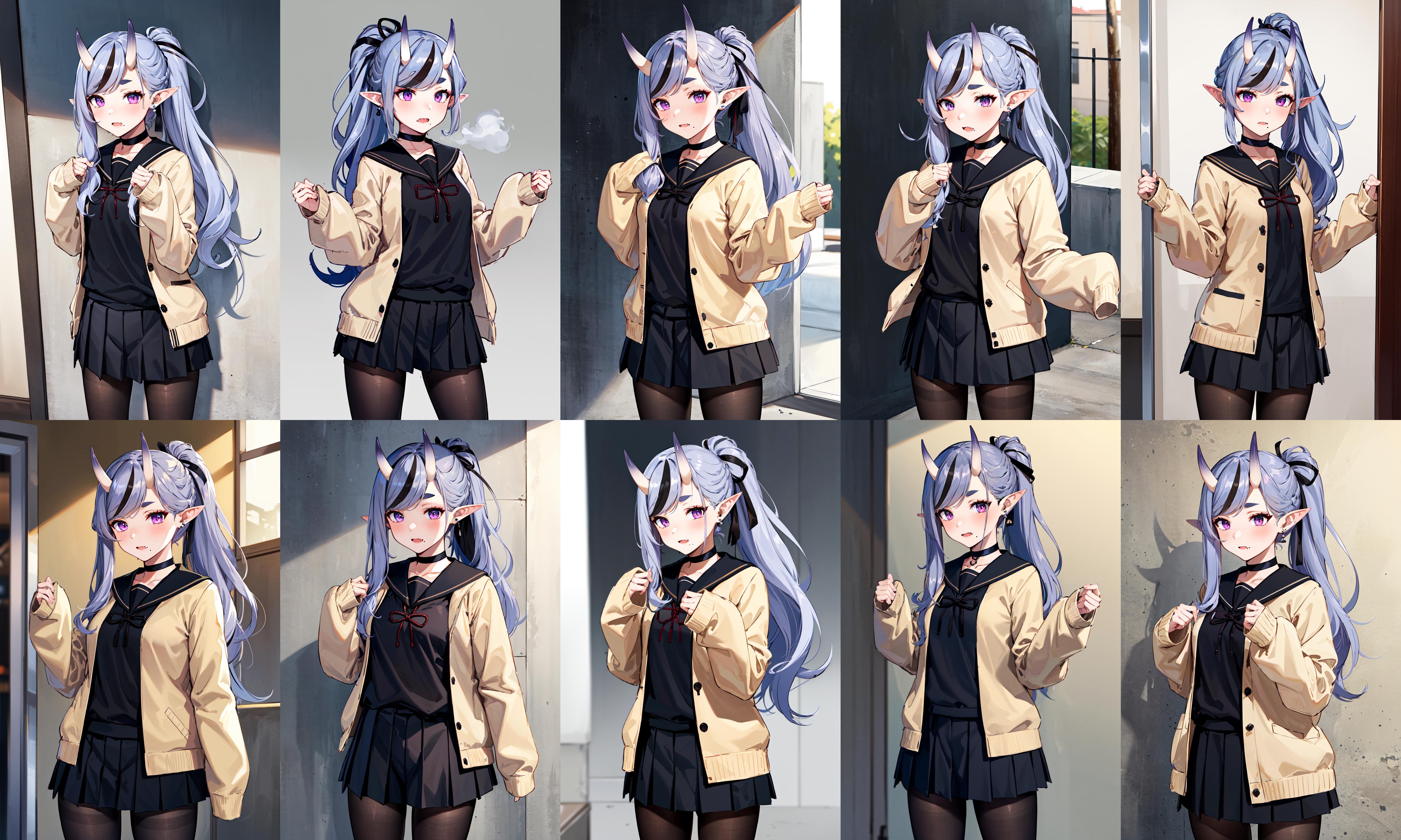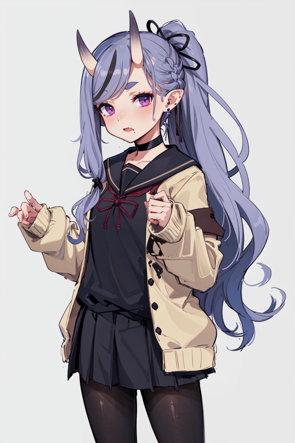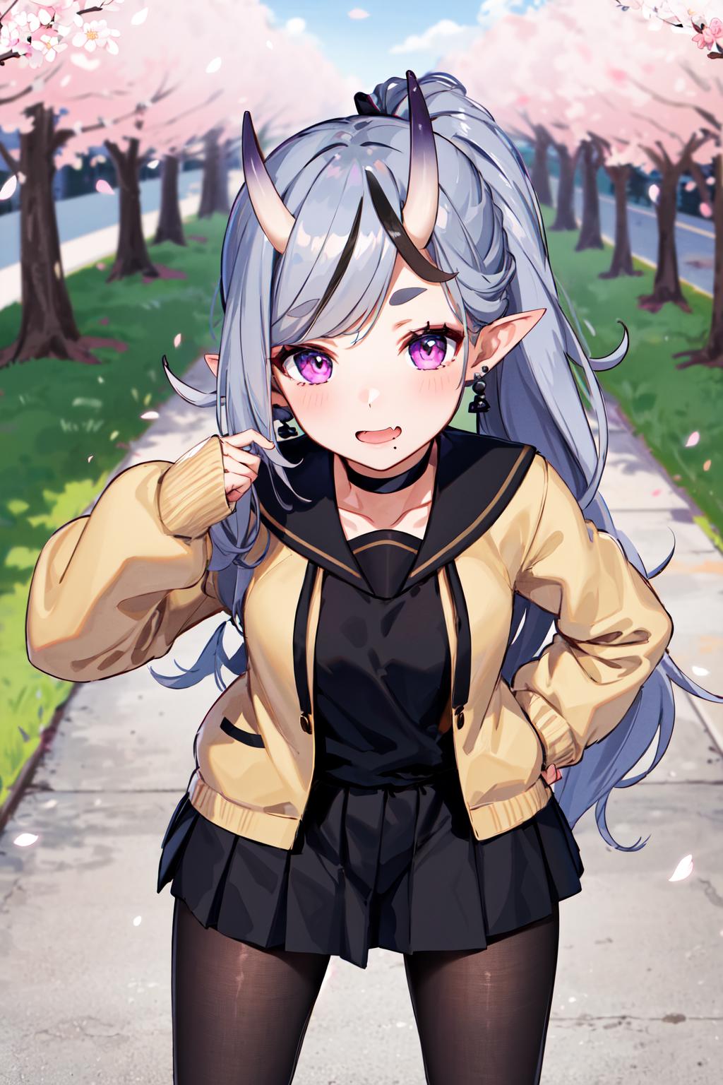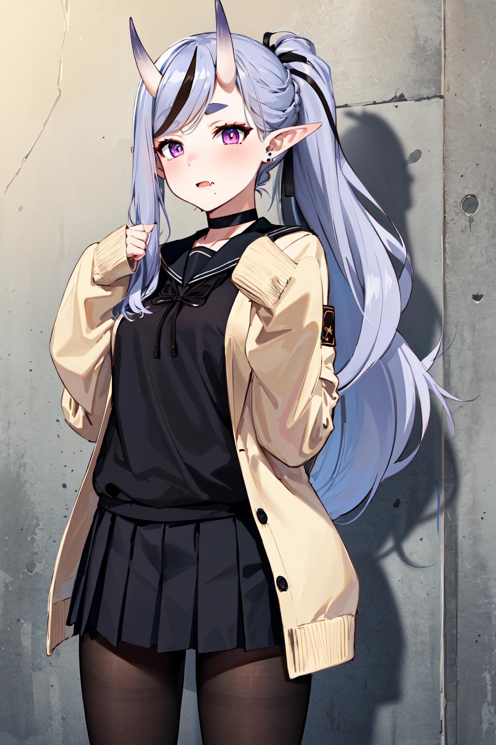 outfit2bbmikoto, ponytail, short eyebrows, earrings, fang, black choker, black sailor collar, cardigan, open clothes, sleeves past wrists, school uniform, (black shirt:1.1), pleated skirt, black skirt, black pantyhose