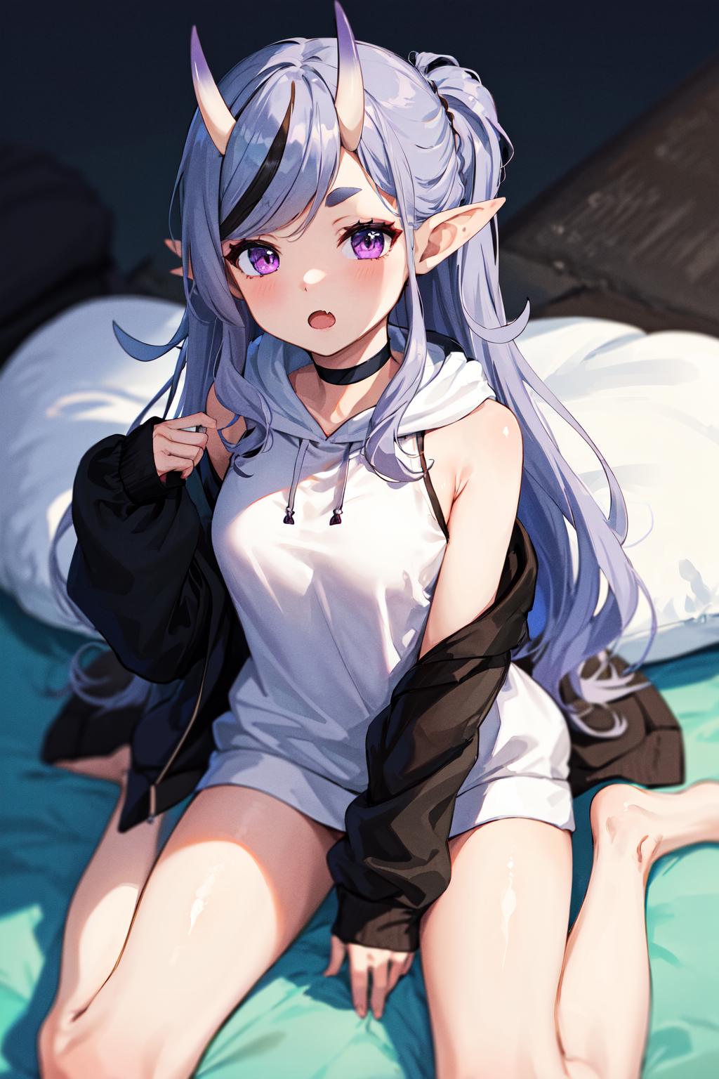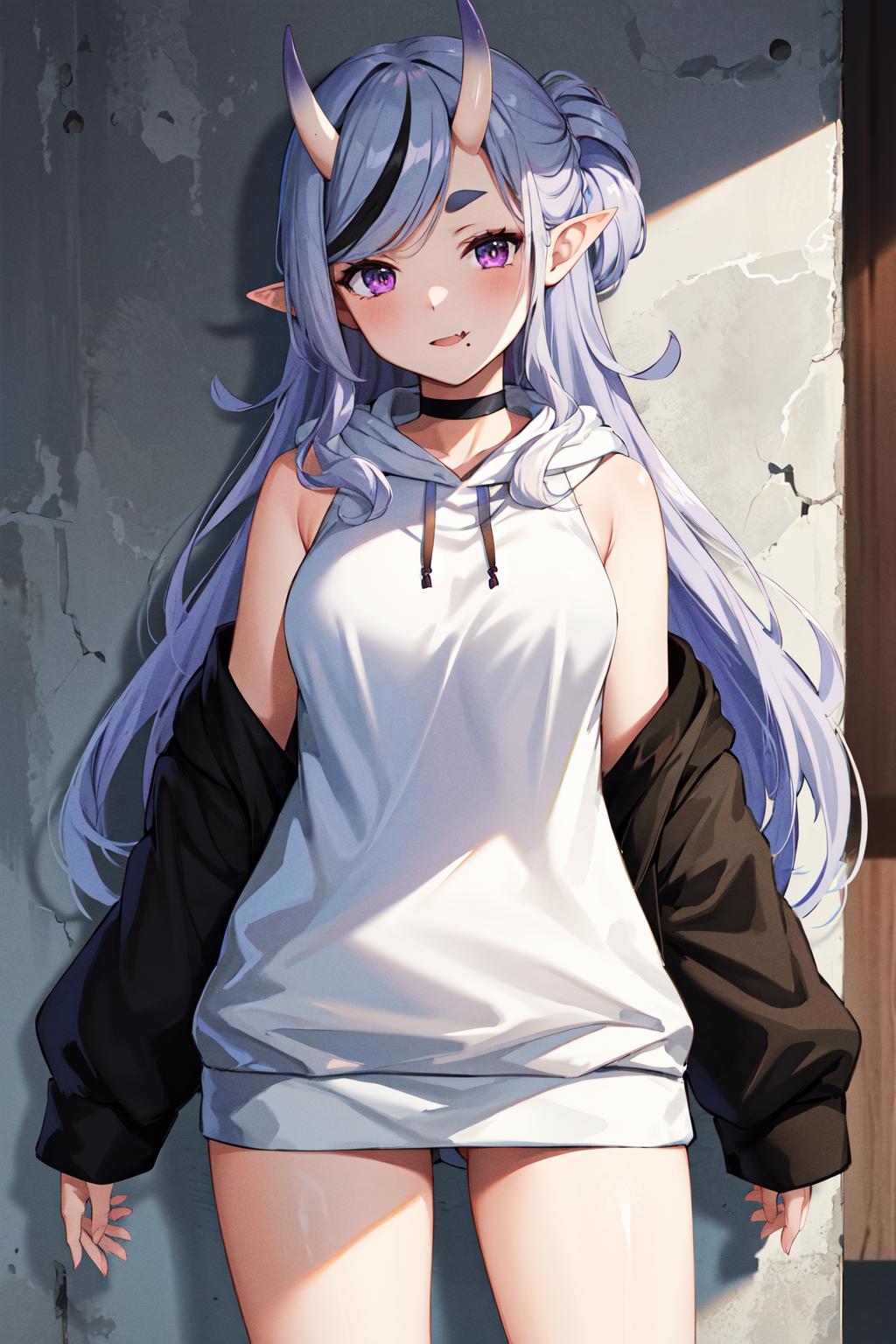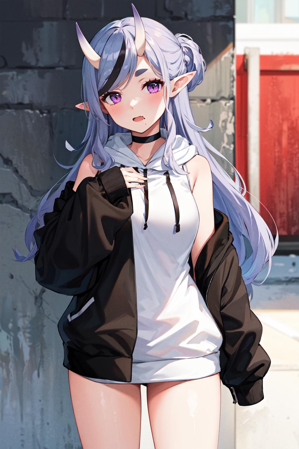 outfit4ddmikoto, short eyebrows, fang, black choker, off shoulder, bare shoulders, sleeveless hoodie, (white hoodie:1.1), black jacket, open clothes, black socks