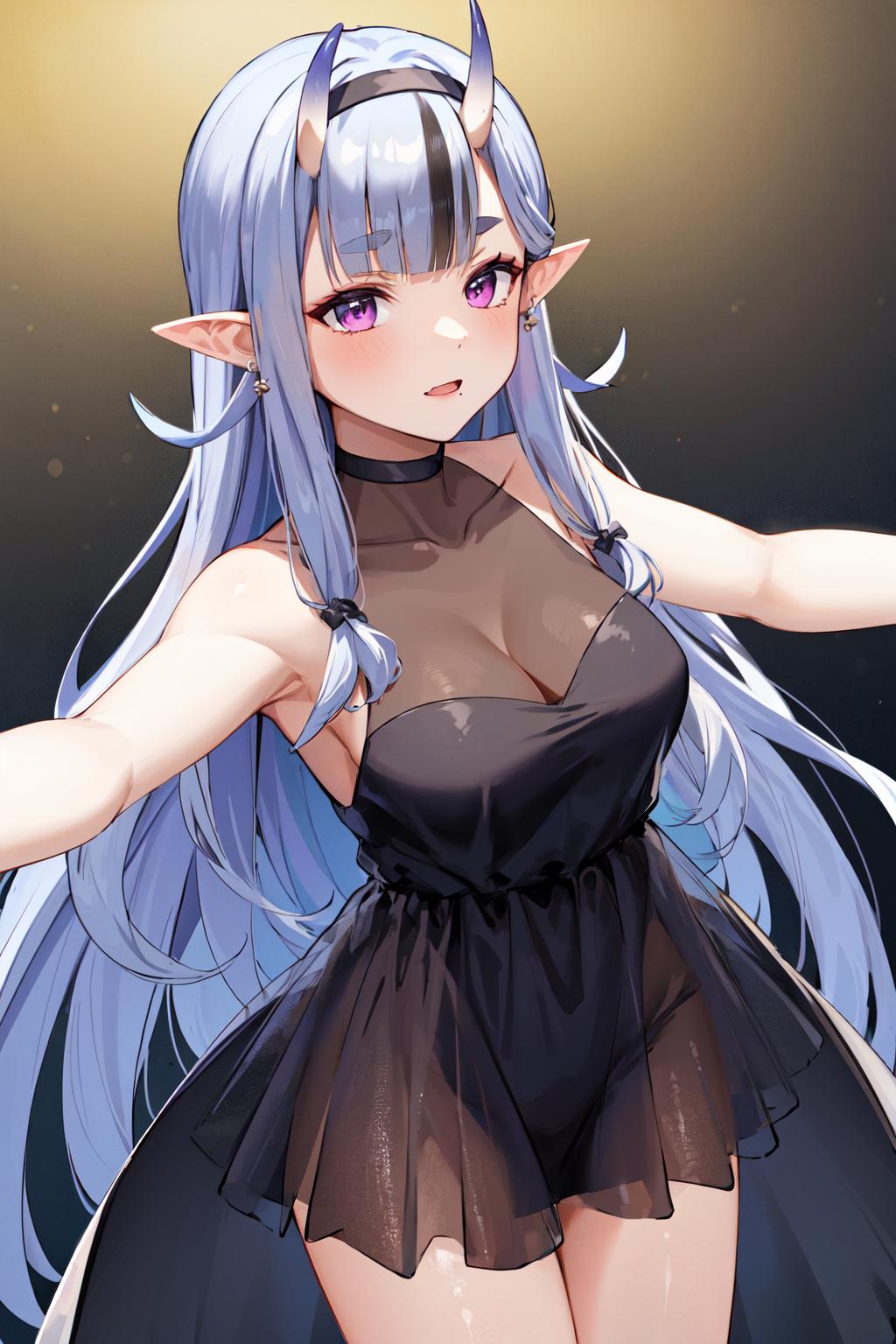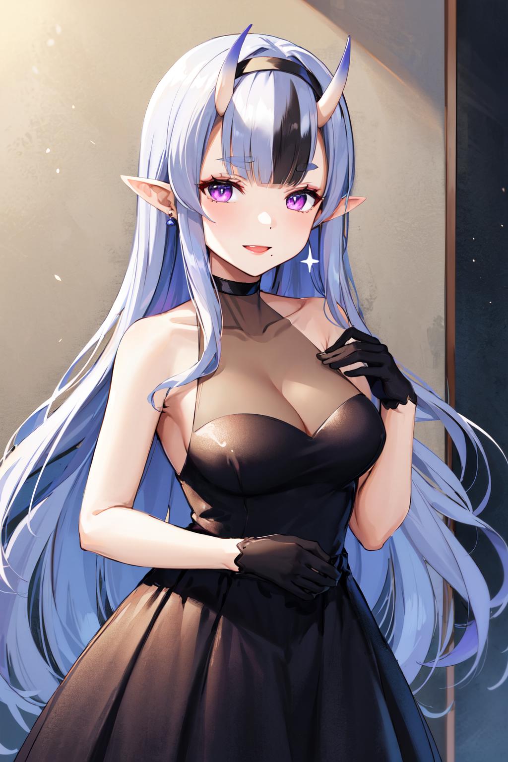outfit3ccmikoto, streaked hair, very long hair, straight hair, hairband, short eyebrows, earrings, collarbone, bare shoulders, black dress, sleeveless dress, see-through, cleavage, (black gloves:1.1)