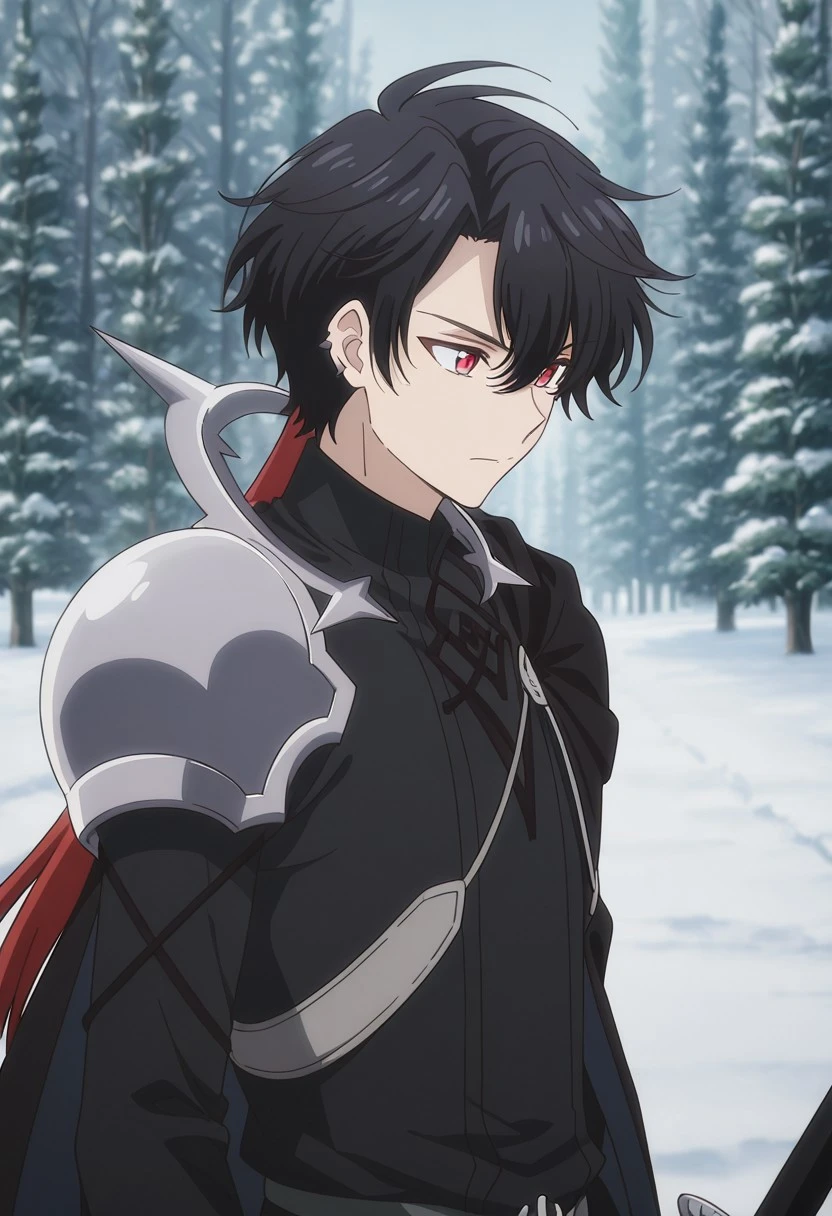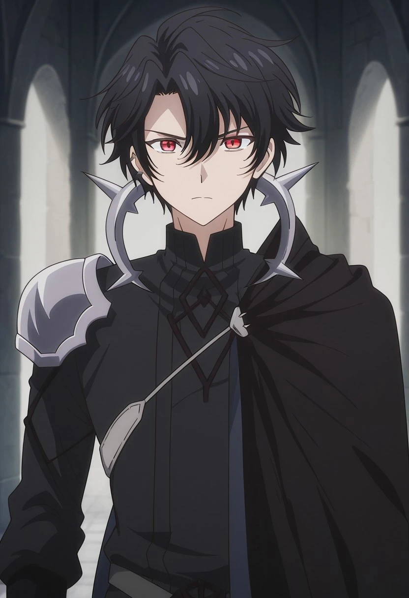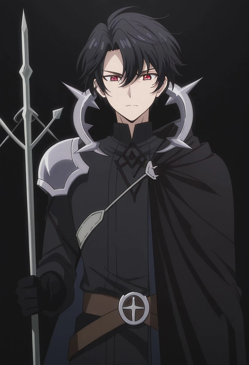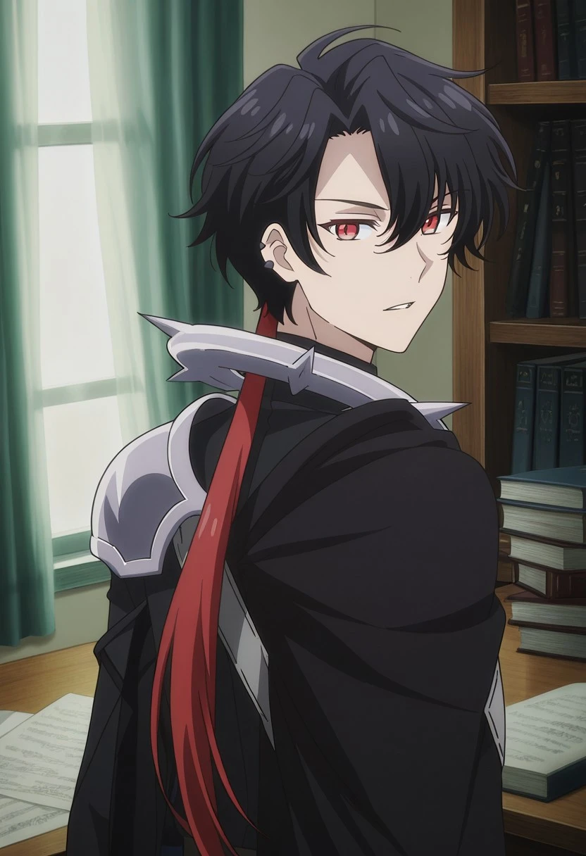 1boy, male focus, solo, red eyes, black hair, ear piercing, ponytail, multicolored hair, red hair, neck armor, spikes, mandarin collari, black robe, shoulder cape, black cape, shoulder armor, belt, black gloves, black footwear,