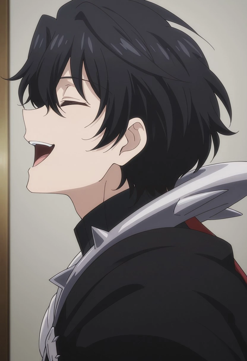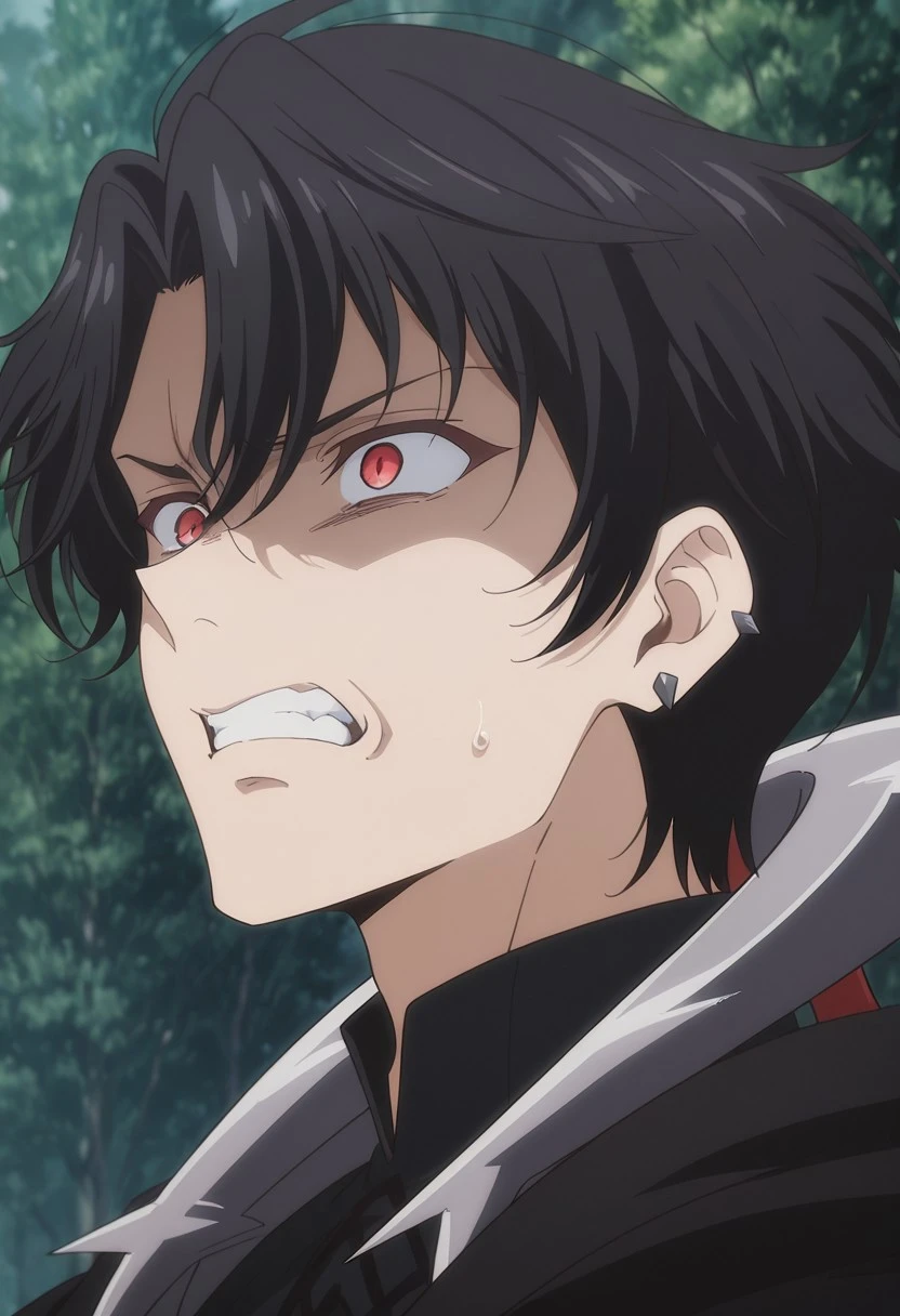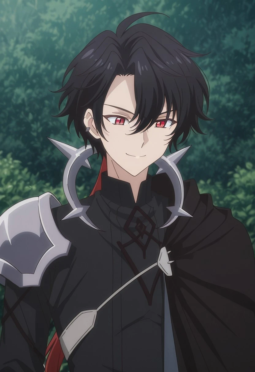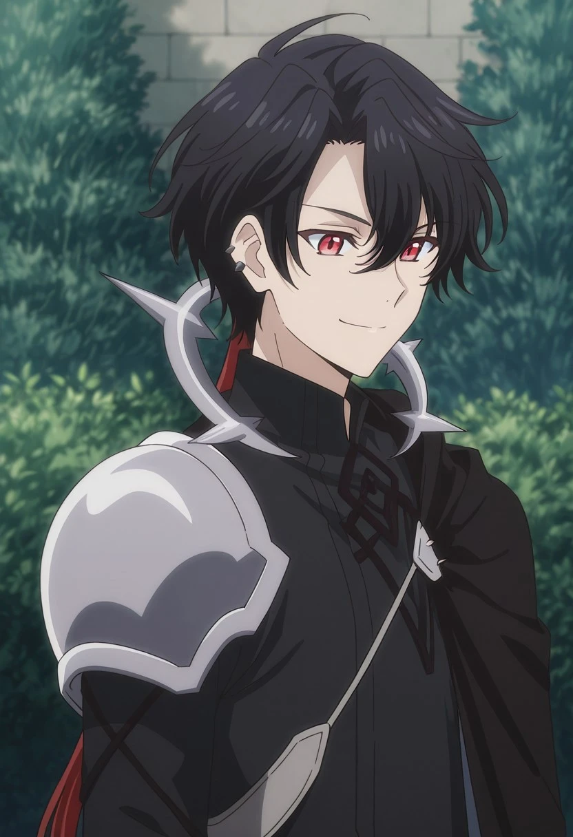 1boy, male focus, solo, red eyes, black hair, ear piercing, ponytail, multicolored hair, red hair, neck armor, spikes, mandarin collari, black robe, shoulder cape, black cape, shoulder armor, belt, black gloves, black footwear,