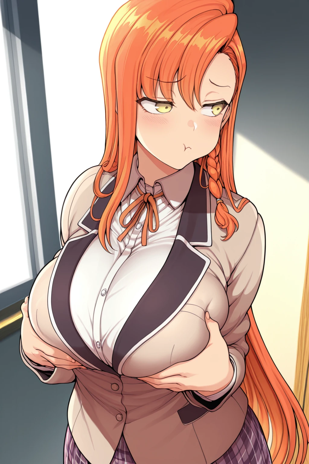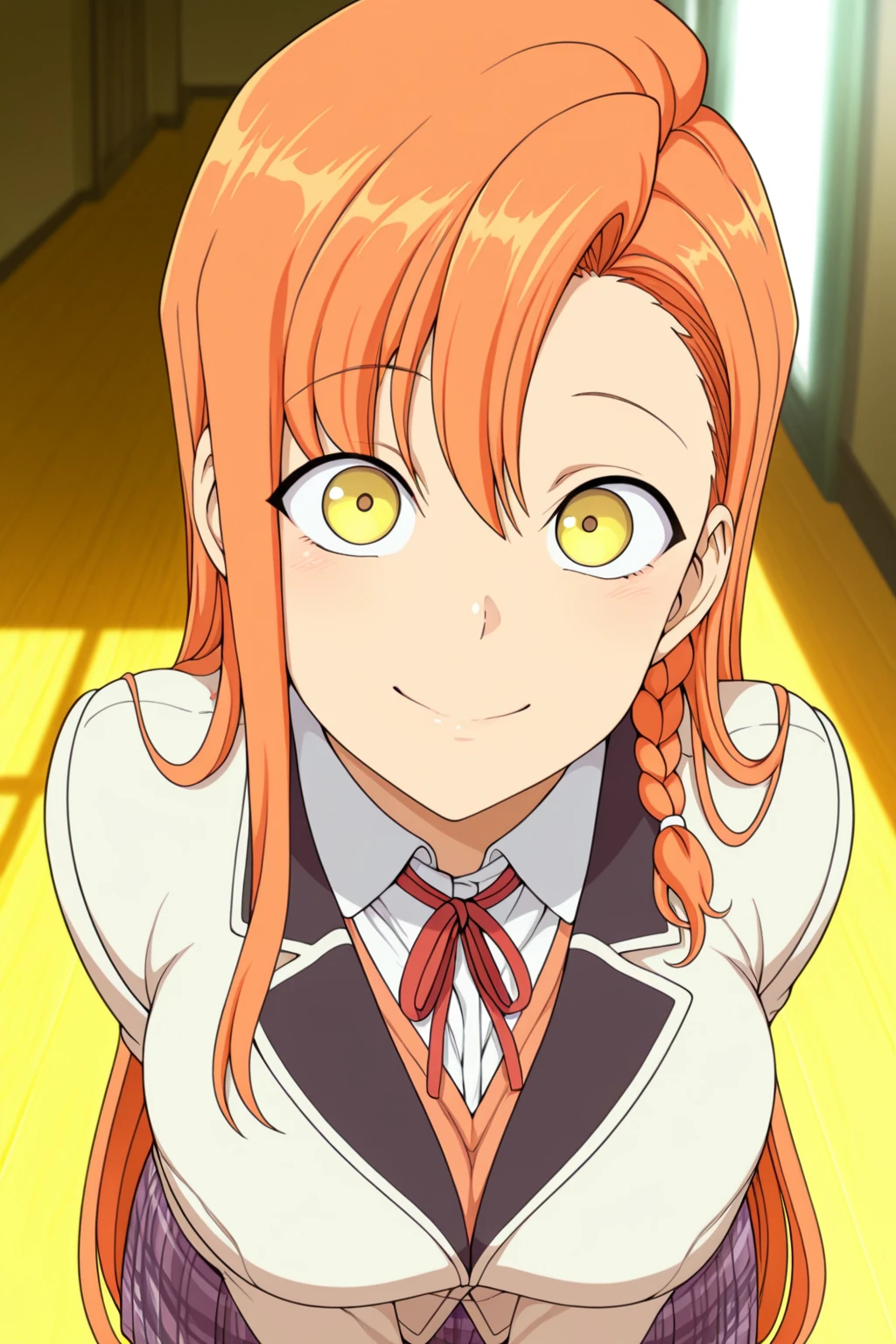 1girl, yuuki, long hair, braid, side braid, orange hair, yellow eyes, large breasts, school uniform, blazer, jacket, red ribbon, shirt, plaid skirt,