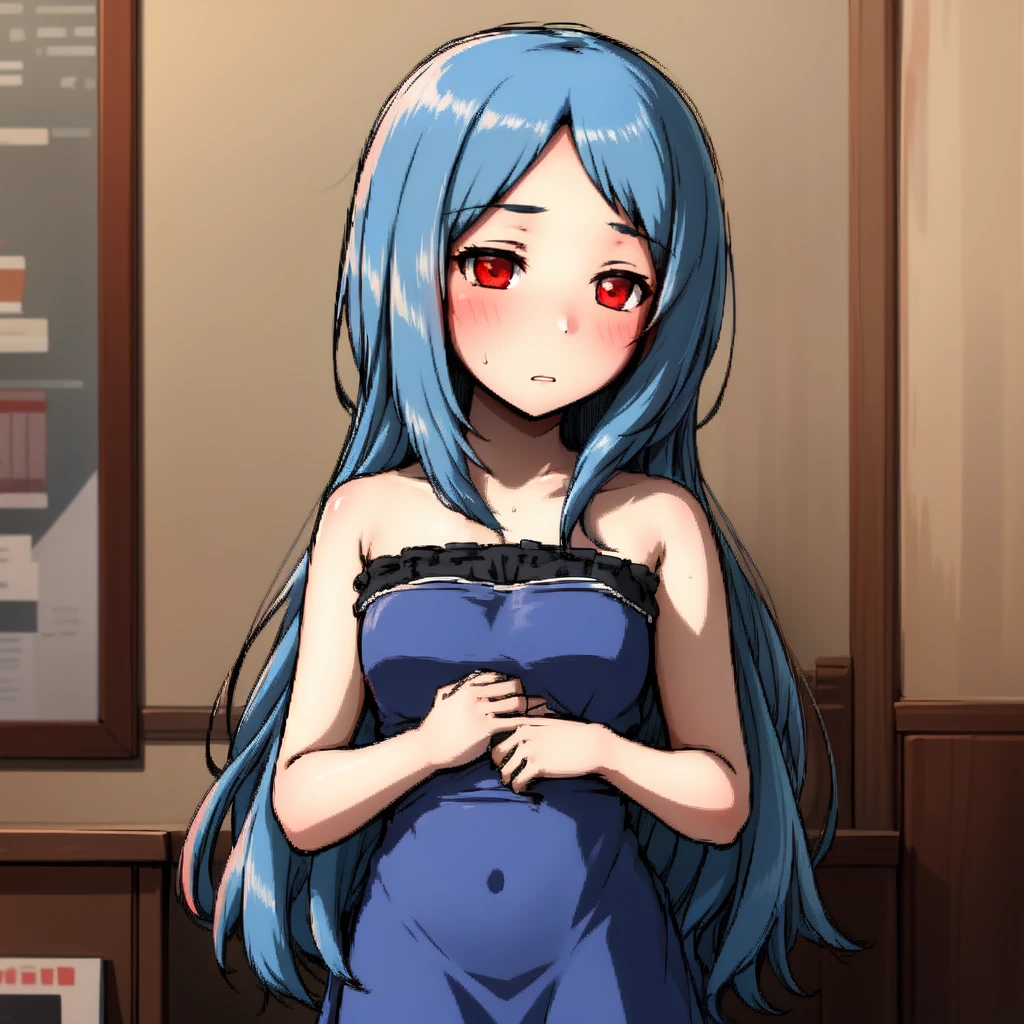 a young woman dressed in blue, indoors, room background, 1girl, solo, long hair, blush, blue hair, red eyes, dress,