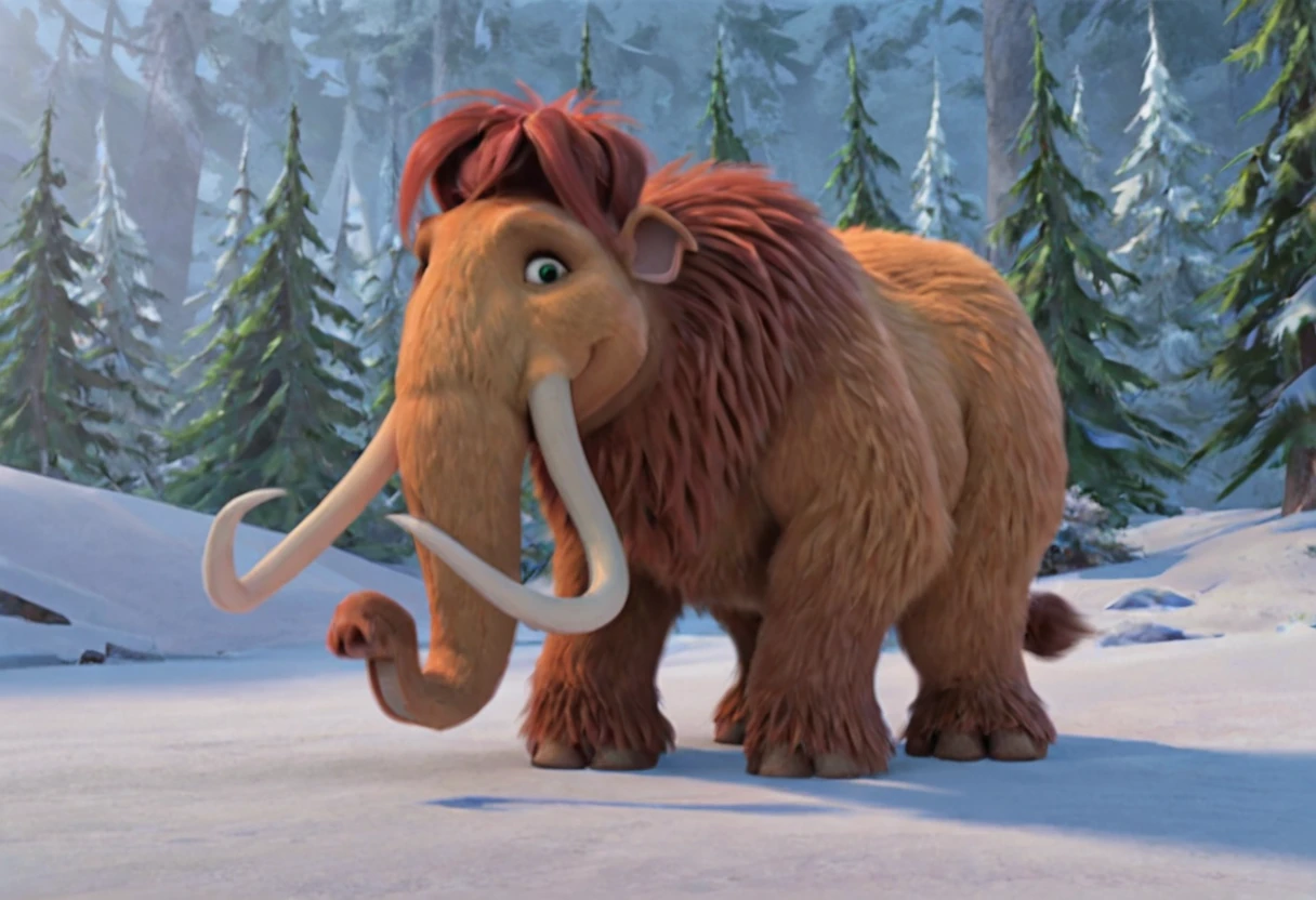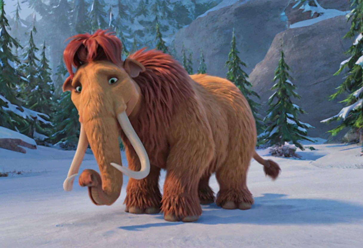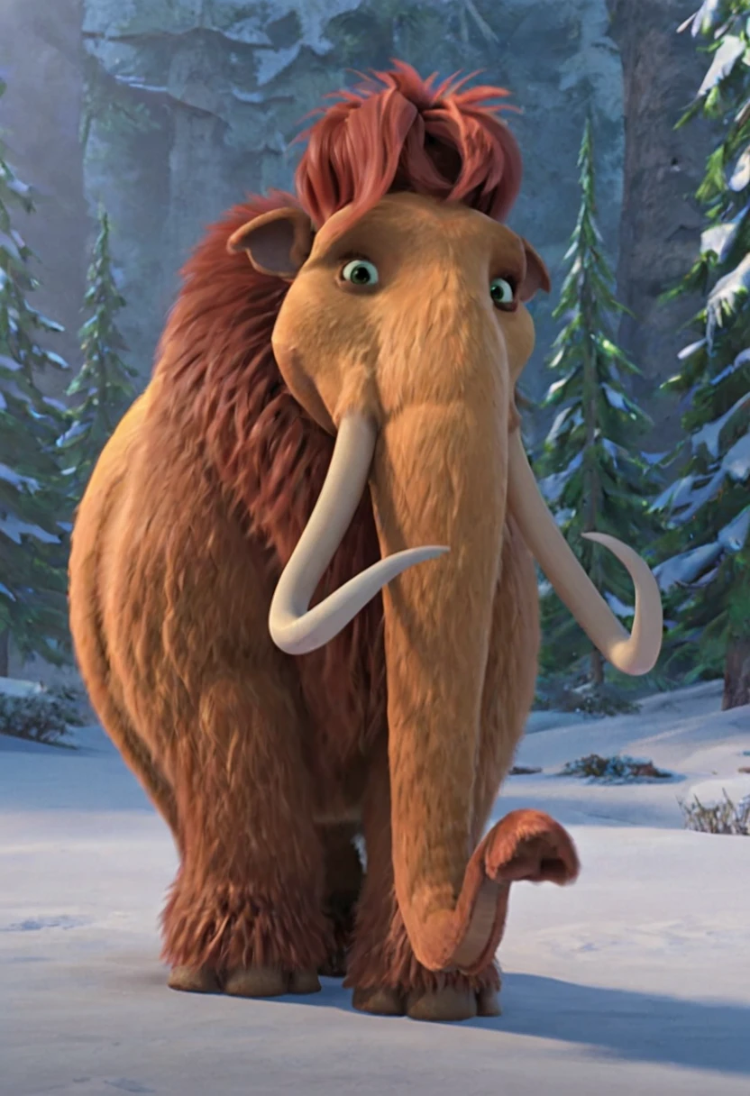 (ellie:1.2, mammoth), smiling at viewer, furry, female, green eyes, furry body, orange fur, red hair, elephant, trunk nose, trunk, tusks, mammoth tusks, elephant tusks, elephant trunk, mammoth trunk, tail,