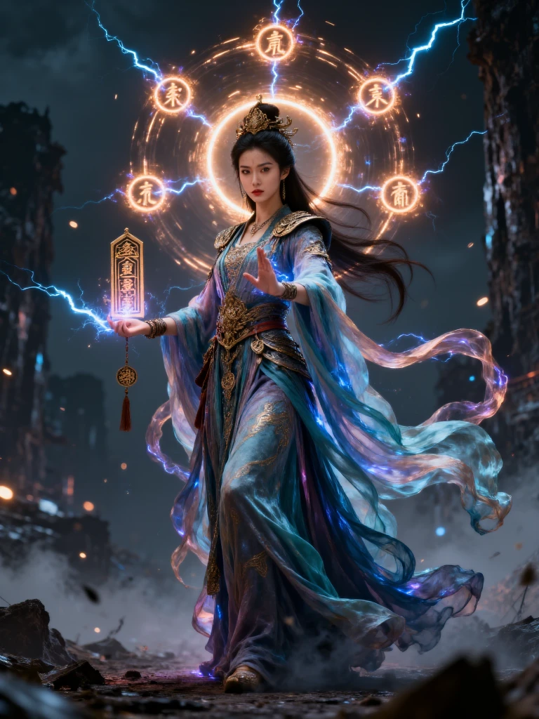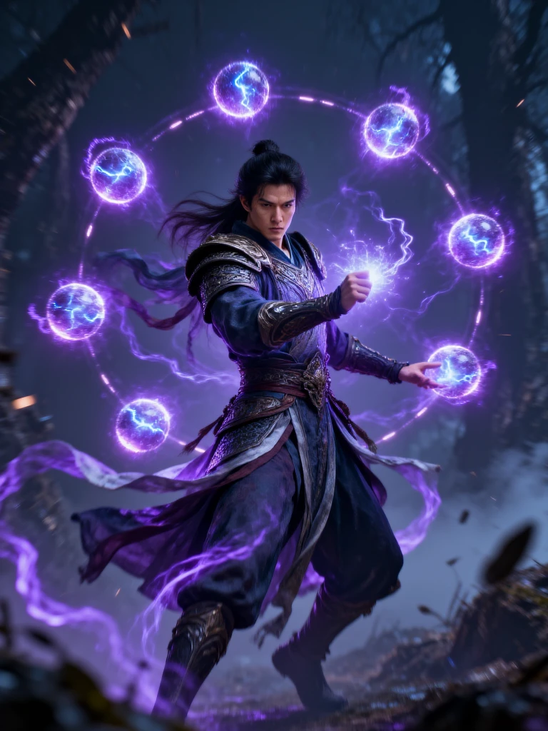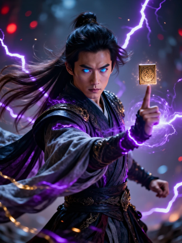 this is a highly detailed cgi digital artwork depicting a fierce, young asian male warrior with long, flowing black hair and glowing blue eyes, he is clad in an ornate, dark, medieval-style robe with intricate golden patterns, and he holds a small, glowing, golden square with an intricate design in his right hand, bright purple lightning crackles around him, illuminating his intense expression and the swirling, dynamic background, the background is a blur of dark colors with red and white bokeh lights, adding a sense of motion and energy, the overall style is reminiscent of fantasy action films, with a focus on dramatic lighting and dynamic composition