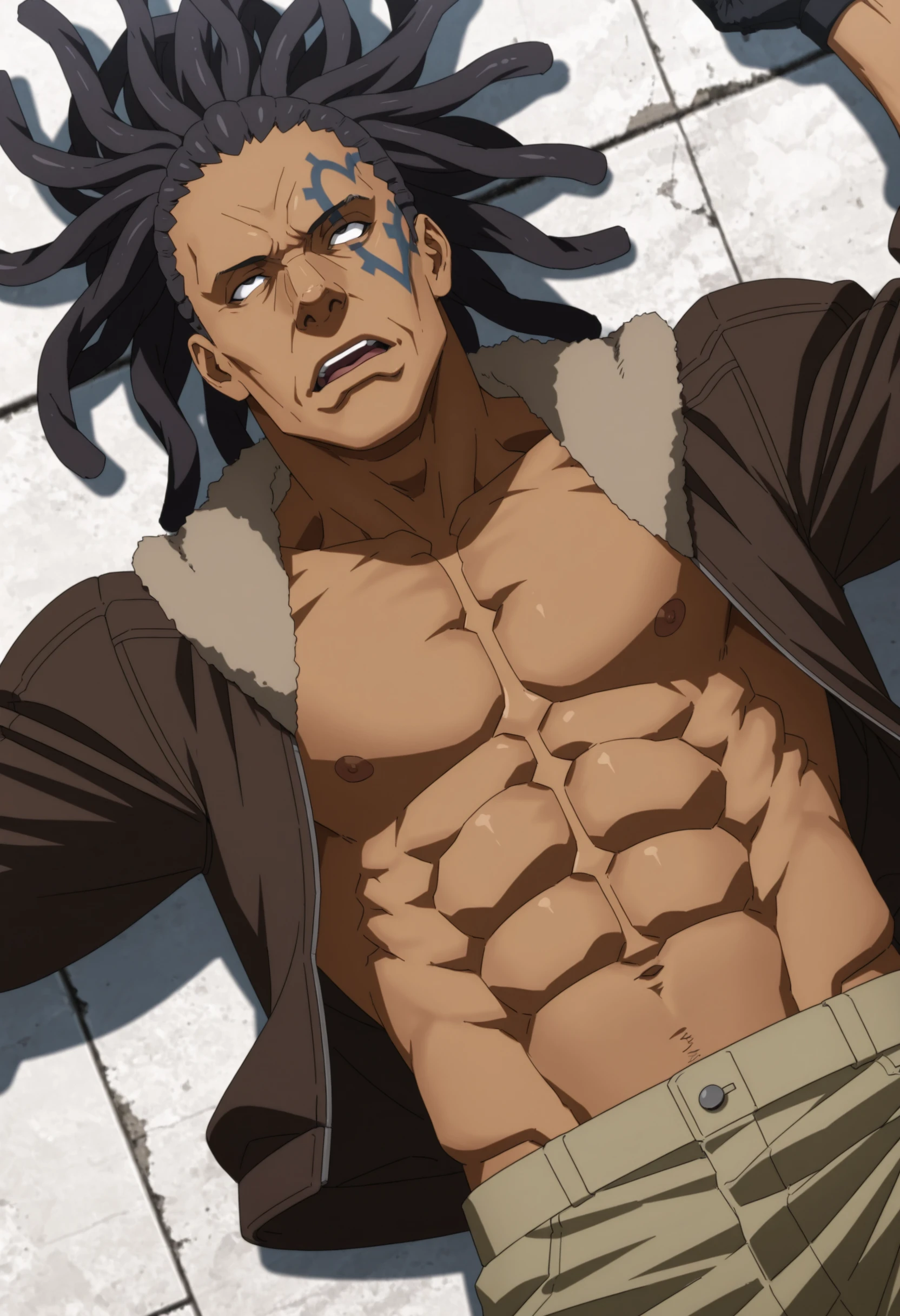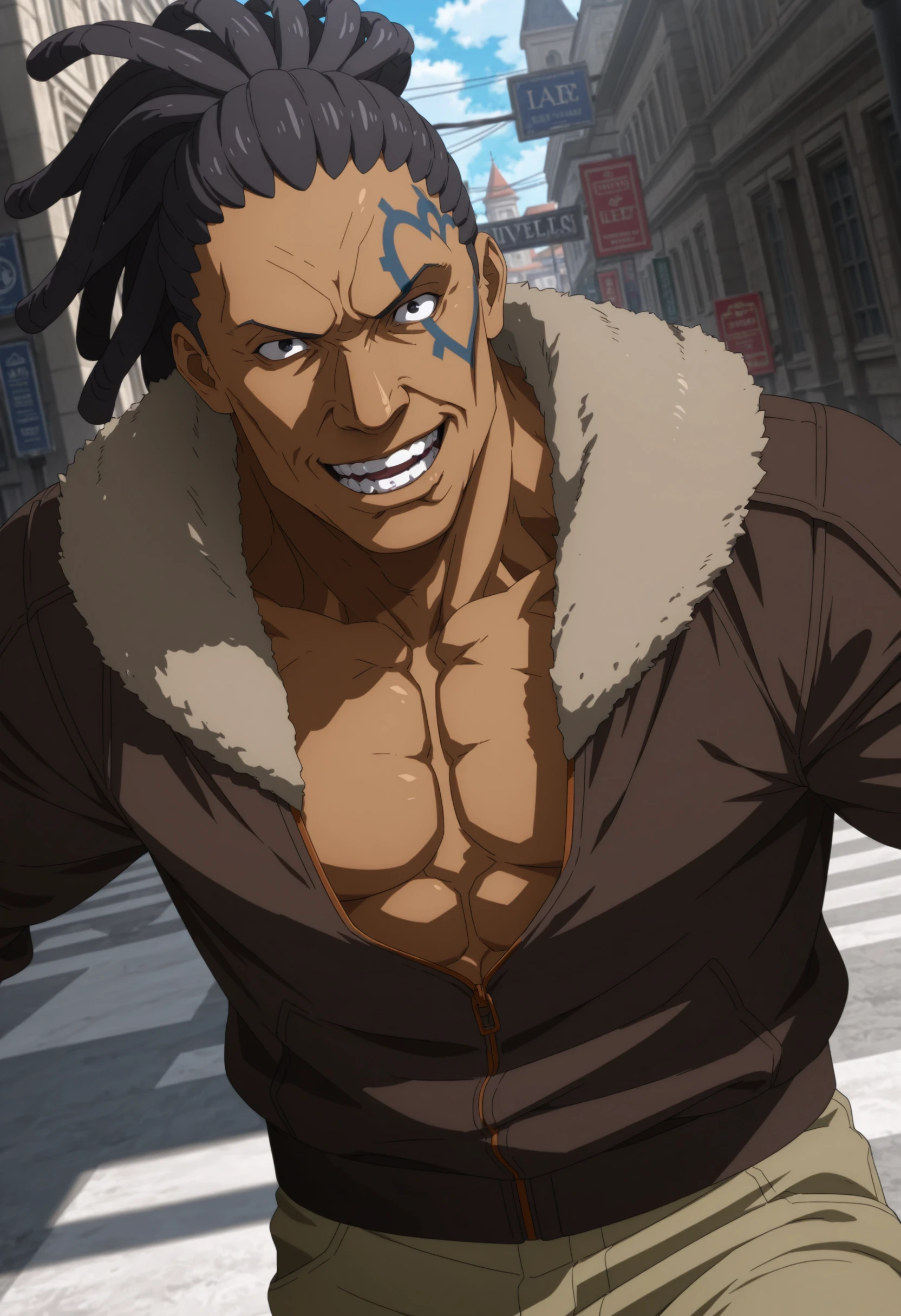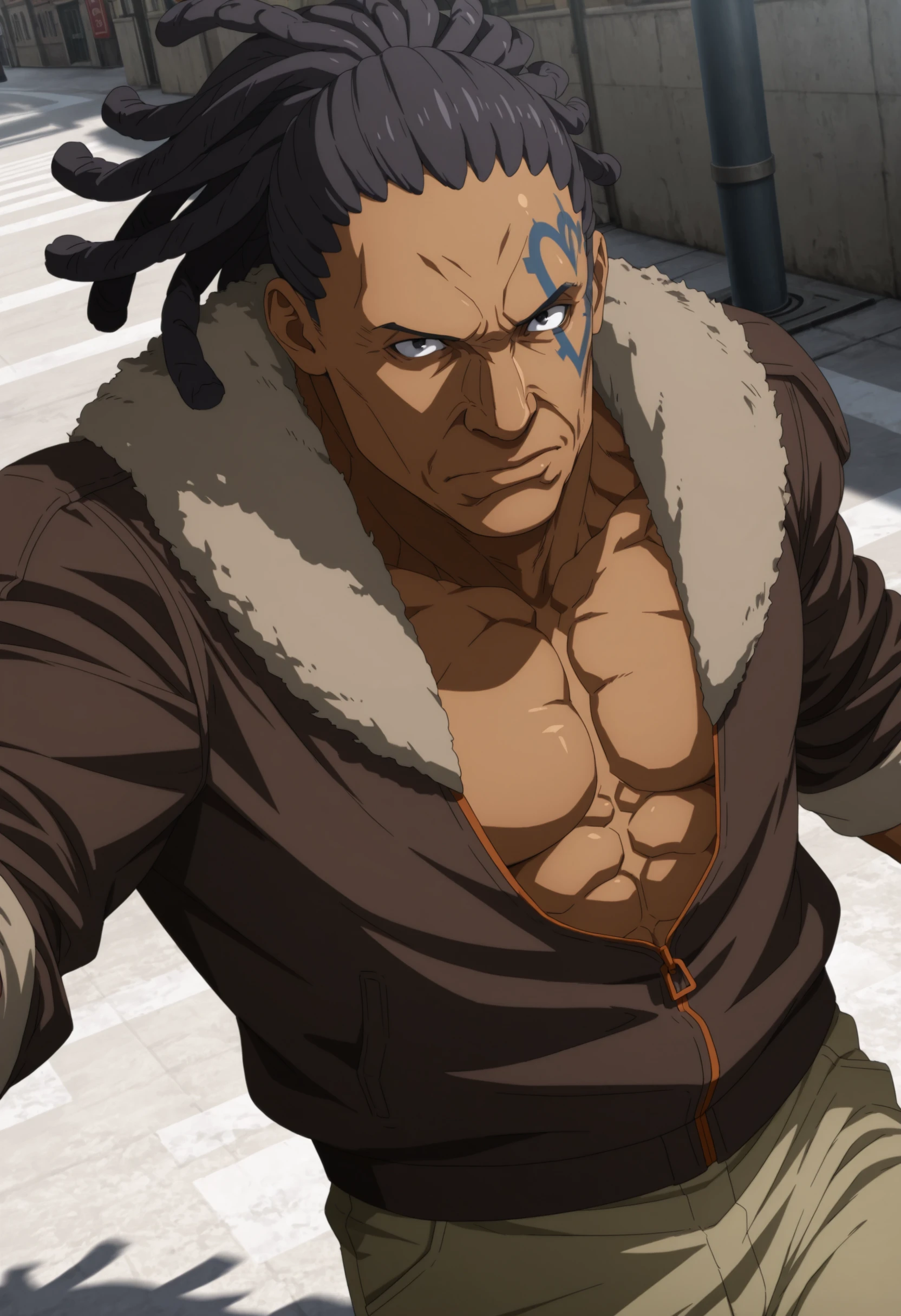 black hair, black eyes, dark skin, dreadlocks, blue heart-shape outline tattoo on left face, brown jacket with fur collar, revealing chest, tan pants