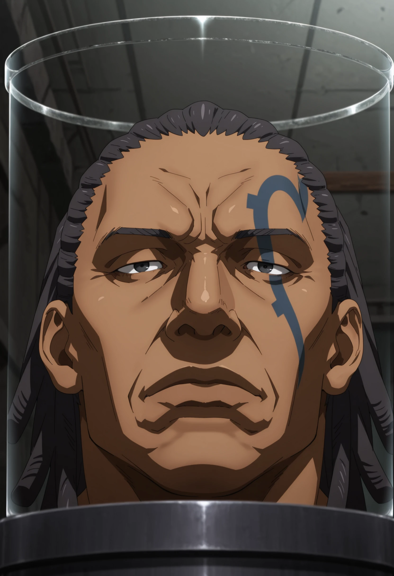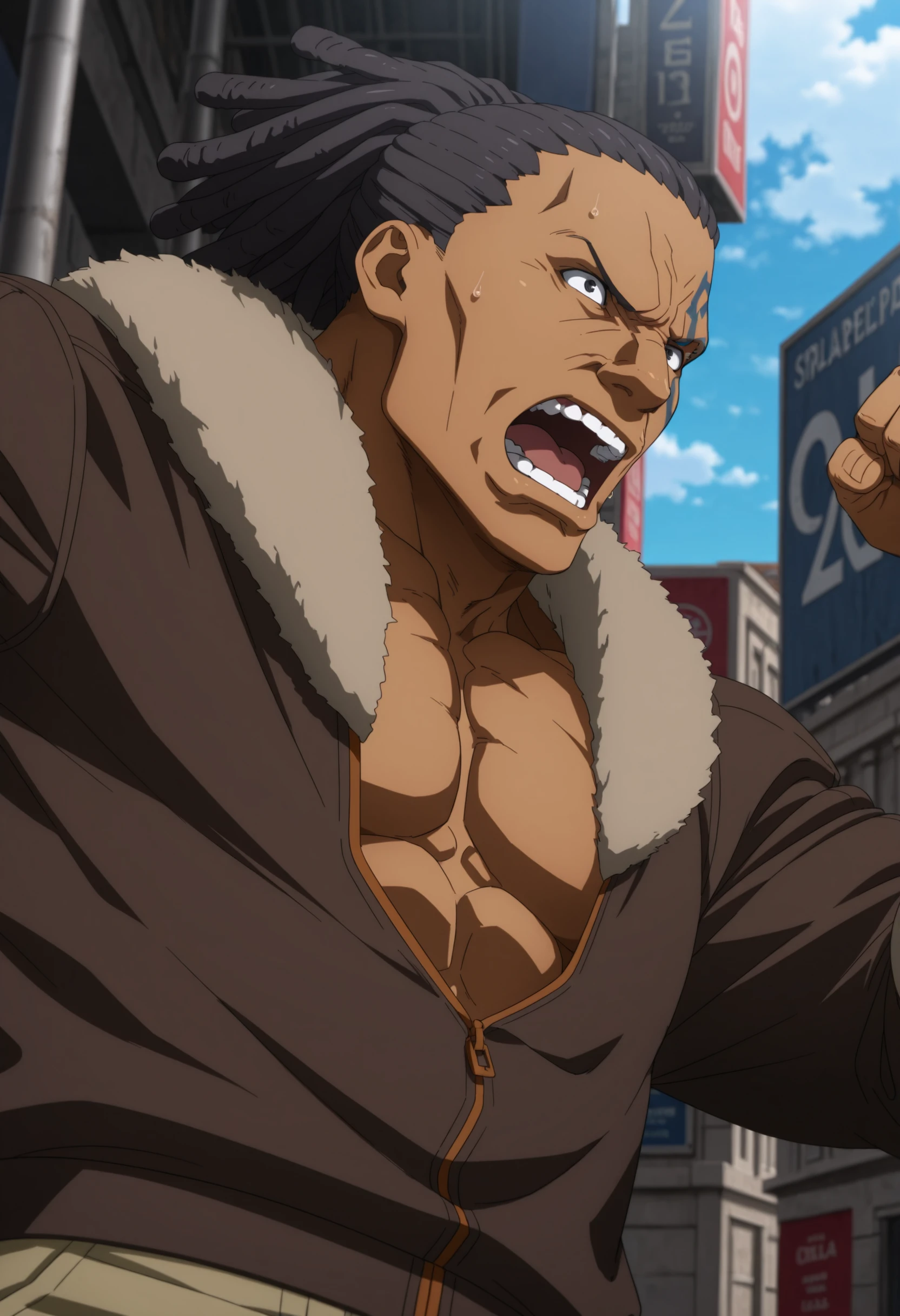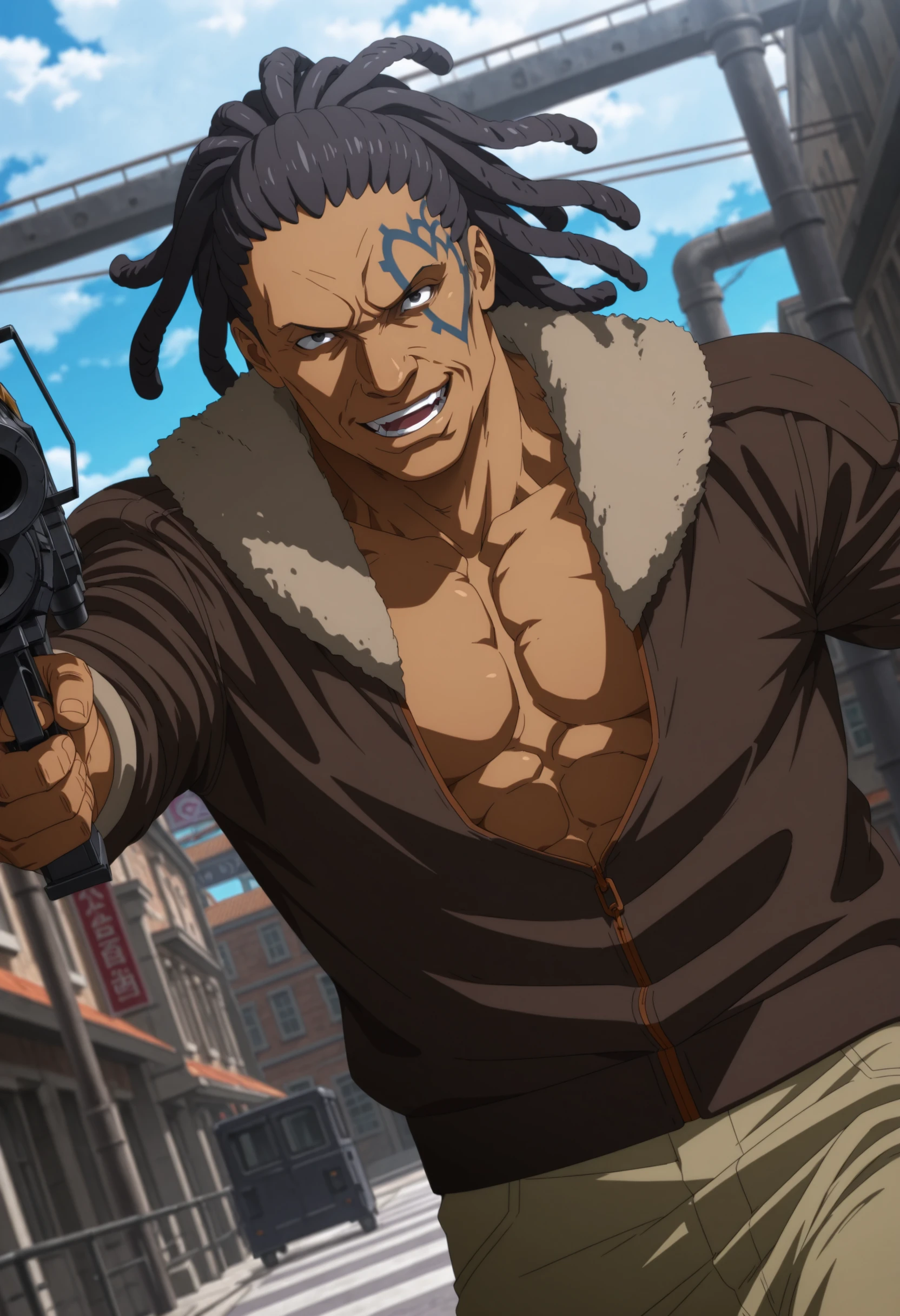 black hair, black eyes, dark skin, dreadlocks, blue heart-shape outline tattoo on left face, brown jacket with fur collar, revealing chest, tan pants