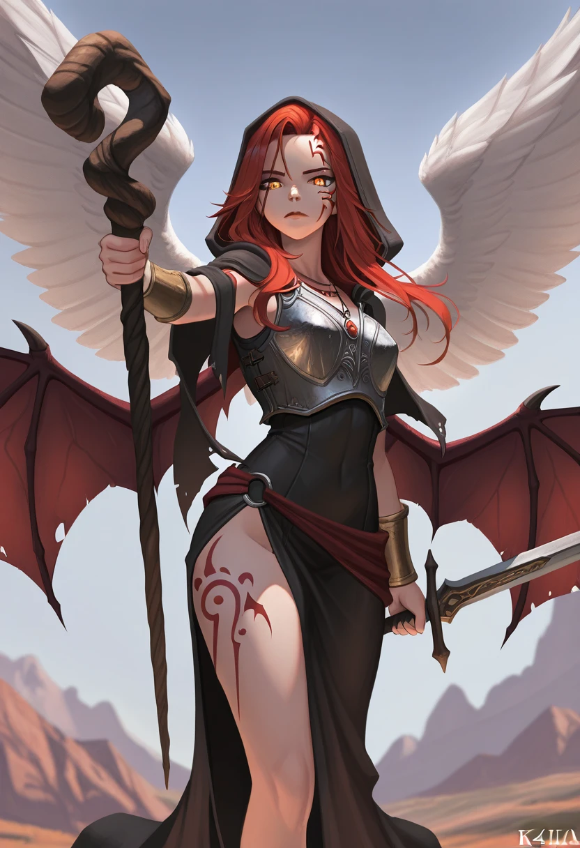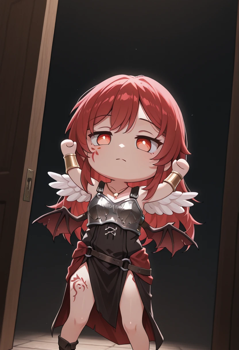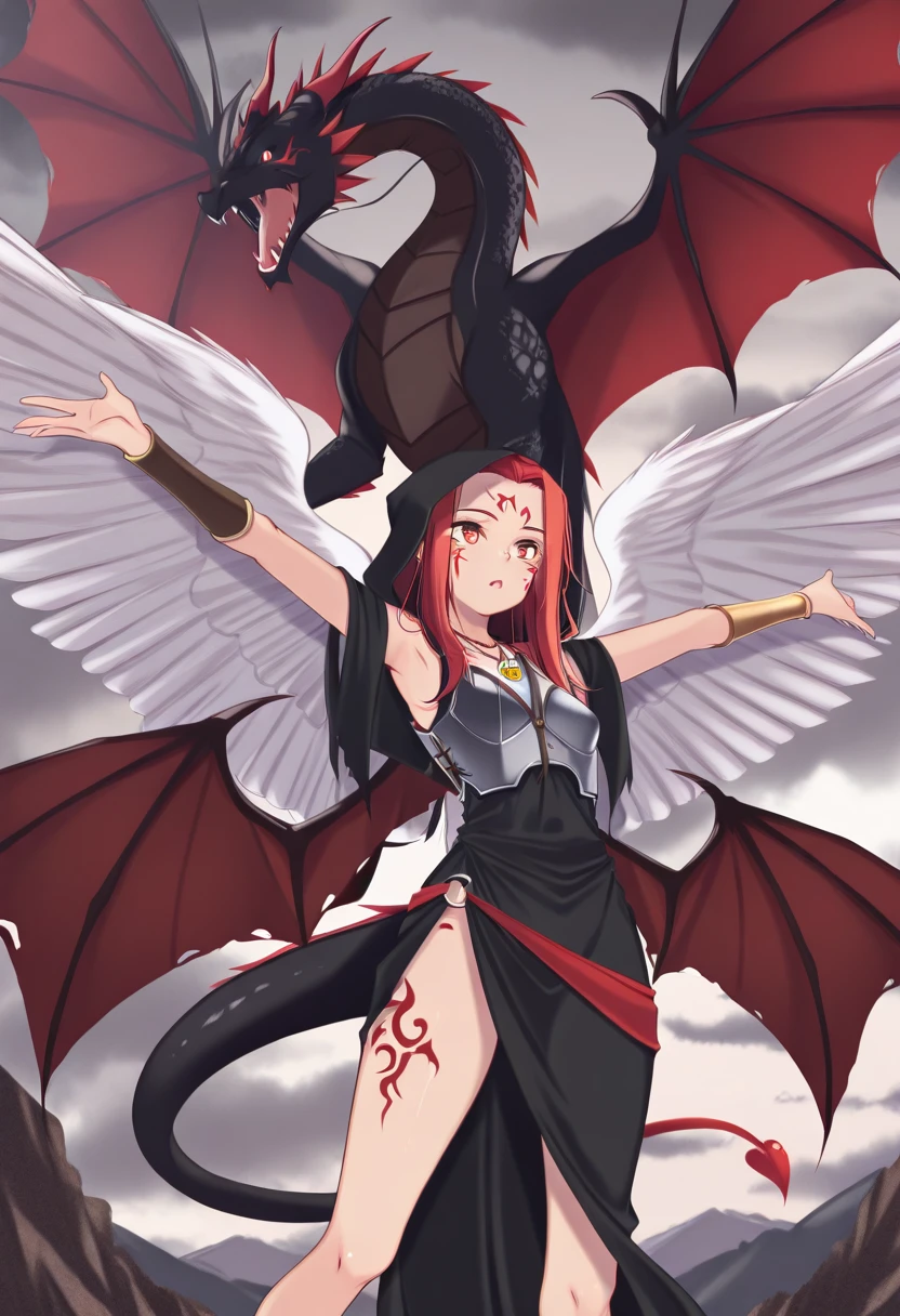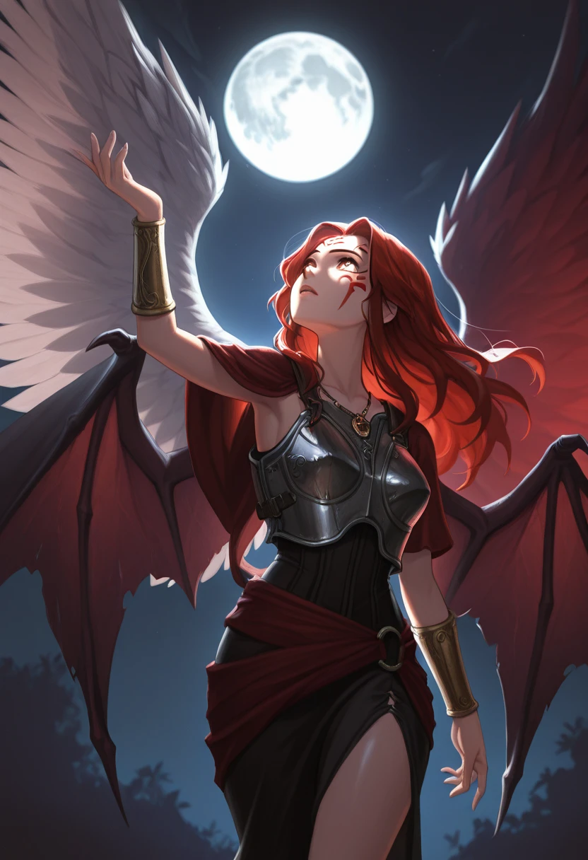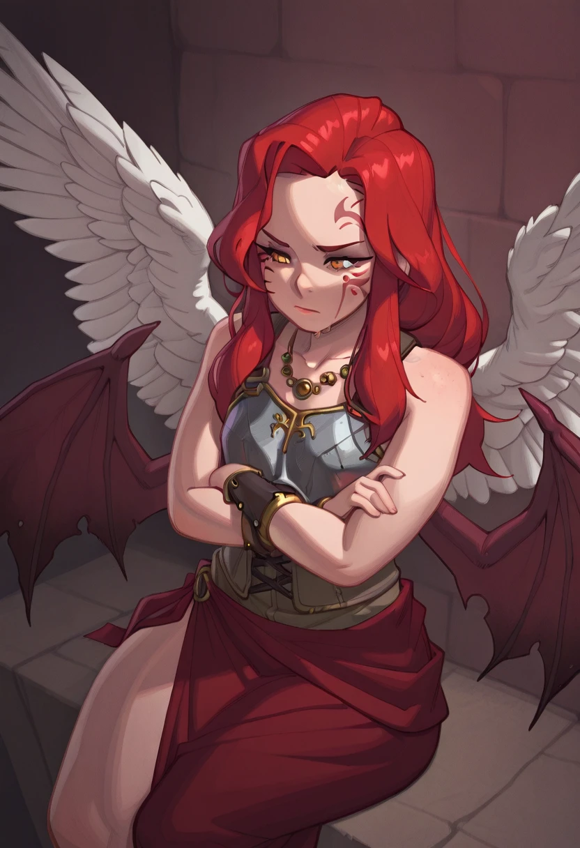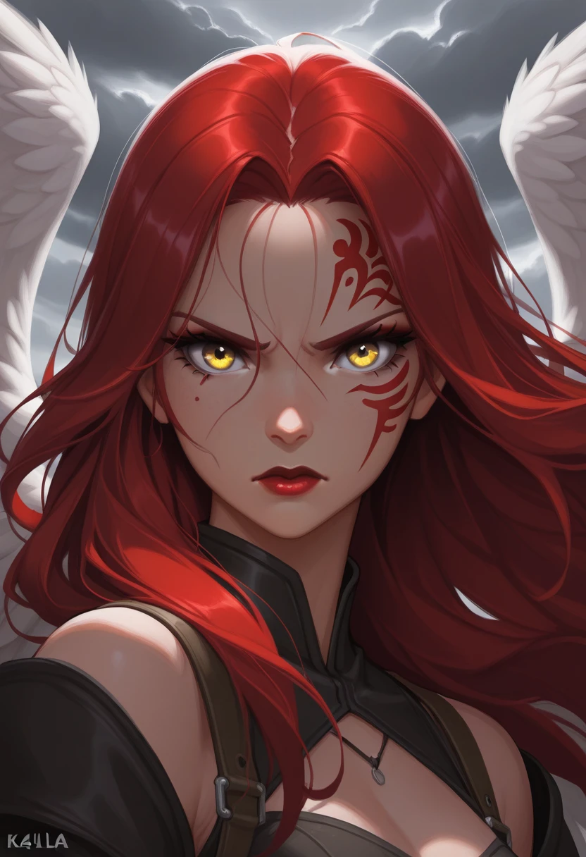 long hair, red hair, facial tattoo, leg tattoo, breastplate, dress, bracer, necklace,