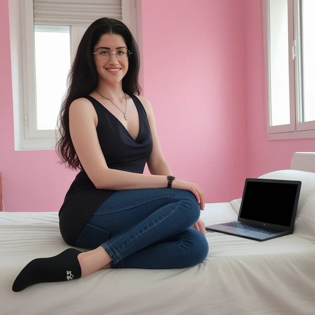 ClaraAI, brown eyes, black hair, lonh hair, smile, glasses, thick thighs, slim and wide hips, small chest