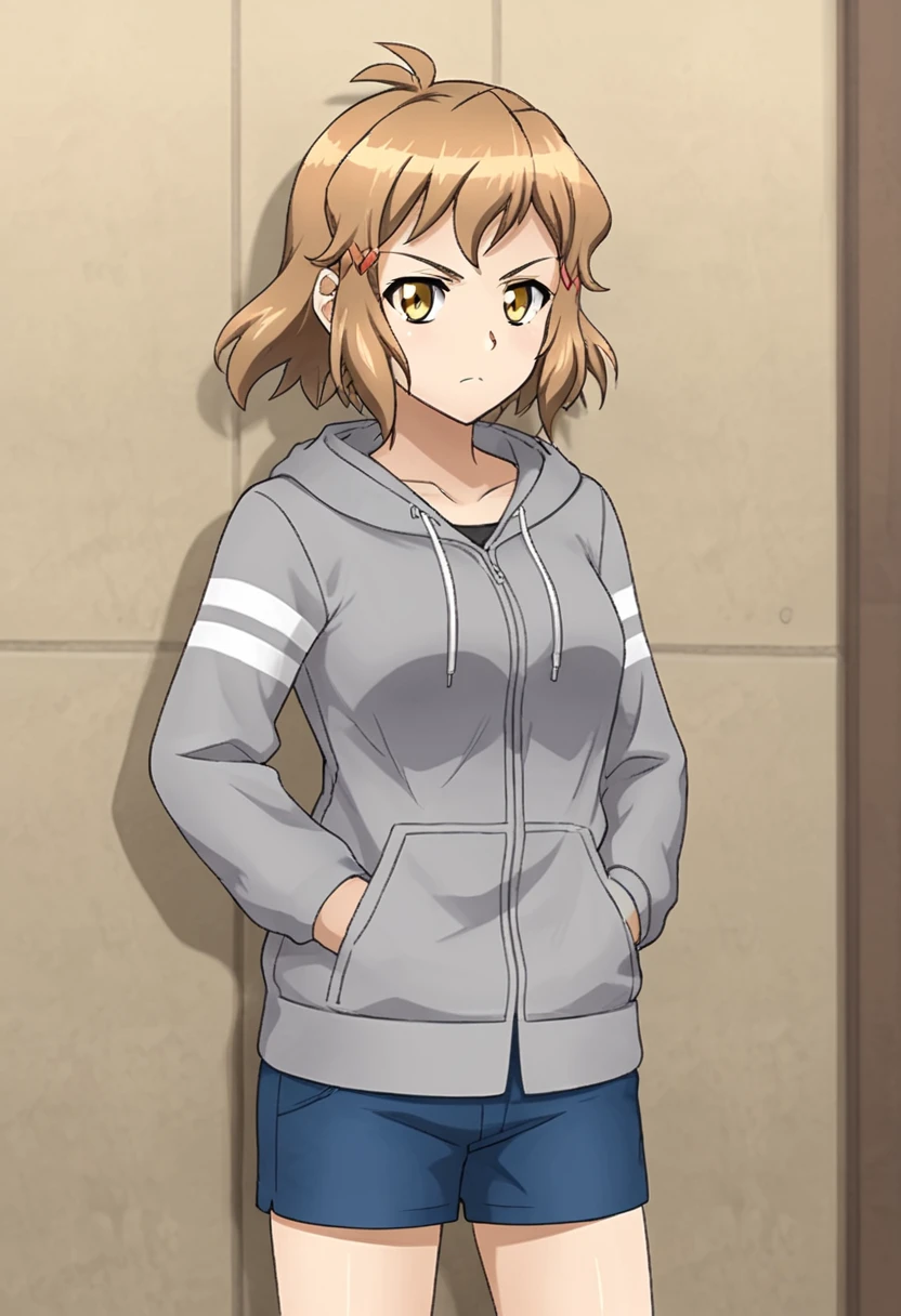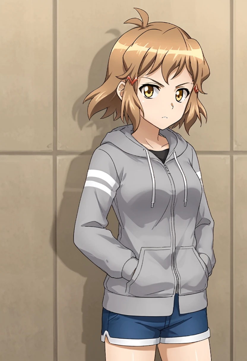 thibikianotherif, gungnirmode, brown hair, antenna hair, brown eyes, yellow eyes, short hair, hairclip, headgear, headphones, scarf, bodysuit, armor, navel, gauntlets, armored boots