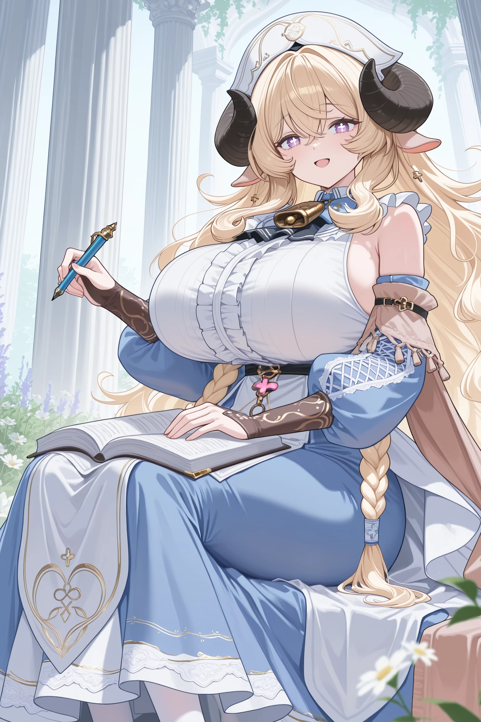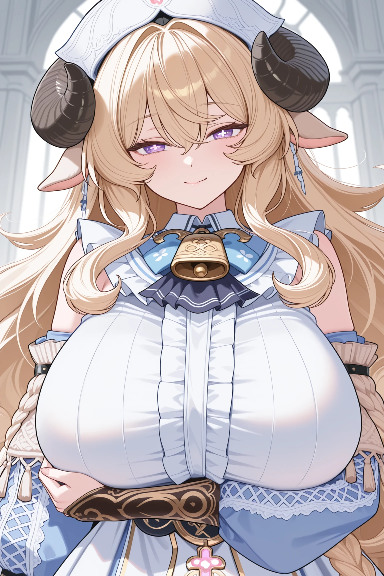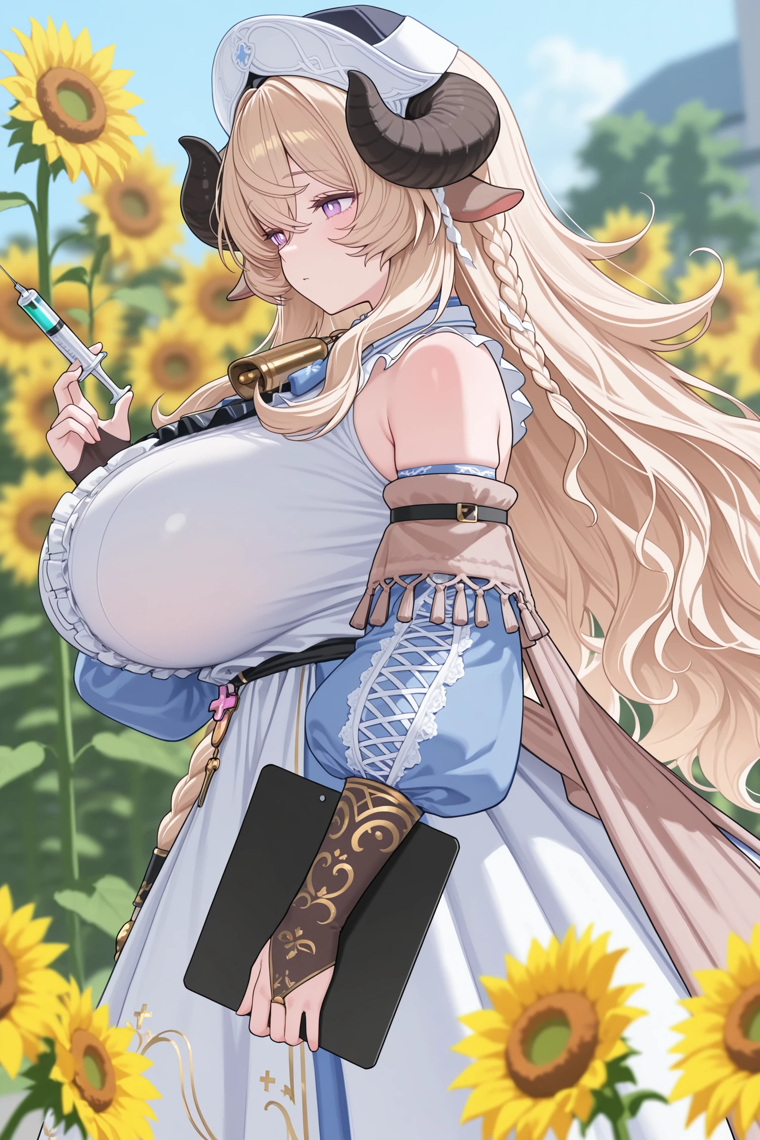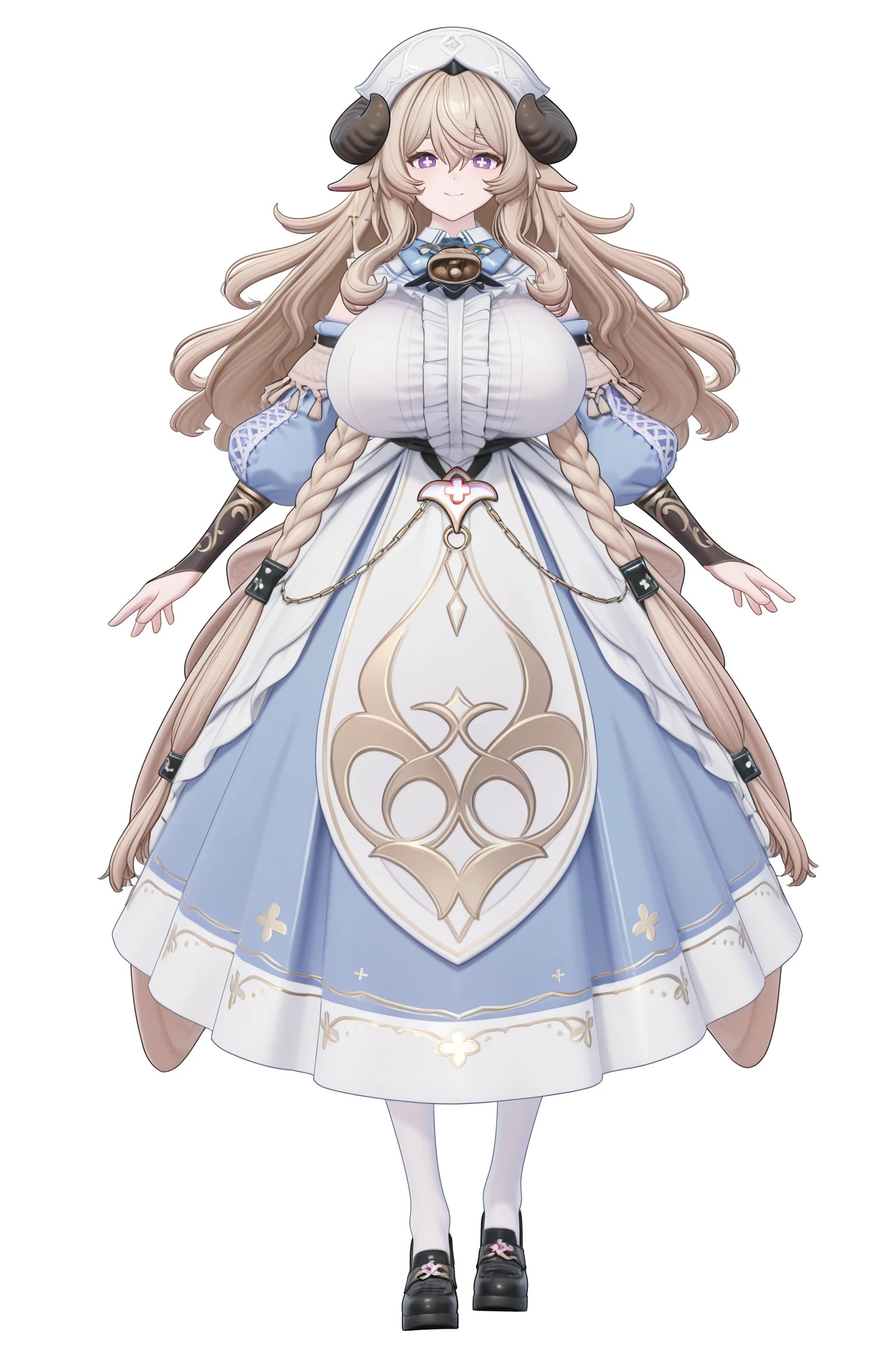 全部的tag:anais_(azur_promilia), 1girl, solo, center_frills, white ruffled top, layered_dress, blue_dress, white_print_skirt, nurse cap, halterneck, 1gril, neck_cowbell, long_hair, blonde_hair, curly_hair, crossed_bangs, curled_horns, black_horns, ears down, hair_between_eyes, purple_eyes, white pupils, ross-shaped_pupils, huge breasts, blue neck_bow, detached_sleeves, blue puffy_sleeves, blonde_long_sleeves, blonde_hanging_sleeves, blonde_braided sleeves, blonde_tasseled details, fingerless gloves,3D
