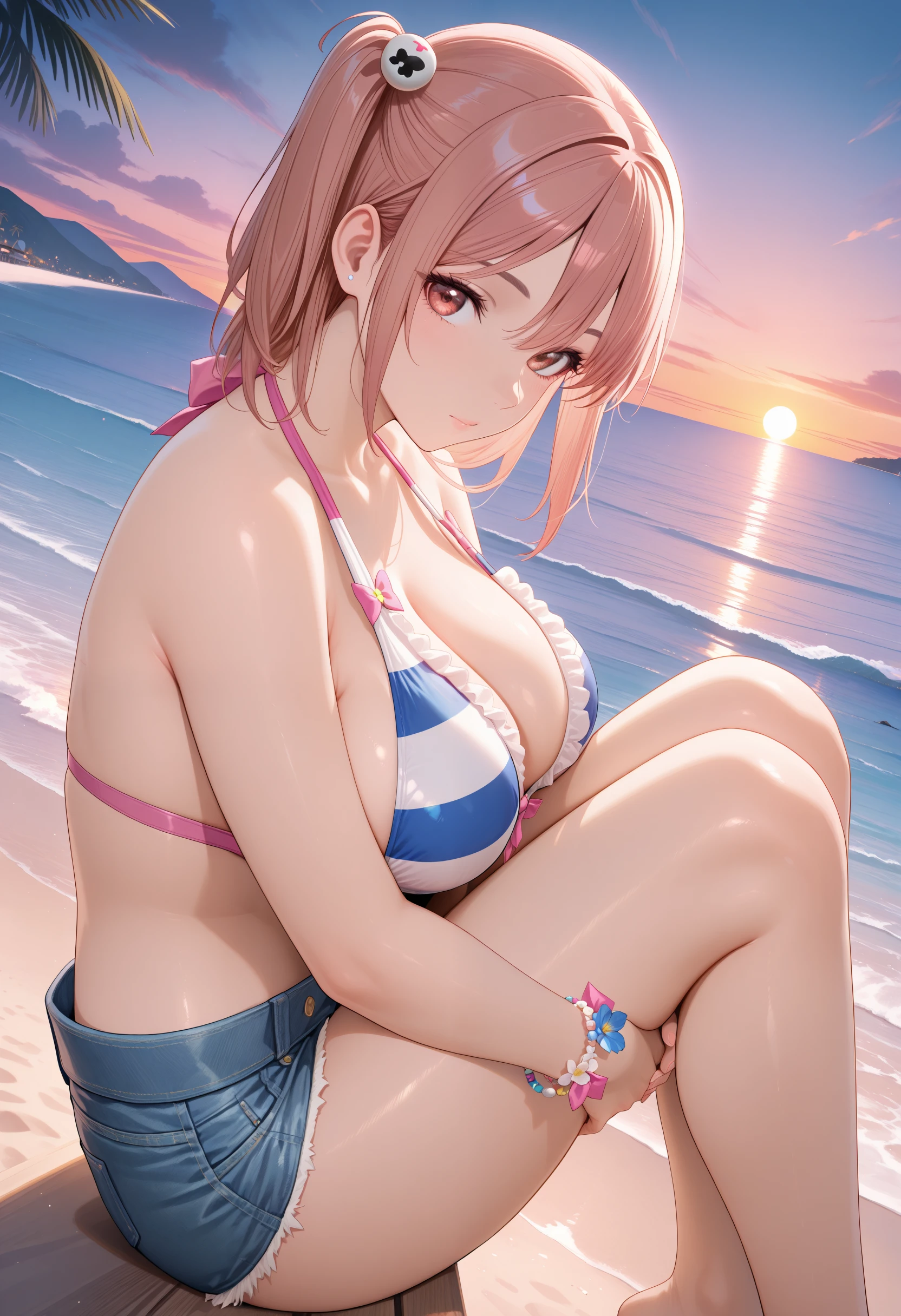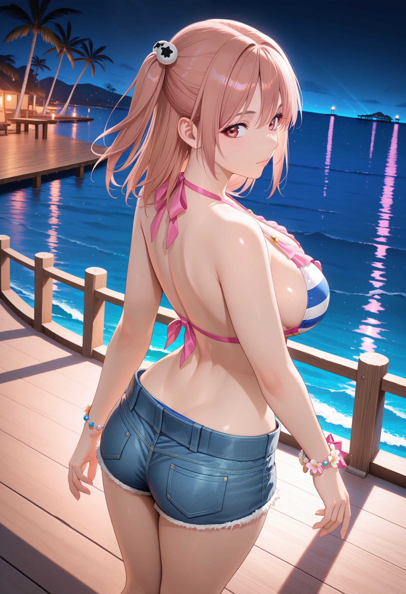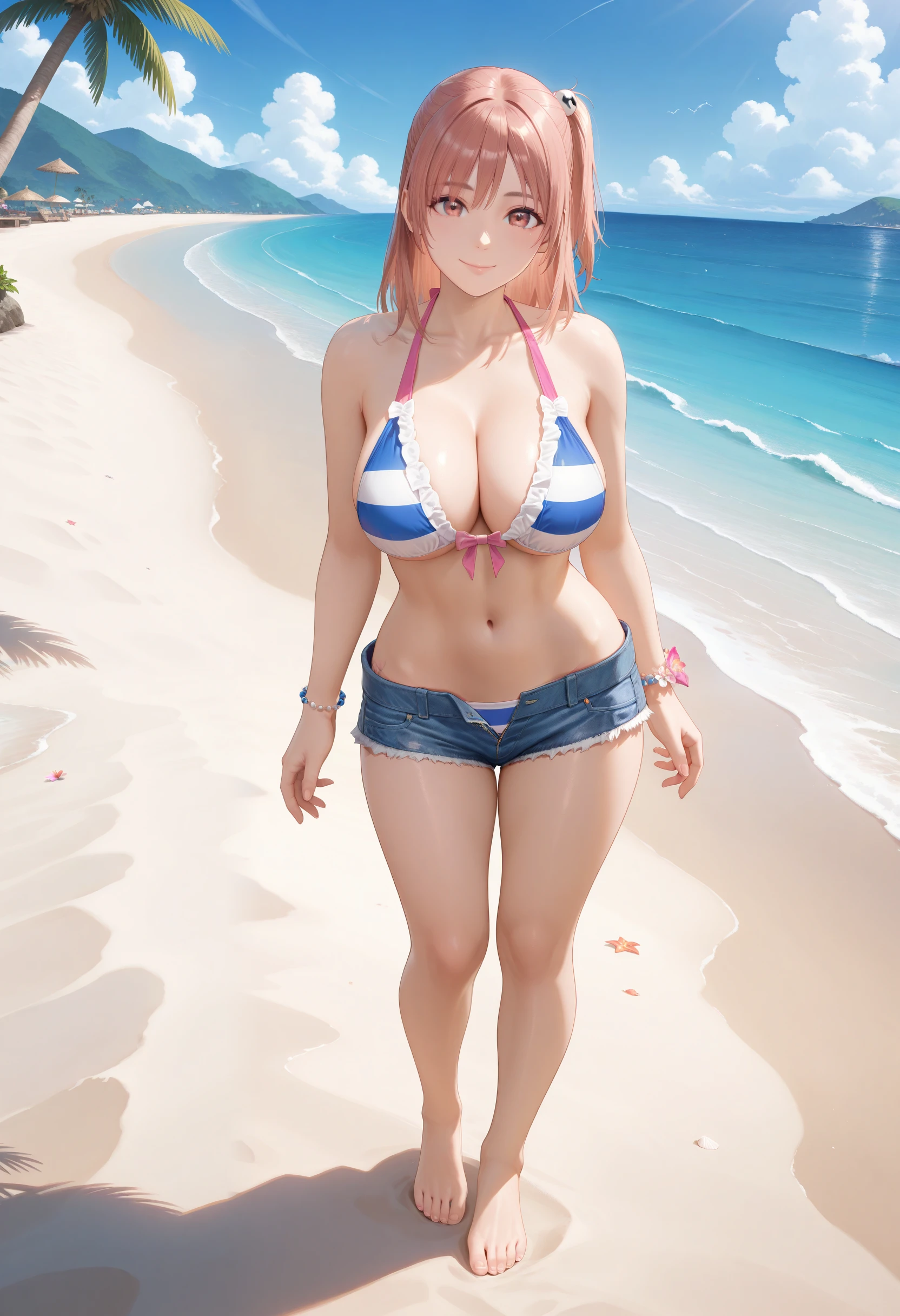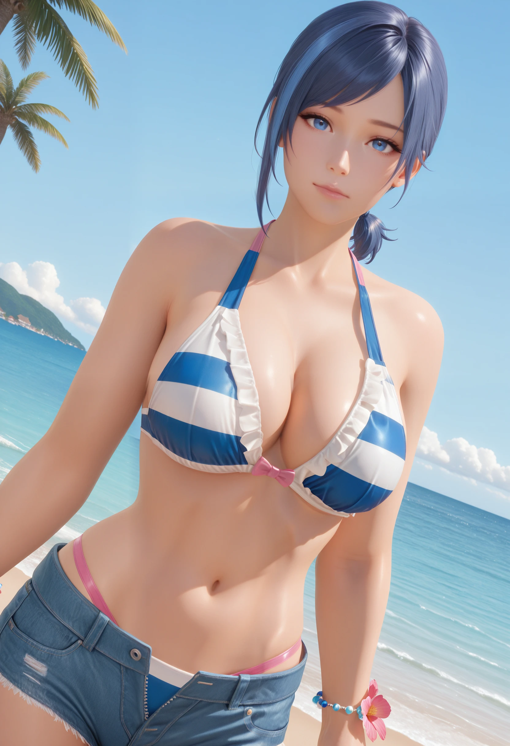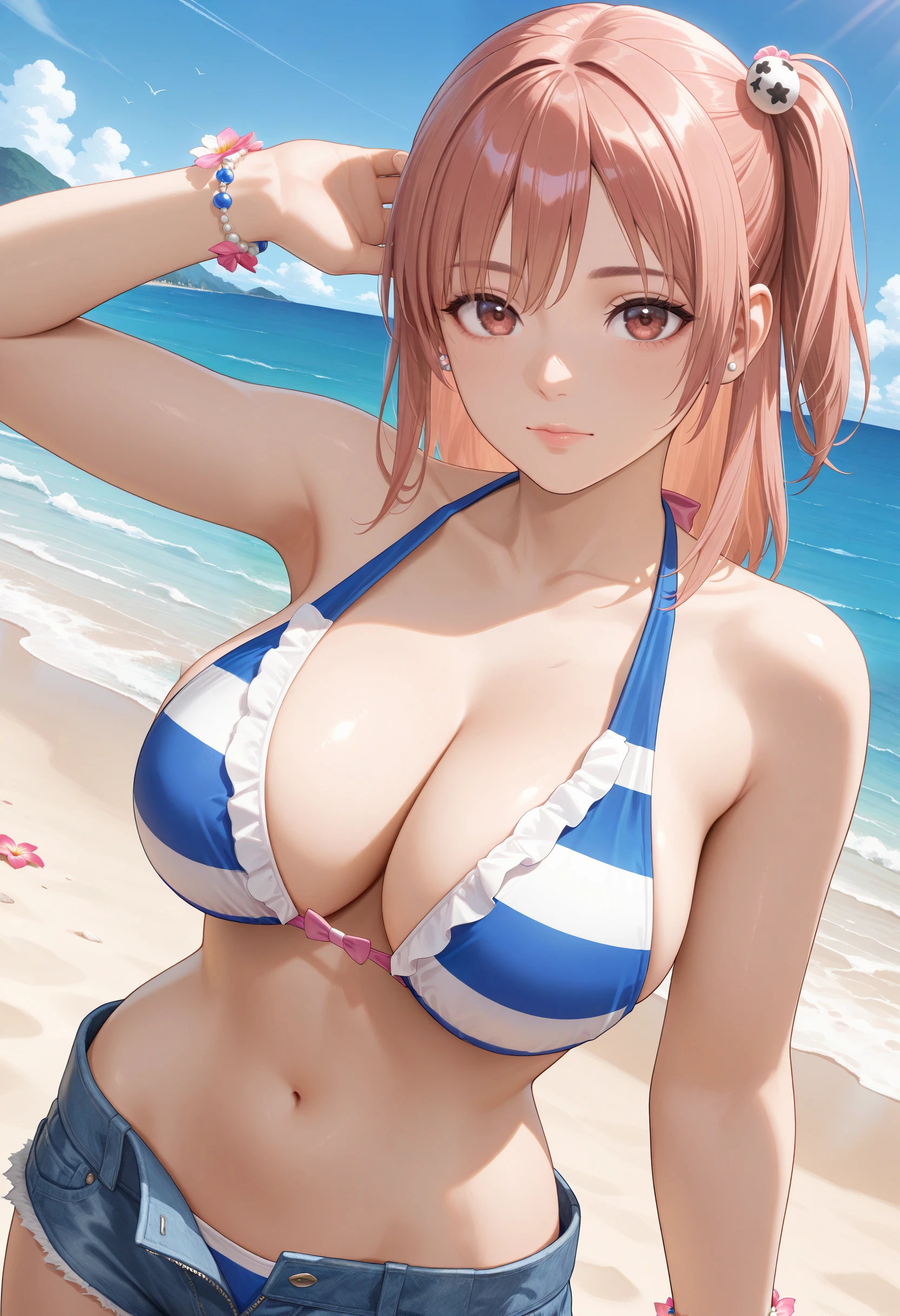 Horizon_doaxvv,bead bracelet,bikini top only,striped bikini,pink bow,frilled bikini,center ribbon bikini,ribbon halterneck,bracelet,flower bracelet,underwear,denim shorts,unzipped