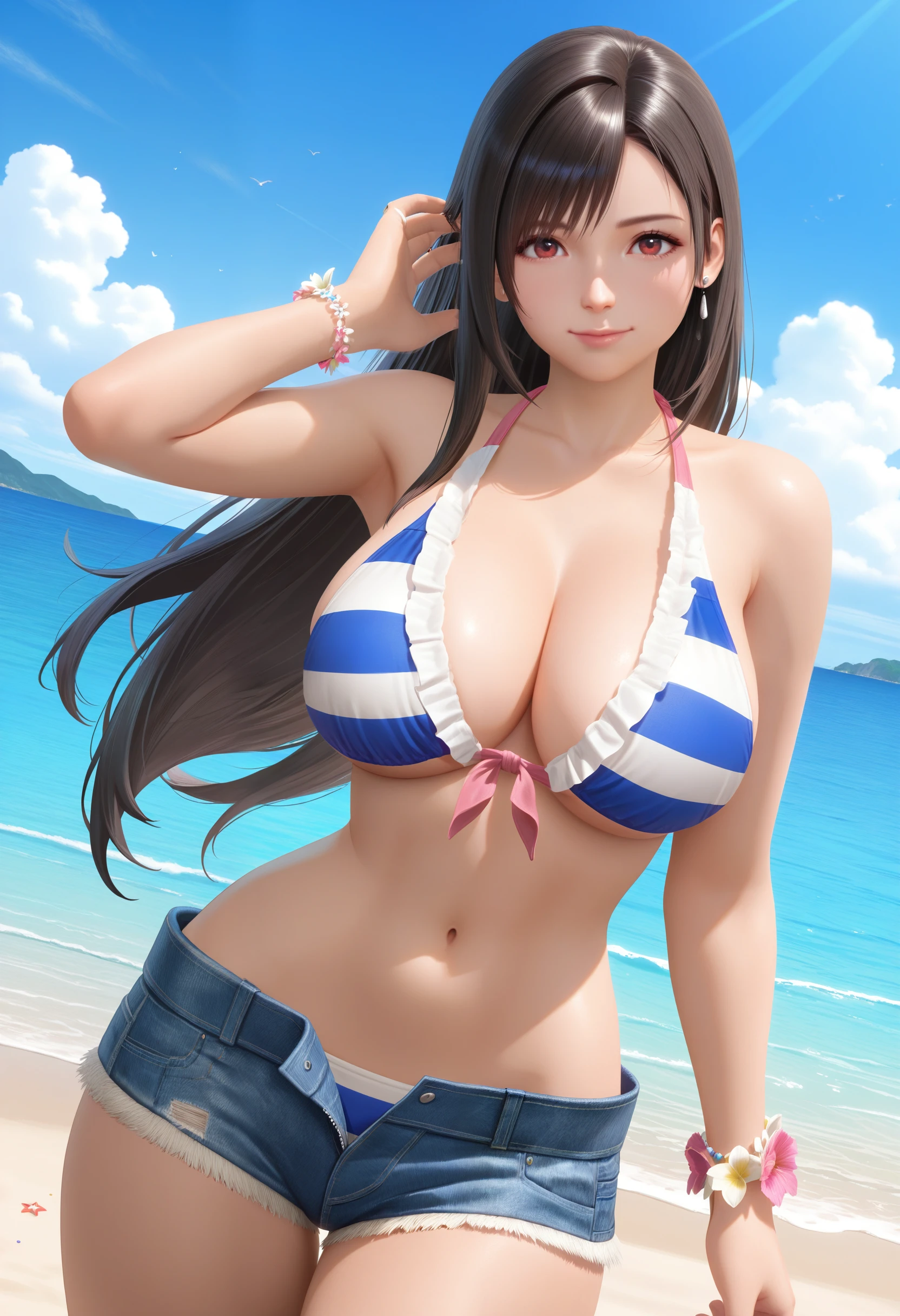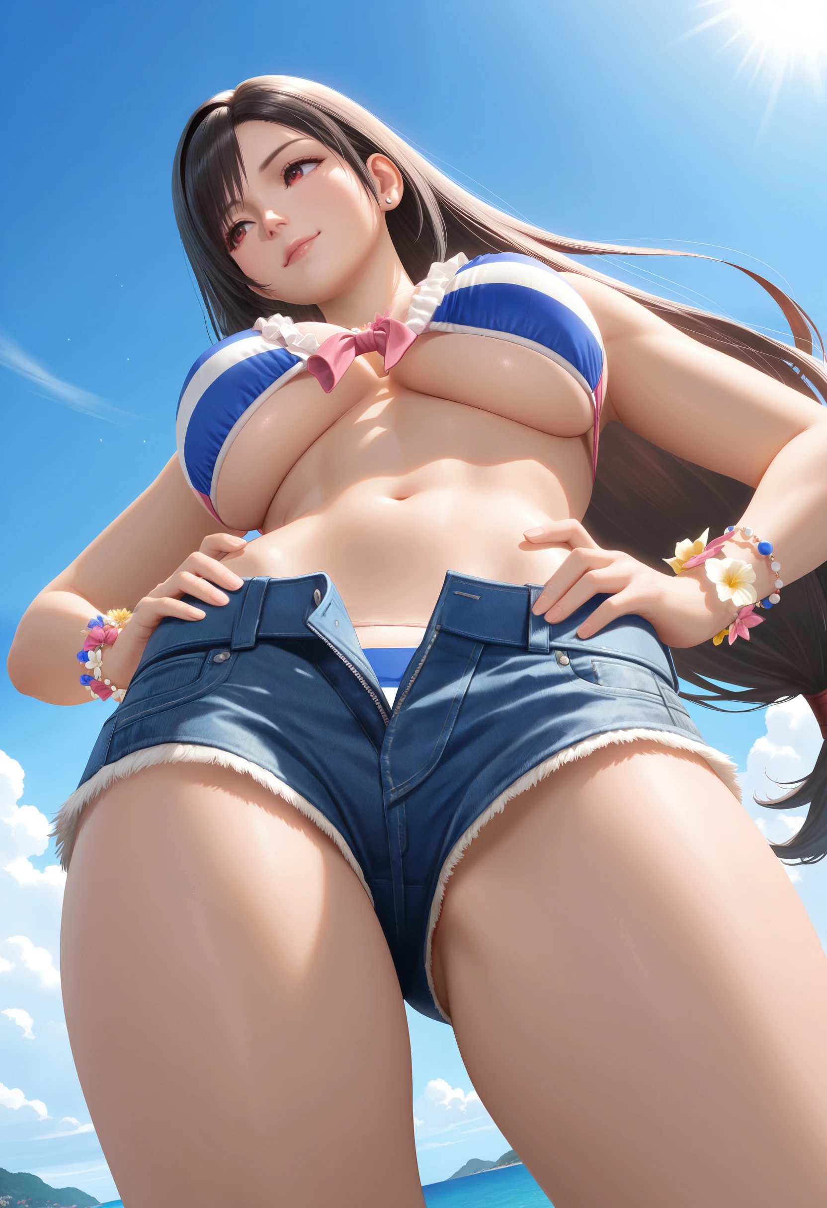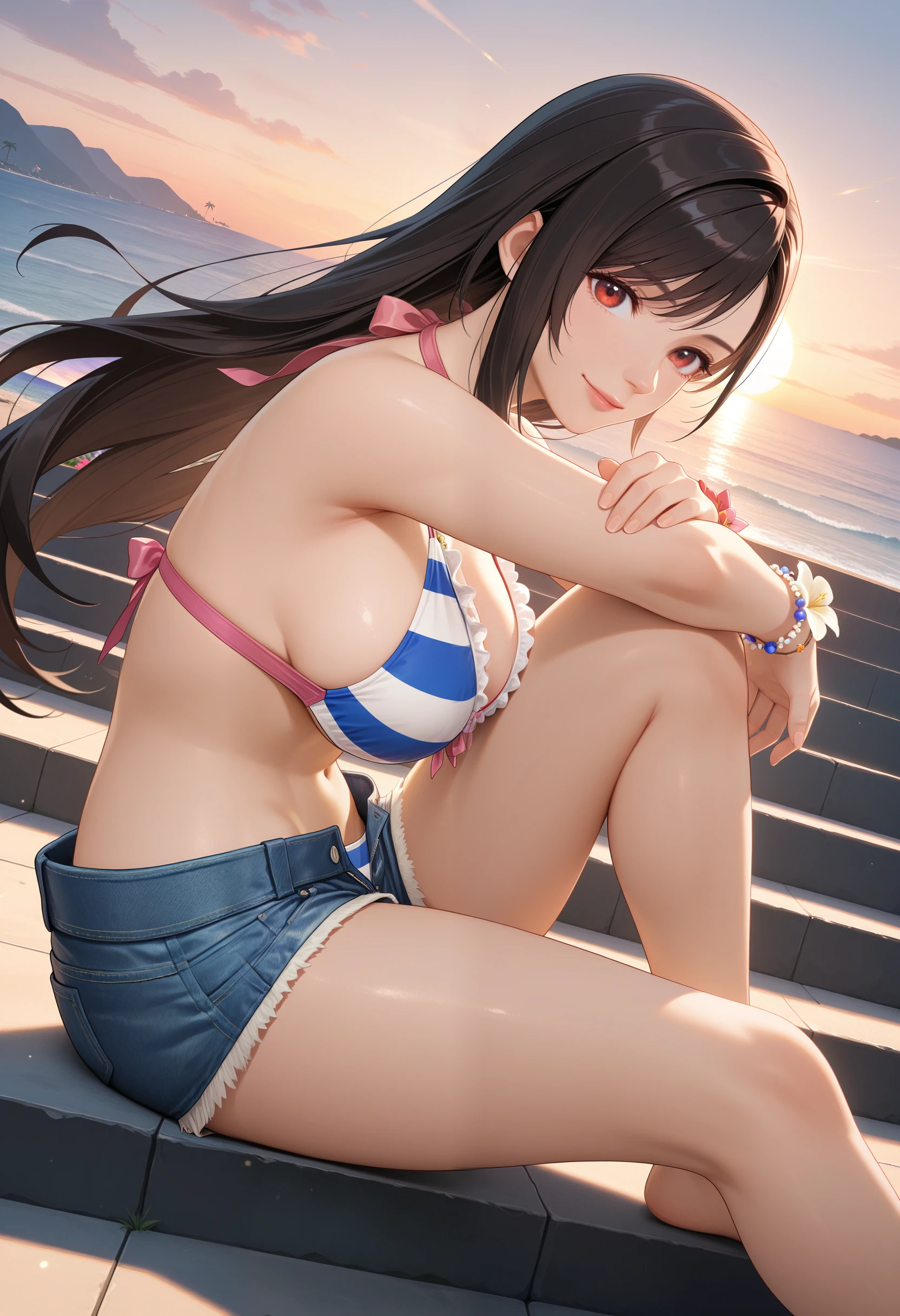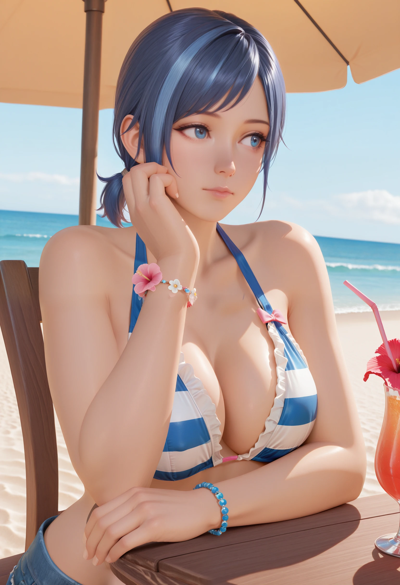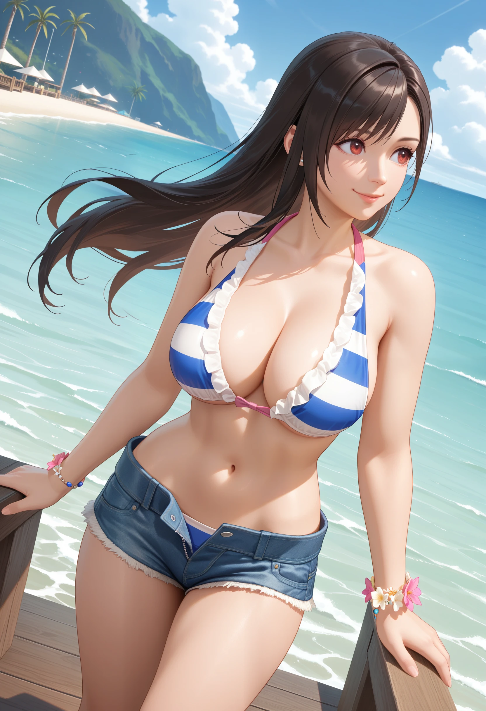 Horizon_doaxvv,bead bracelet,bikini top only,striped bikini,pink bow,frilled bikini,center ribbon bikini,ribbon halterneck,bracelet,flower bracelet,underwear,denim shorts,unzipped