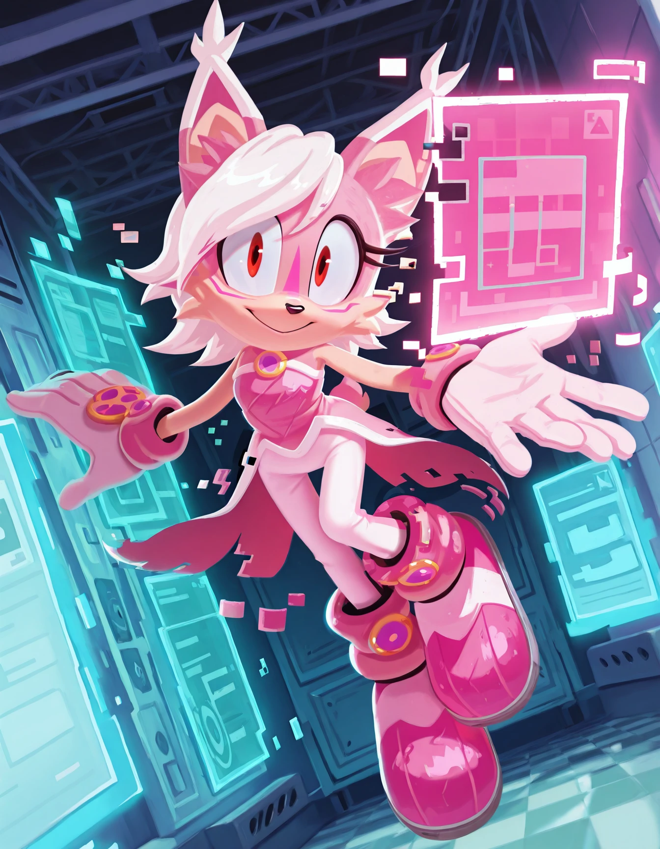 • overclocked nicole the lynx, red eyes, star brooch, white gloves, pink high-low dress, white pants, pink white boots