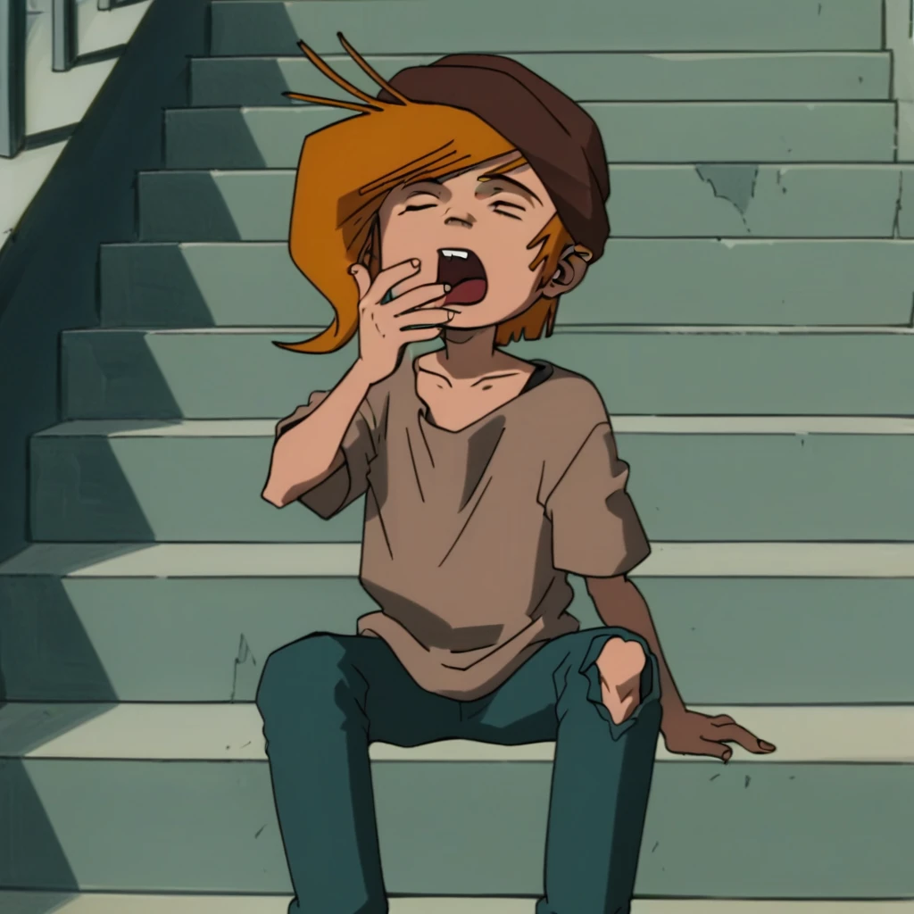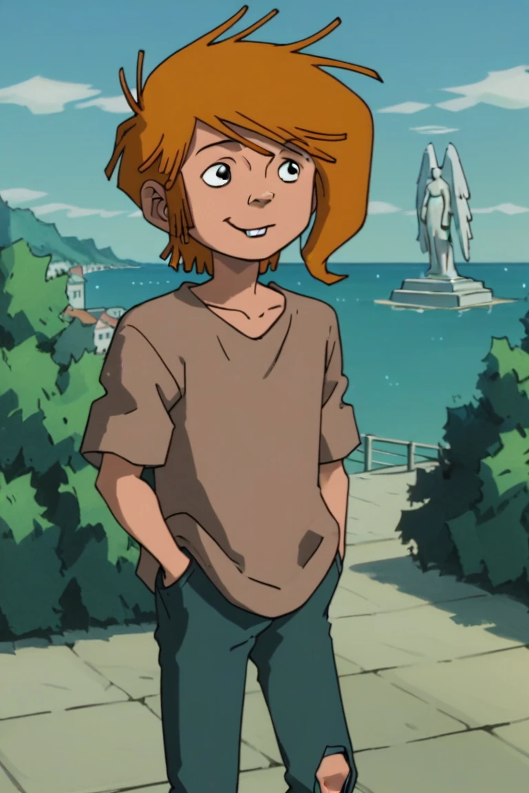 Prompts: male, orange hair, hat, black eyes, t-shirt, pants, torn pants, shoes, indoors (theater/opera box/curtains/spotlight (object)/attic ladder/ropes/red carpet), indoors (boiler room/door/bookshelf/books/grate), indoors (laboratory/machinery/pipes), outdoors (city/sky/cloud/building/window/wall/brick wall/crate/stairs/tree/cityscape/ocean/horizon/angel statue)