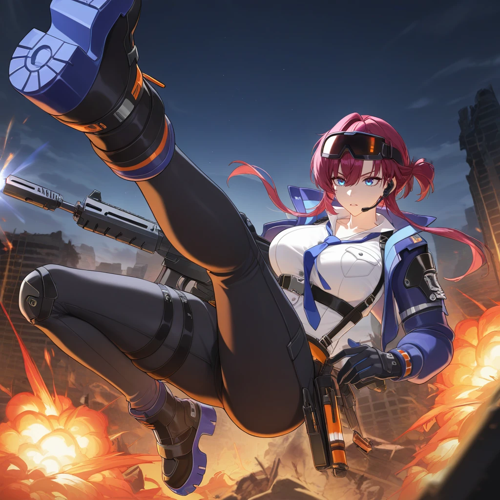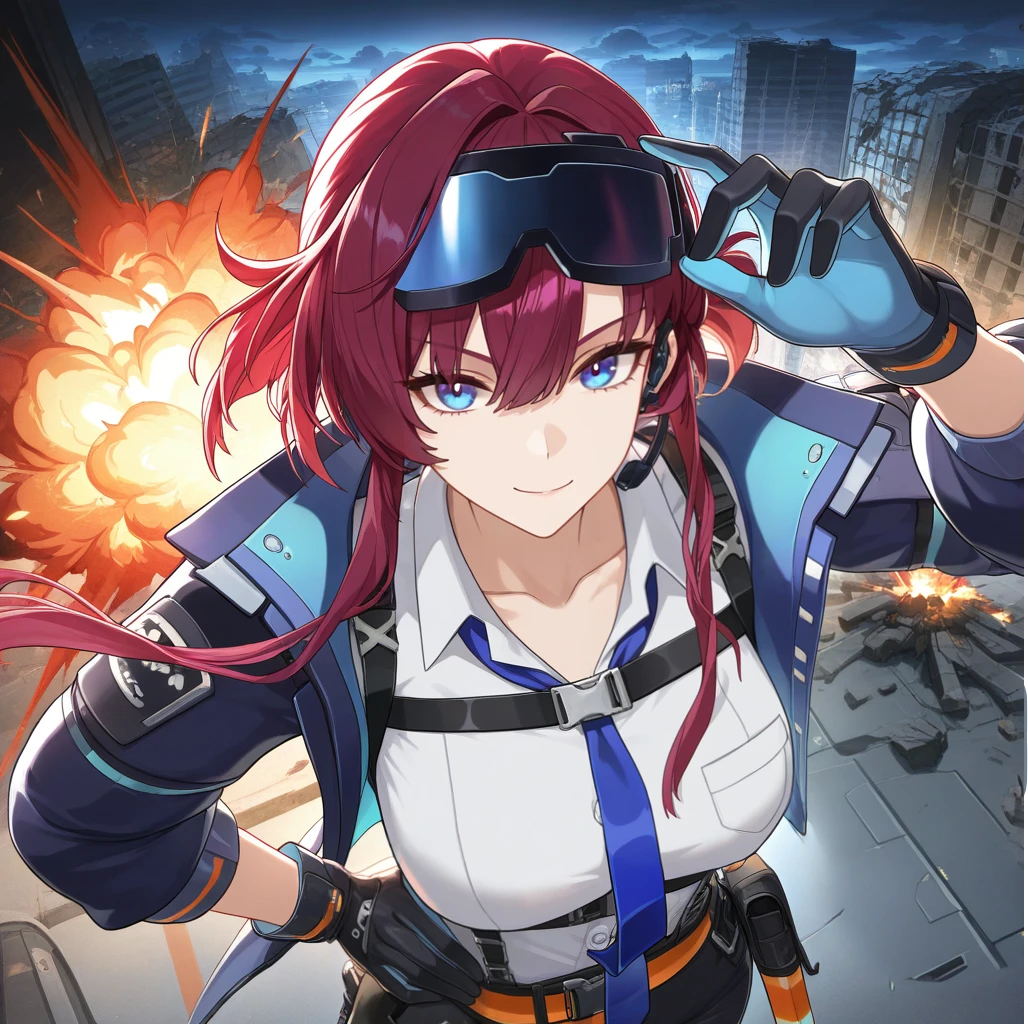 LeonaStrv, Lna_Def, short hair with long locks, red hair, purple hair, blue eyes, ski goggles, tinted eyewear, goggles on head, police uniform, dress shirt, open collar, collarbone, snap-fit buckle, shirt tucked-in, blue necktie, chest harness, chest strap, white shirt, breast pocket, underbust, black belt, suspenders, orange belt, buttons, black pants, pants, cropped jacket, open jacket, blue jacket, puffy long sleeves, blue sleeves, orange trim, pouch, two-sided gloves, black gloves, headset, kneepads, thigh strap, black footwear, ankle boots,Adventurer Outfit: